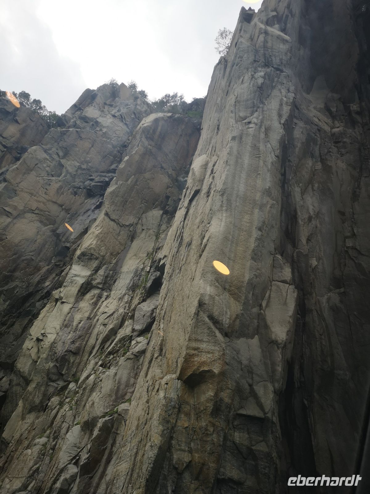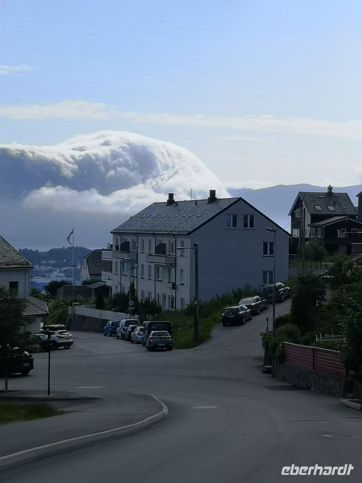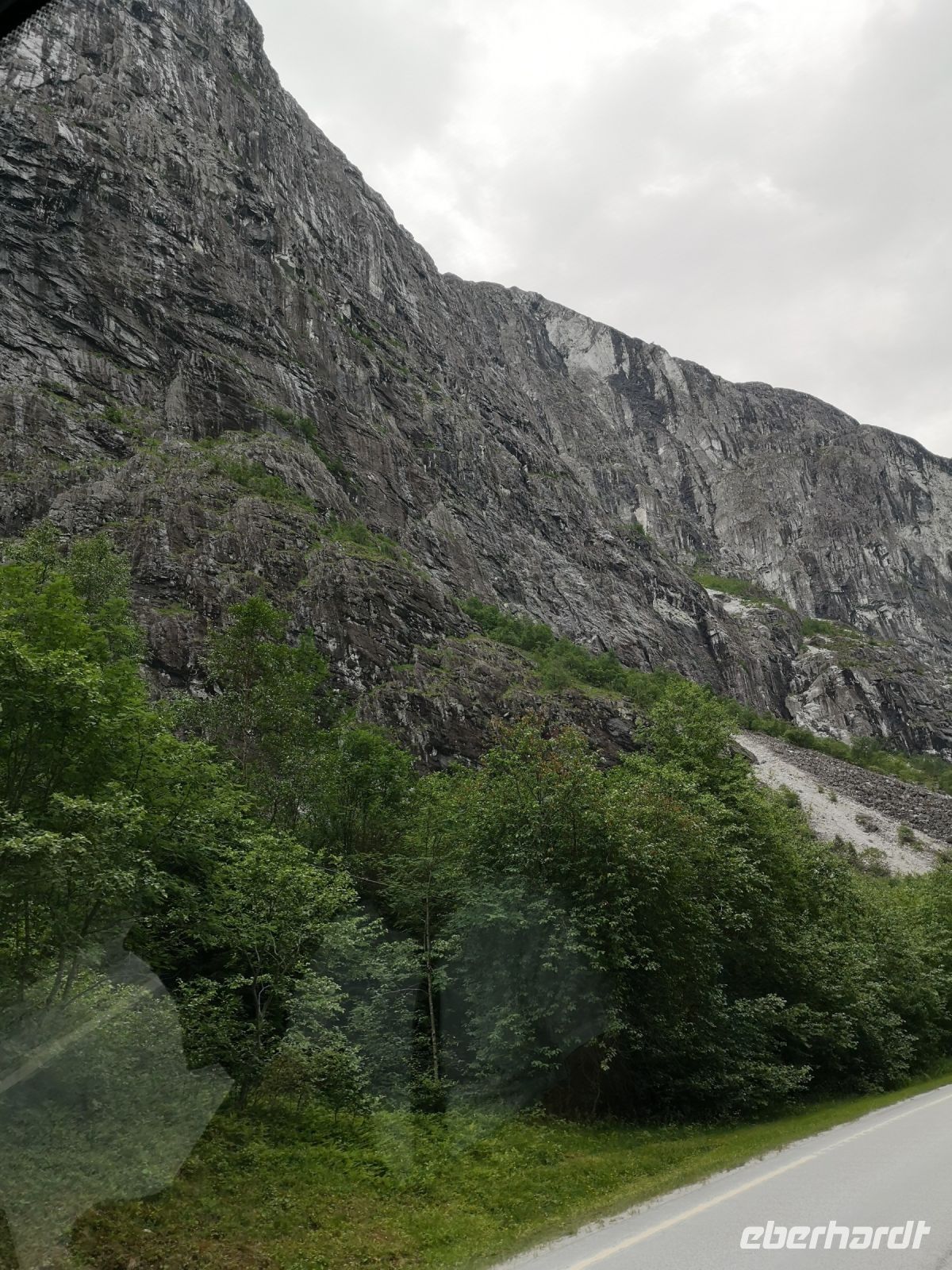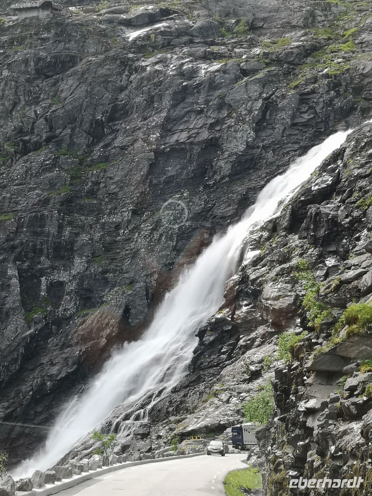 Und wieder die nächsten 11 Haarnadelkurven – diesmal die Trollstigen bergrunter. Die Bergwelt hüllte sich teilweise in Nebel, von den 3 Gipfeln König, Königin und Bischof zeigt sich nur der letzte in voller Pracht.