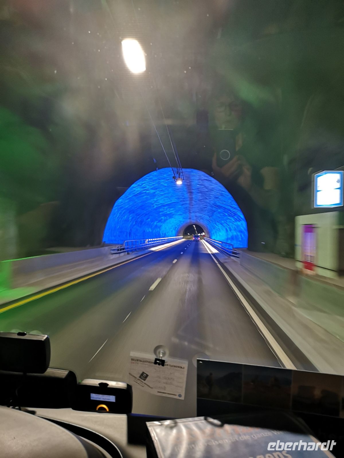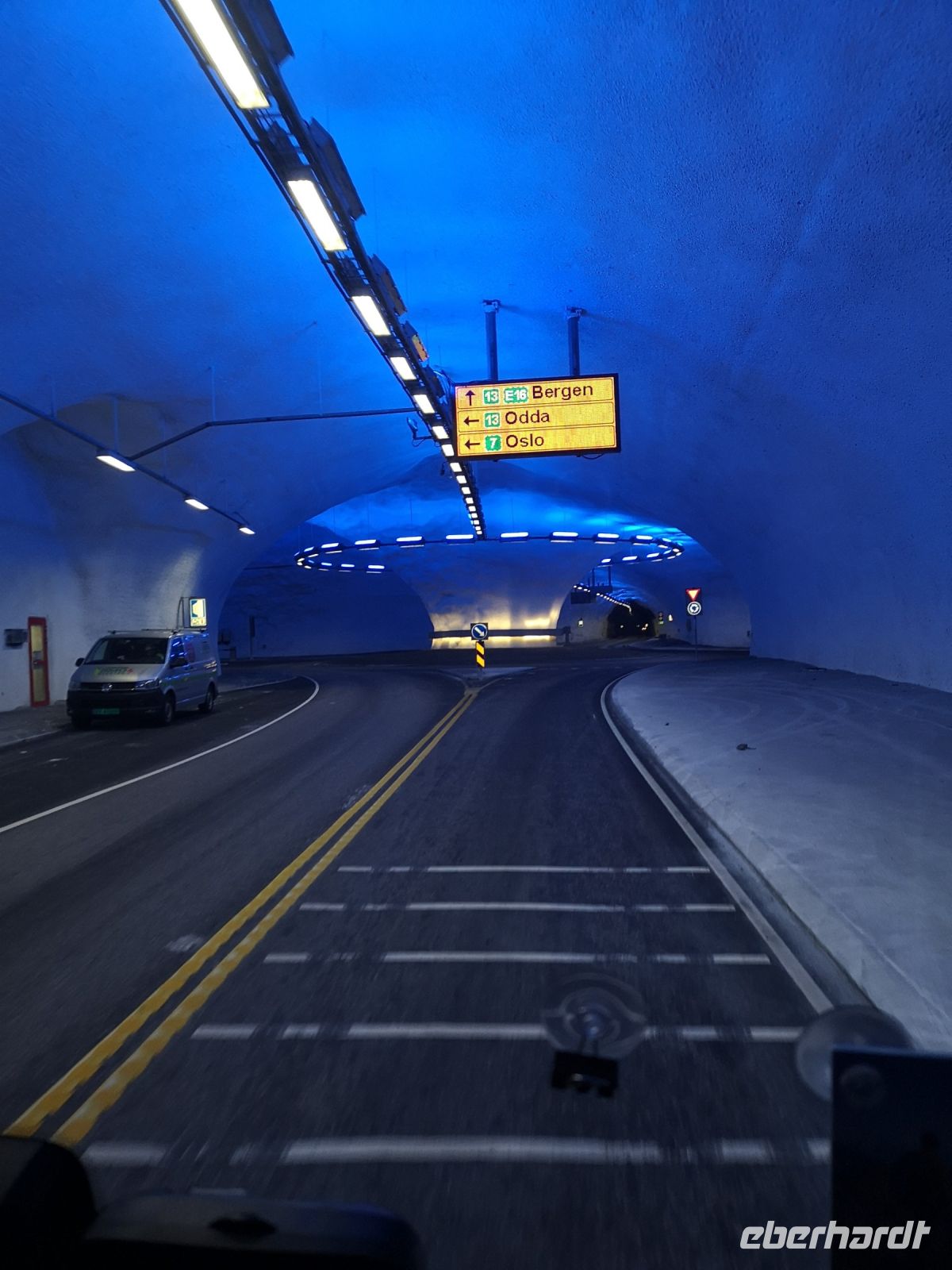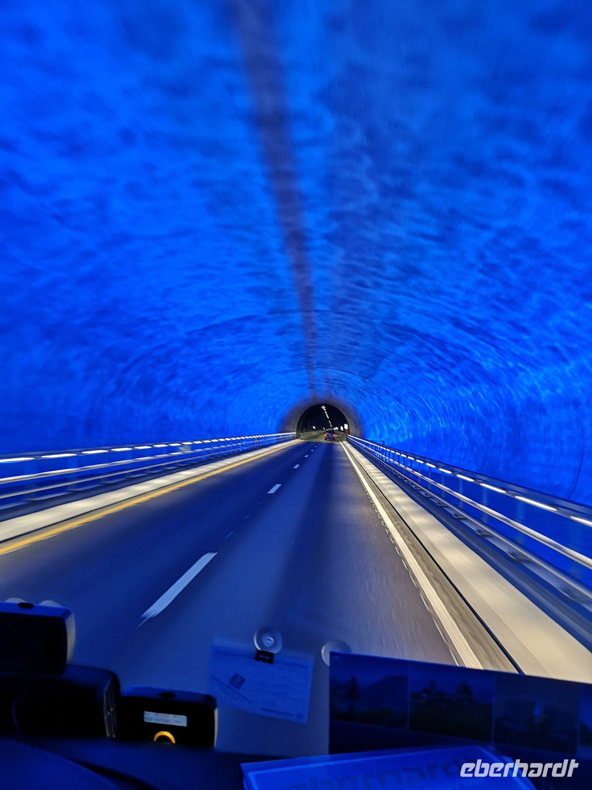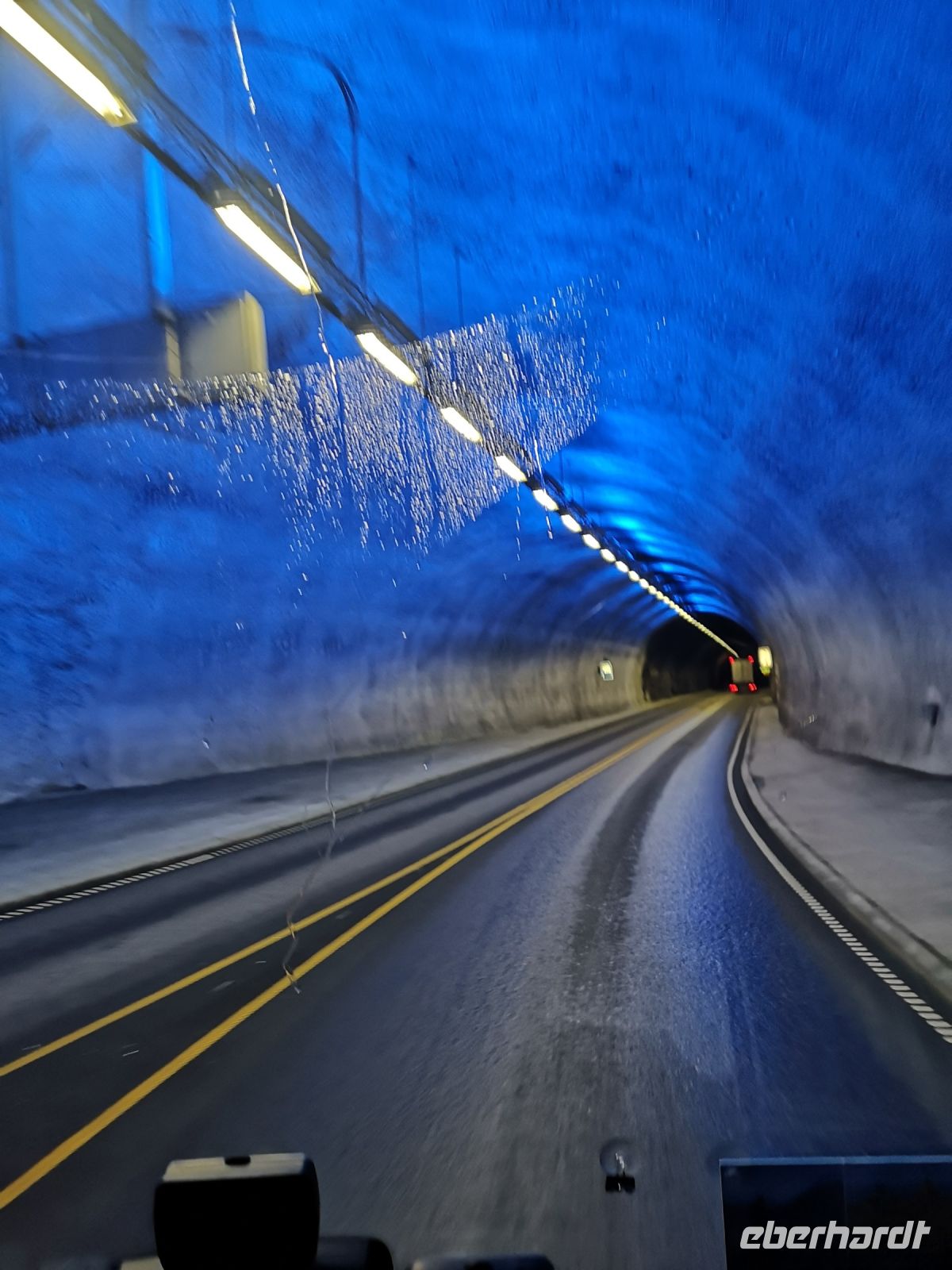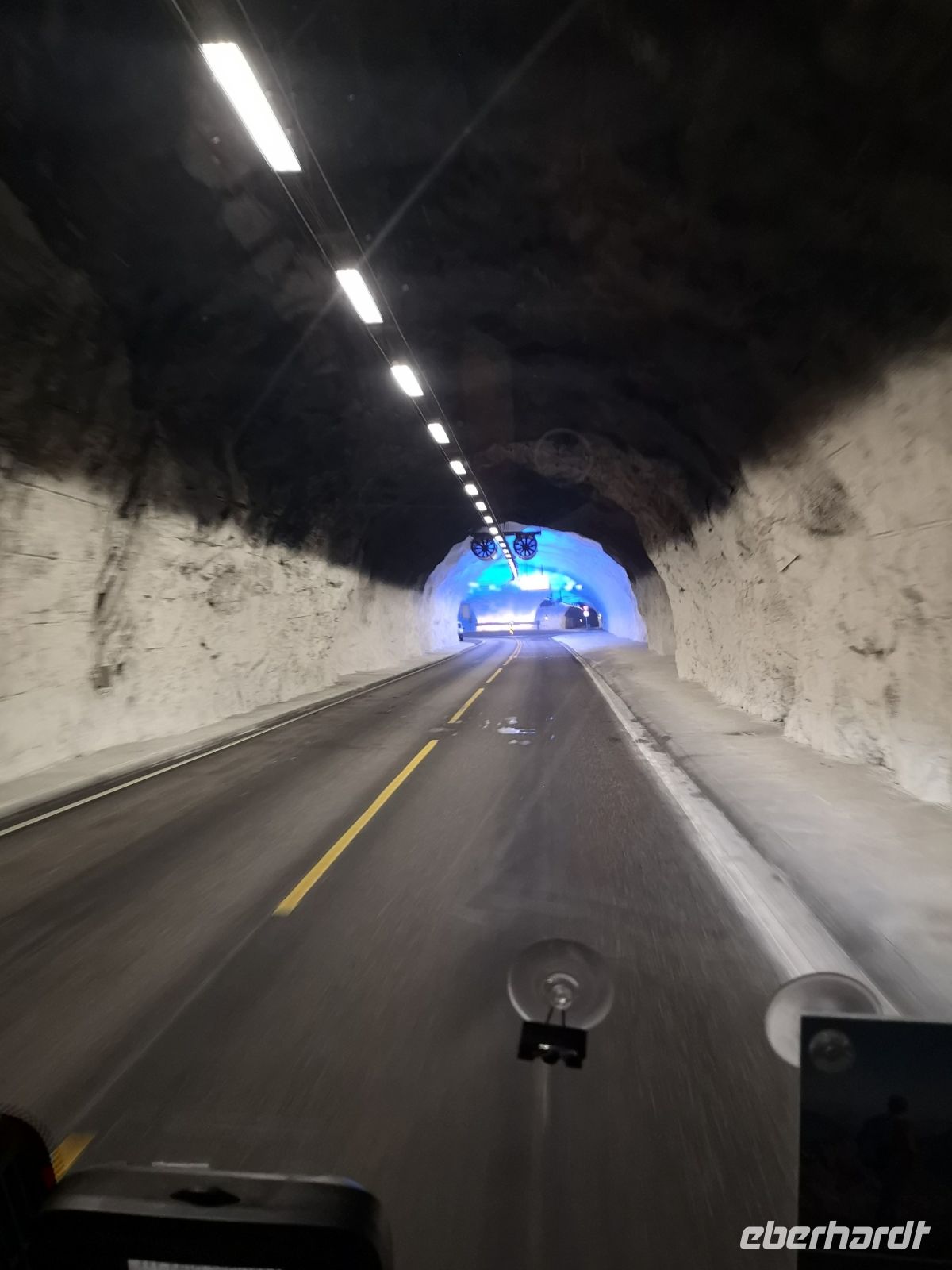 Schon gleich zum Beginn des Tages brachen wir den ersten Rekord: wir fuhren durch den längsten und tiefsten Unterwassertunnel der Welt. Mit über 14 km Länge und 287 m unter dem Meeresspiegel ist der Tunnel eine supertechnische Errungenschaft Norwegens. Die mit Blaulicht ausgestatteten Teile des Tunnels sorgen für eine Entspannung bei der Durchfahrt.