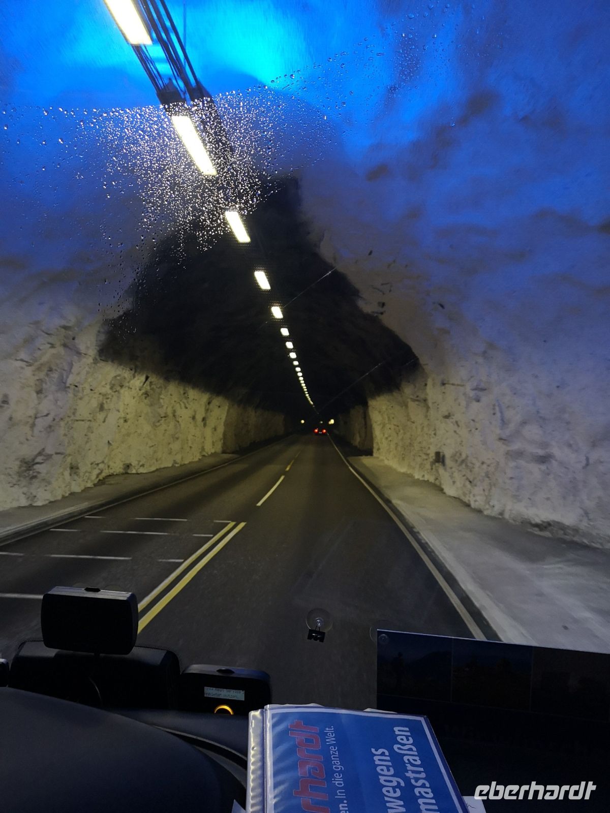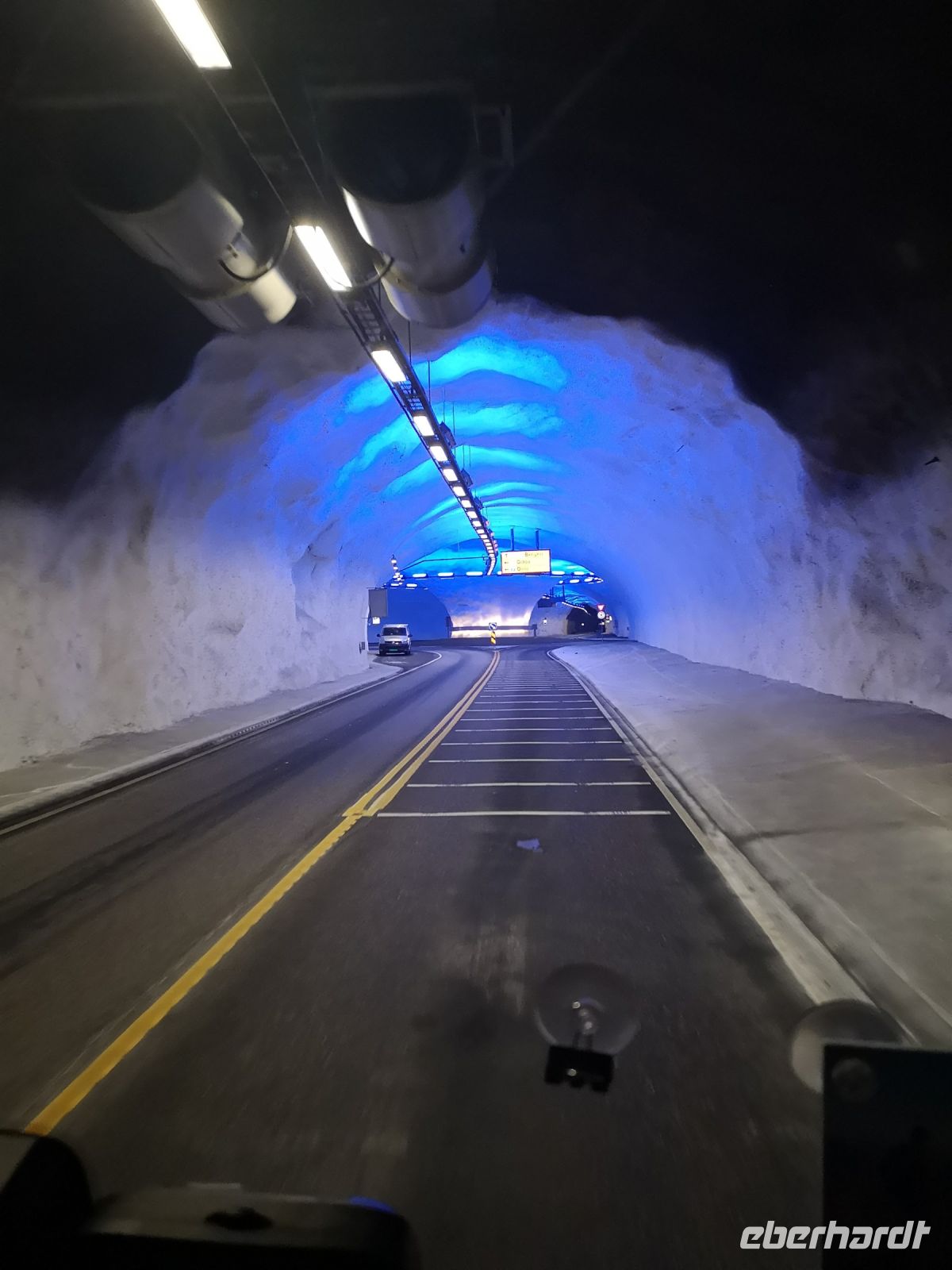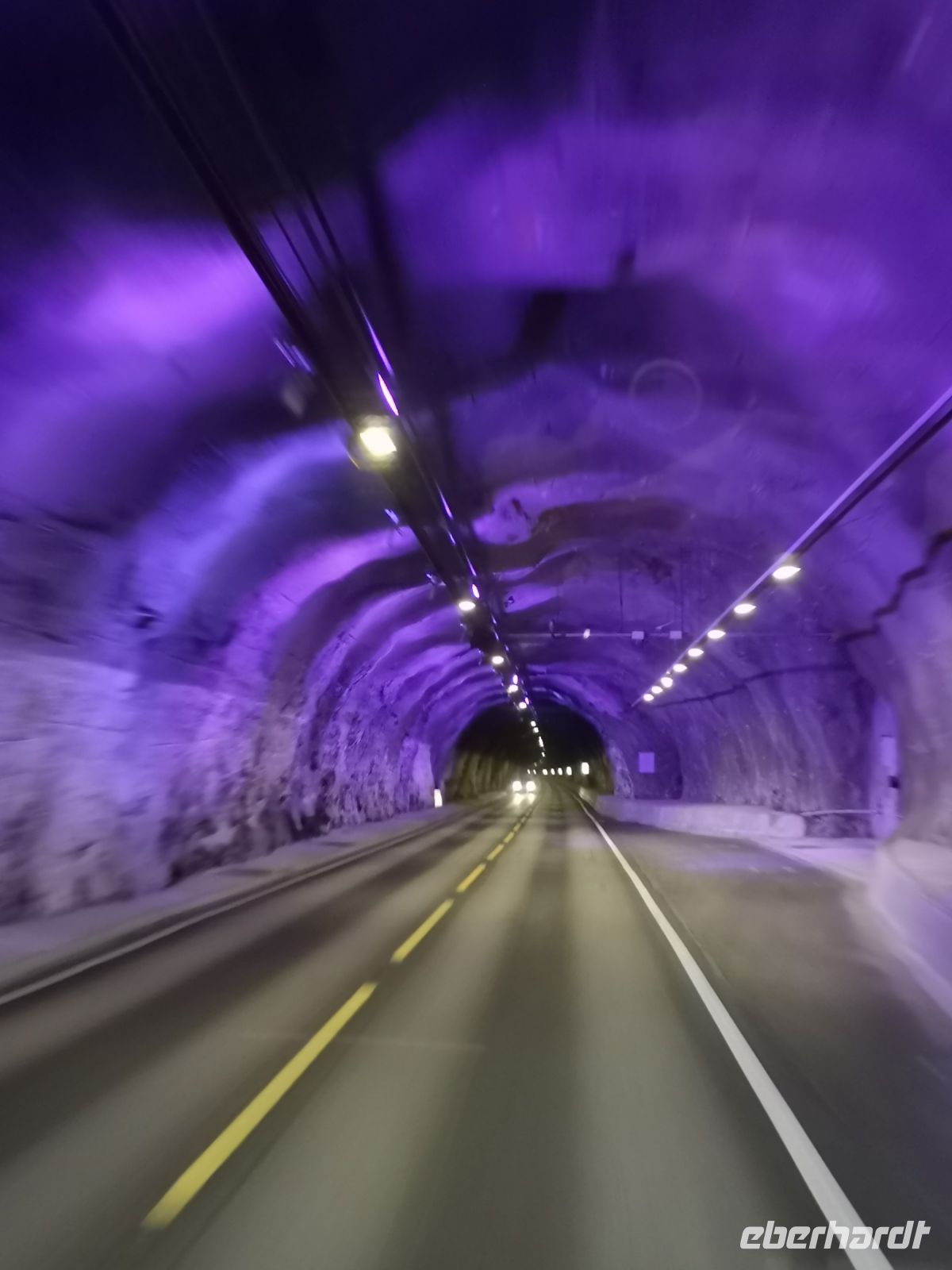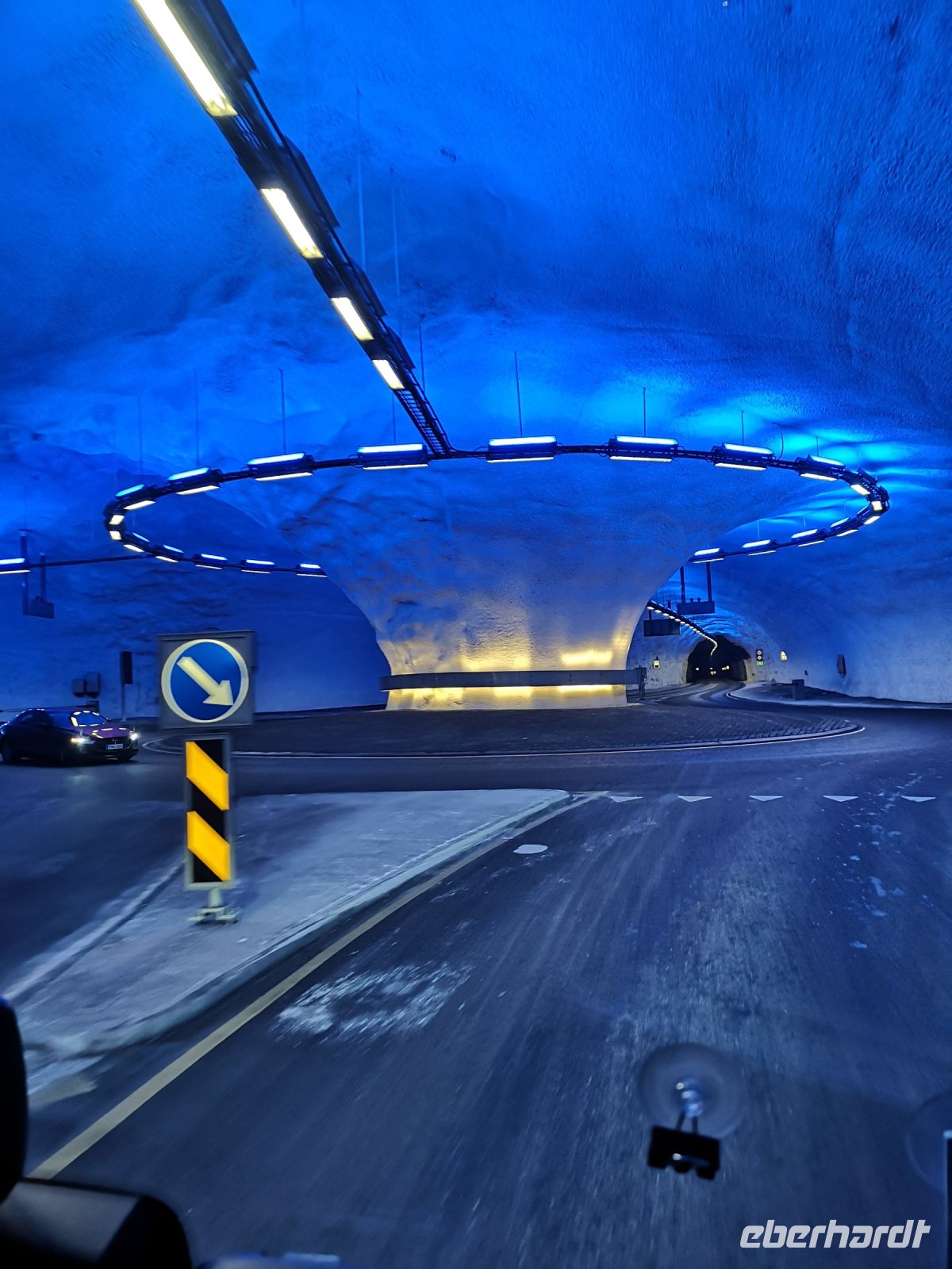 Schon gleich zum Beginn des Tages brachen wir den ersten Rekord: wir fuhren durch den längsten und tiefsten Unterwassertunnel der Welt. Mit über 14 km Länge und 287 m unter dem Meeresspiegel ist der Tunnel eine supertechnische Errungenschaft Norwegens. Die mit Blaulicht ausgestatteten Teile des Tunnels sorgen für eine Entspannung bei der Durchfahrt.