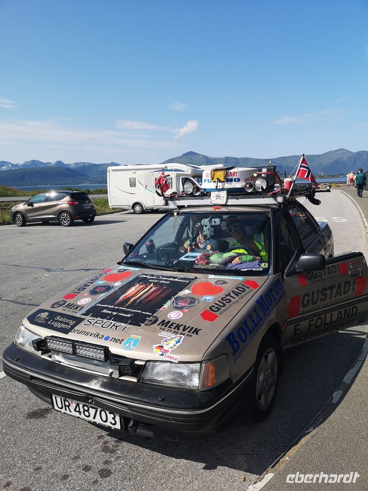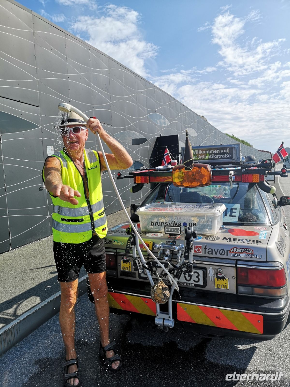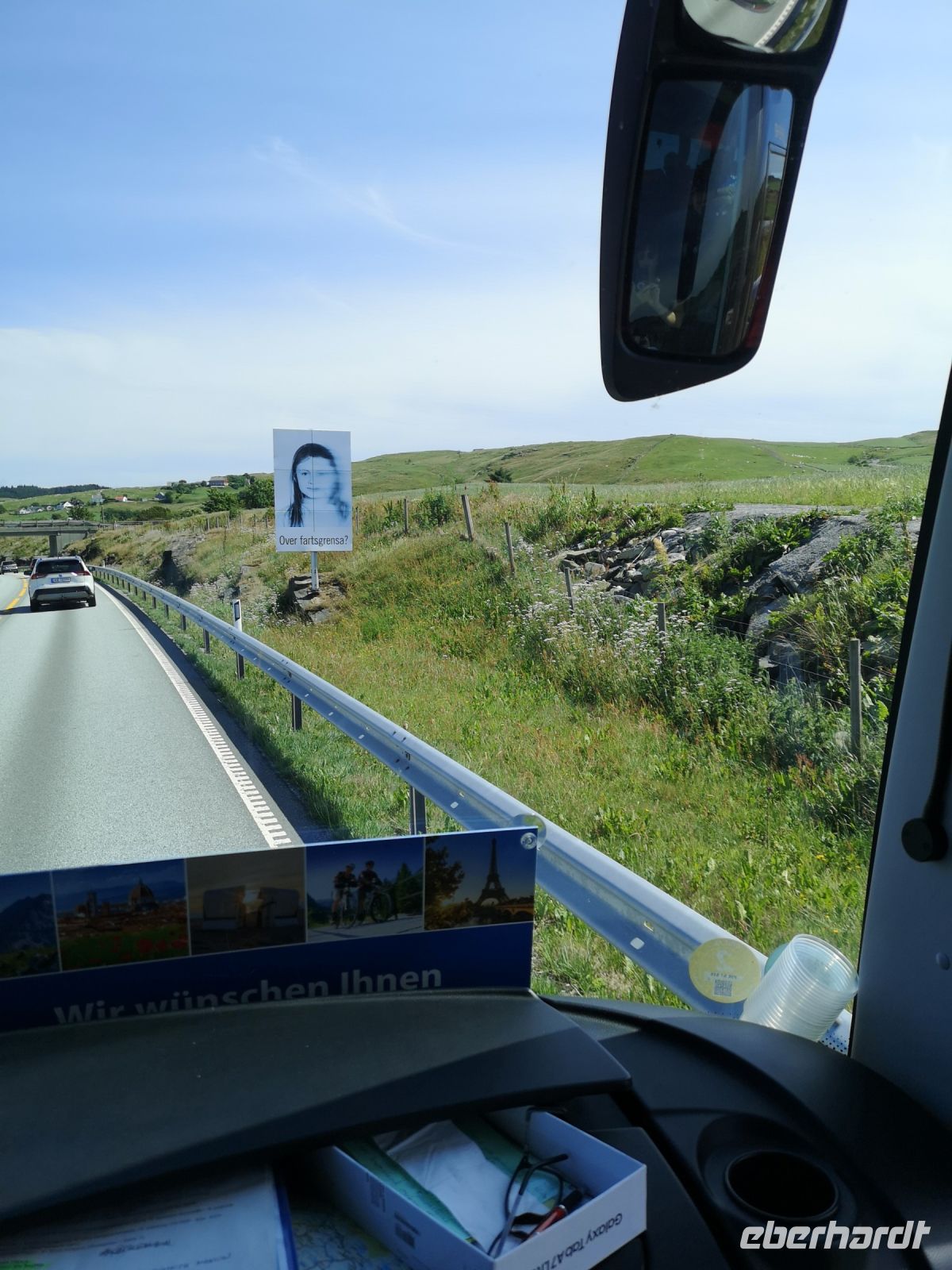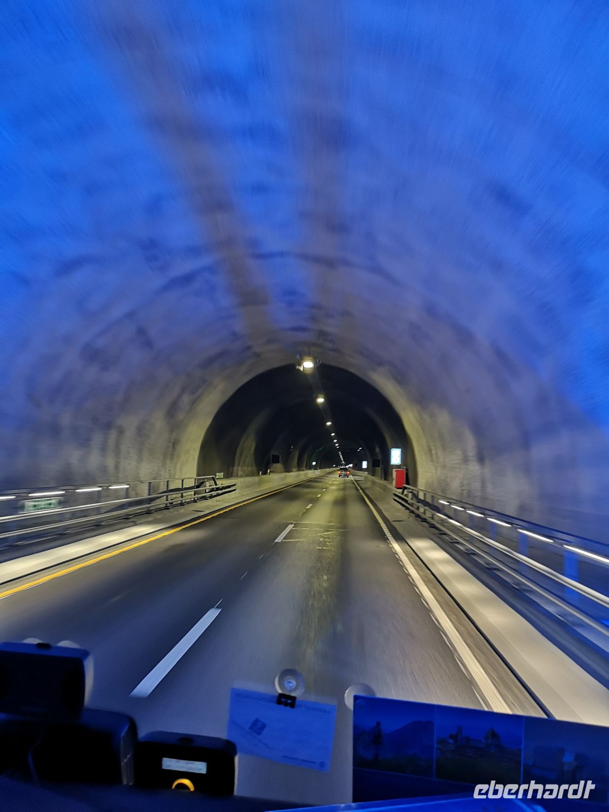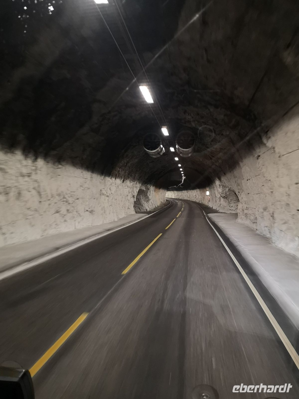 Schon gleich zum Beginn des Tages brachen wir den ersten Rekord: wir fuhren durch den längsten und tiefsten Unterwassertunnel der Welt. Mit über 14 km Länge und 287 m unter dem Meeresspiegel ist der Tunnel eine supertechnische Errungenschaft Norwegens. Die mit Blaulicht ausgestatteten Teile des Tunnels sorgen für eine Entspannung bei der Durchfahrt.