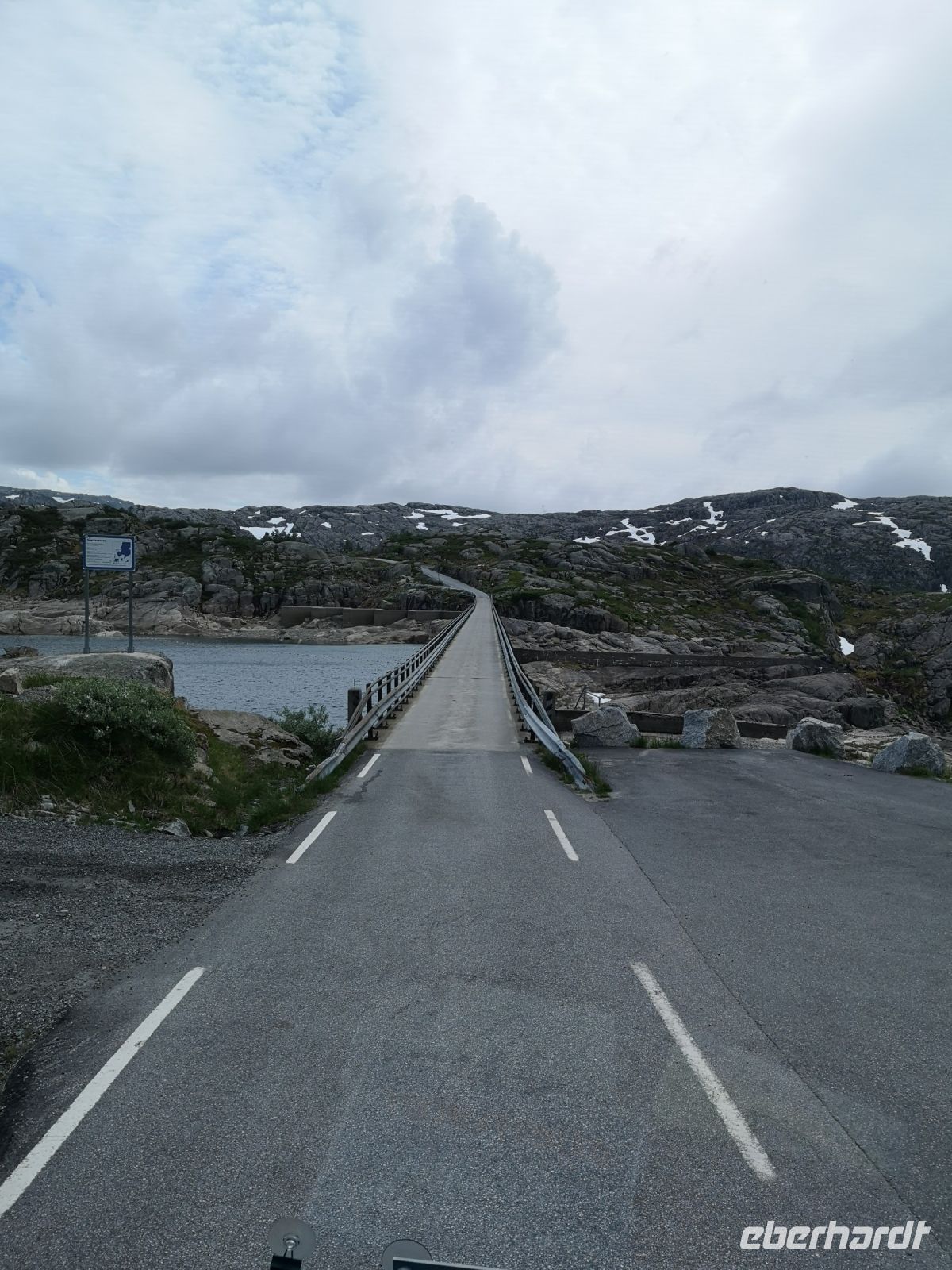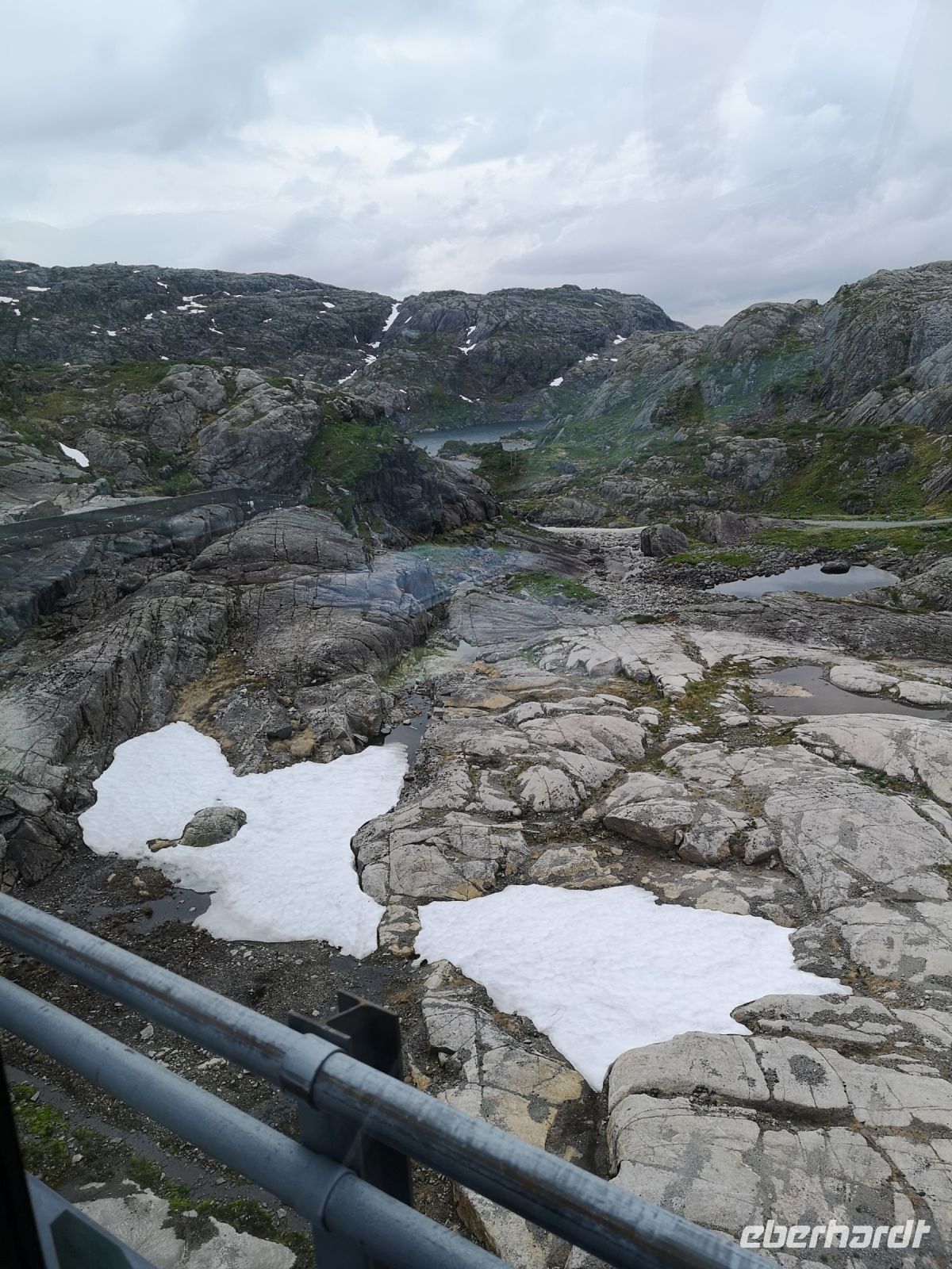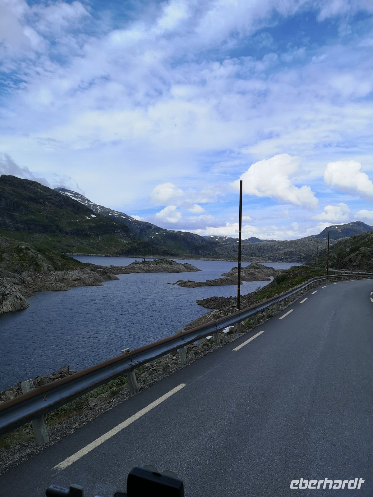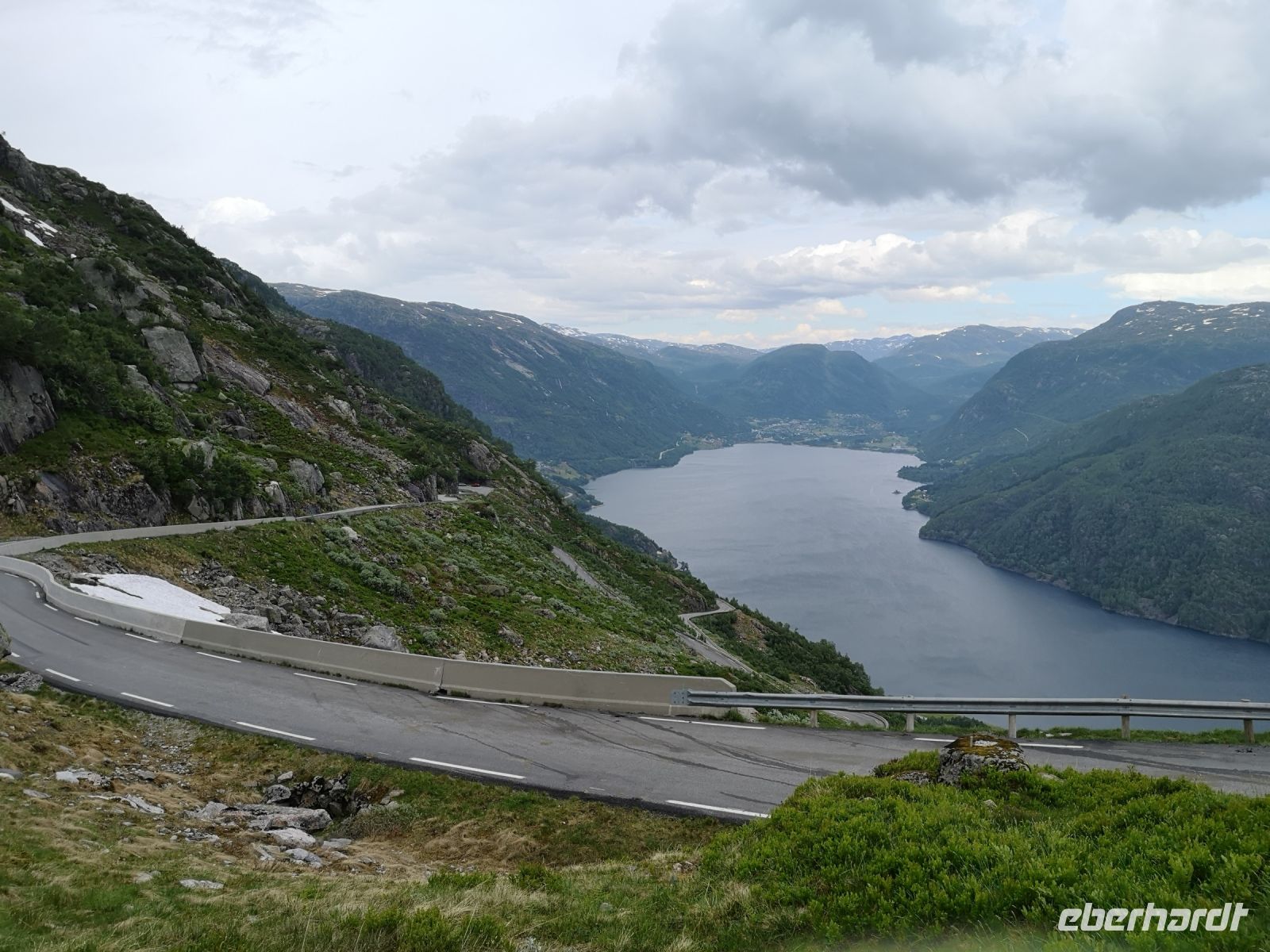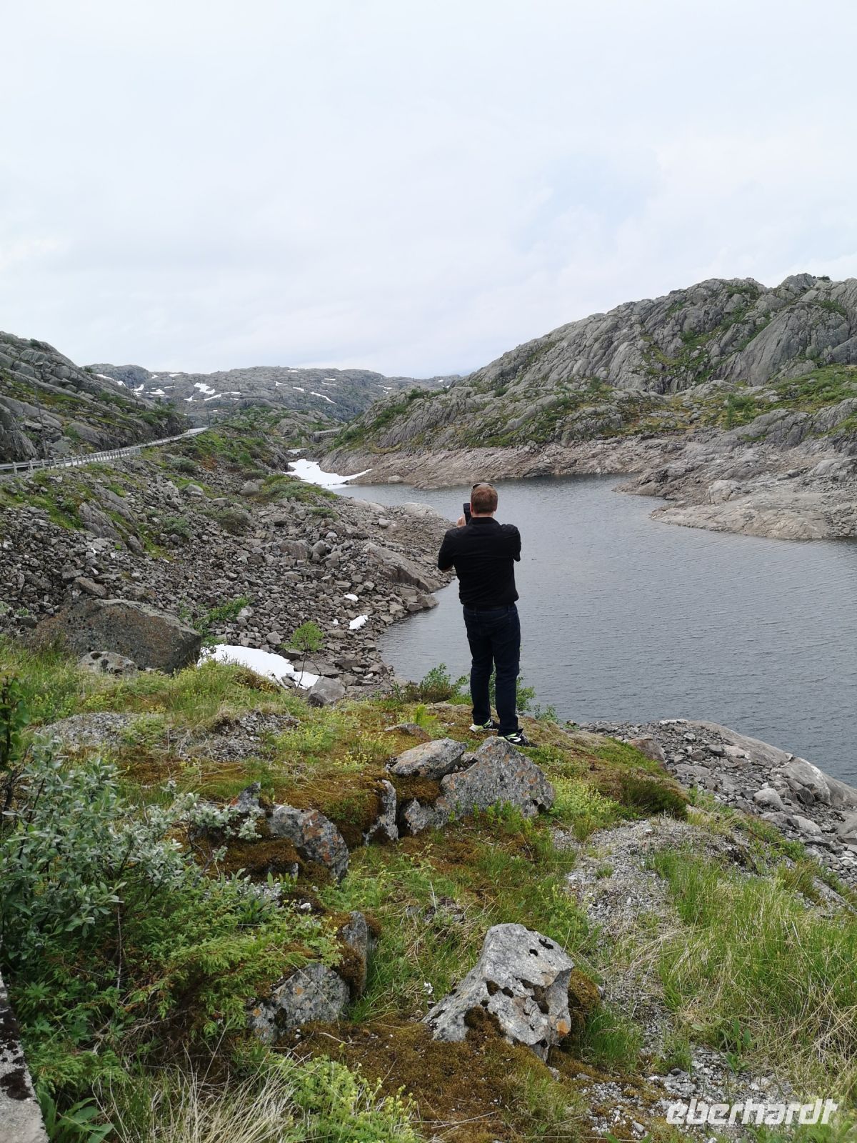 Von da an beginnt ein stopp and go: wir machten einen Stopp, wo man ein tolles Foto machen konnte, zB. Parkplatz Ostasteidn über den Sandfjord, oder Svandalfossen – ein Wasserfall von 180m Höhe und nebenan 540 Stufen, wenn man ihn erklimmen möchte. Kurzer Stopp in Sauda und schon gehts bergauf zum Saudafjell - einer Hochebene oberhalb der Baumgrenze, die auch norwegische Tundra genannt wird. Die Passstraße steigt bis auf 900 m Höhe hinauf und wurde 1960 mit amerikanischem Kapital gebaut. Sie ist eine reine Sommerstrasse, im Winter liegen hier 5-6 m Schnee und sie ist gesperrt. Saudafjell war die erste Hochebene und sie hat mit ihrer Landschaft jeden fasziniert. Ich denke, jeder würde sein Empfinden beim Anblick auf diese Natur anders beschrieben – und das ist auch gut so. Immer wieder hielten wir an und versuchten die schönsten Motive vor die Linse zu bekommen.