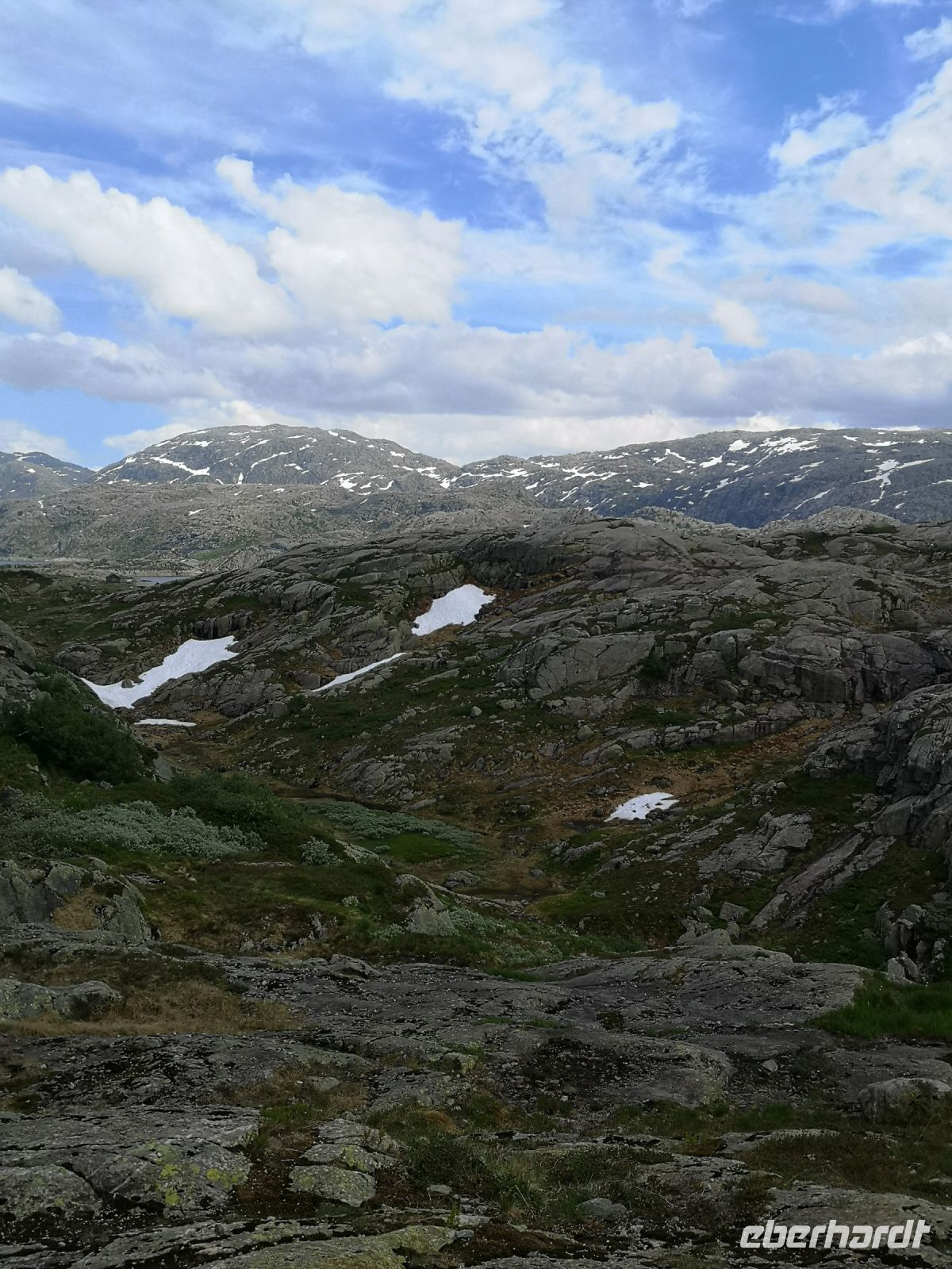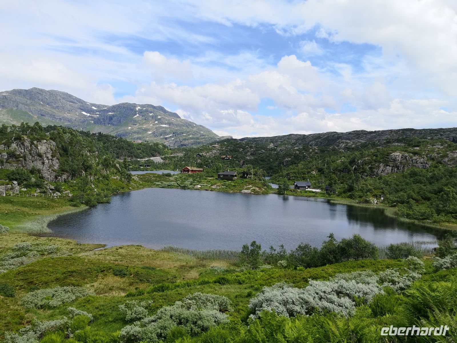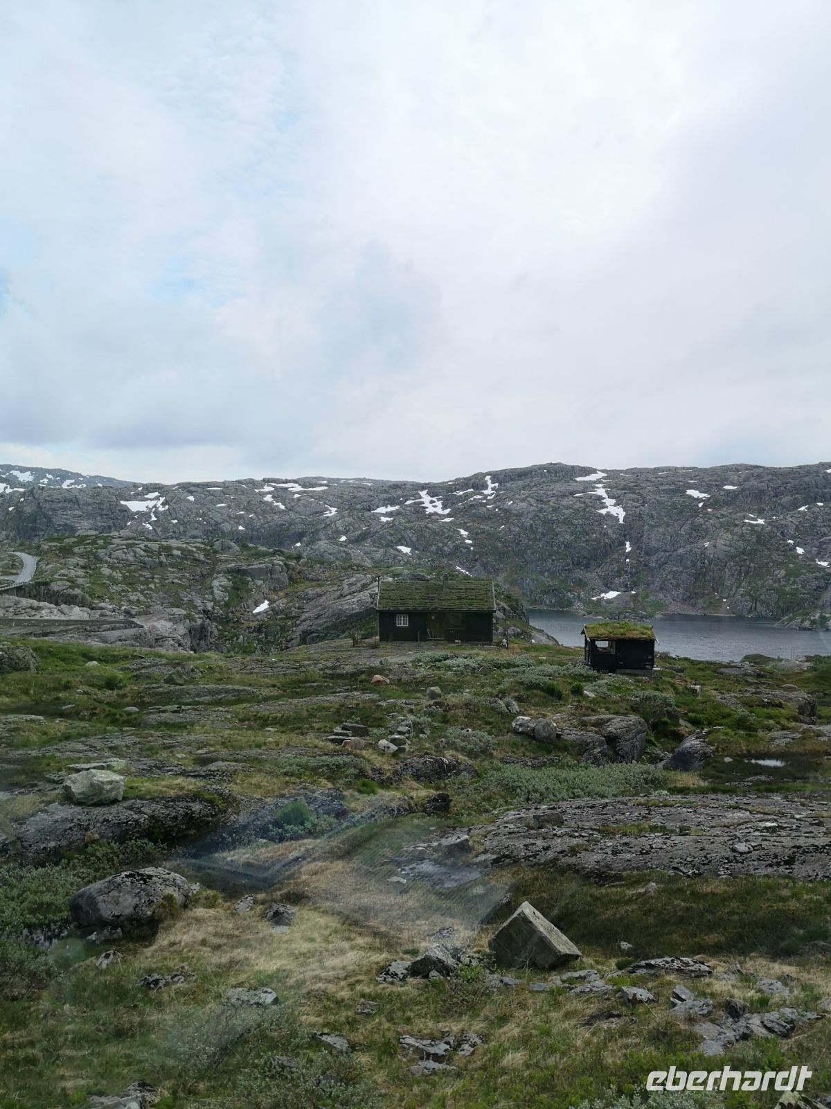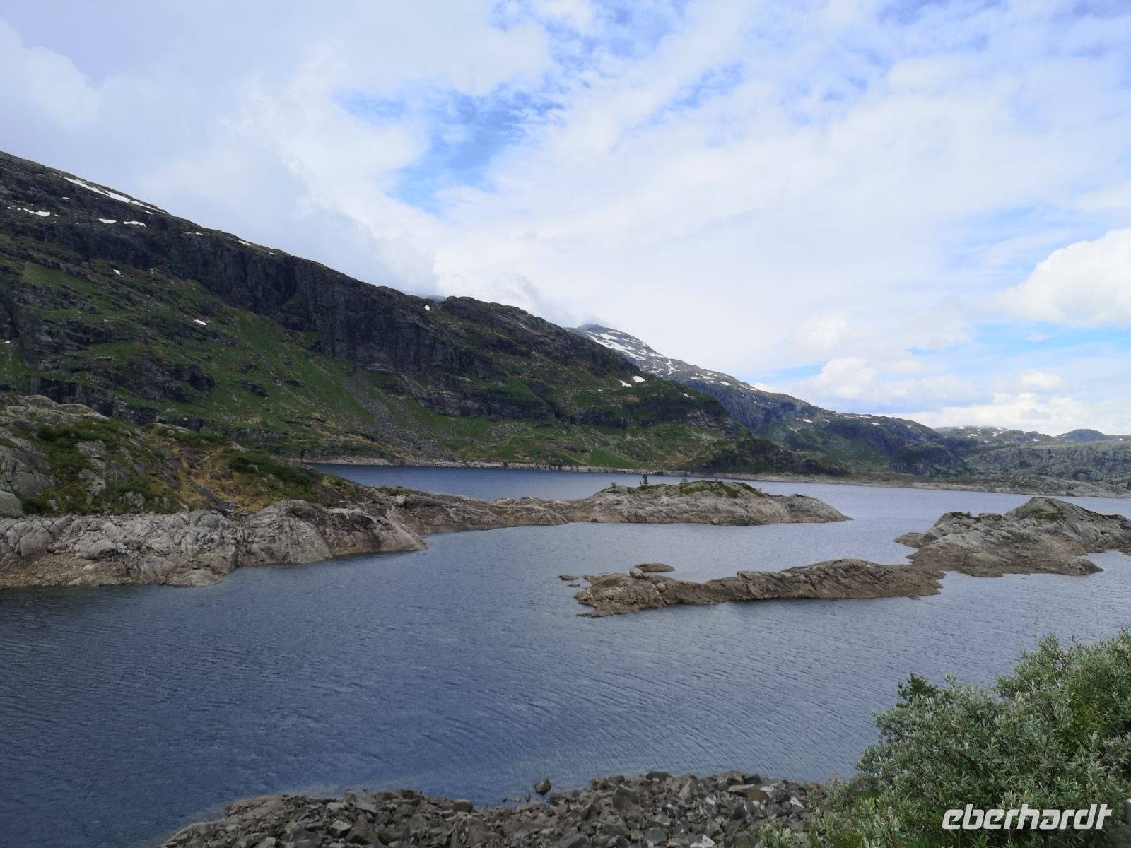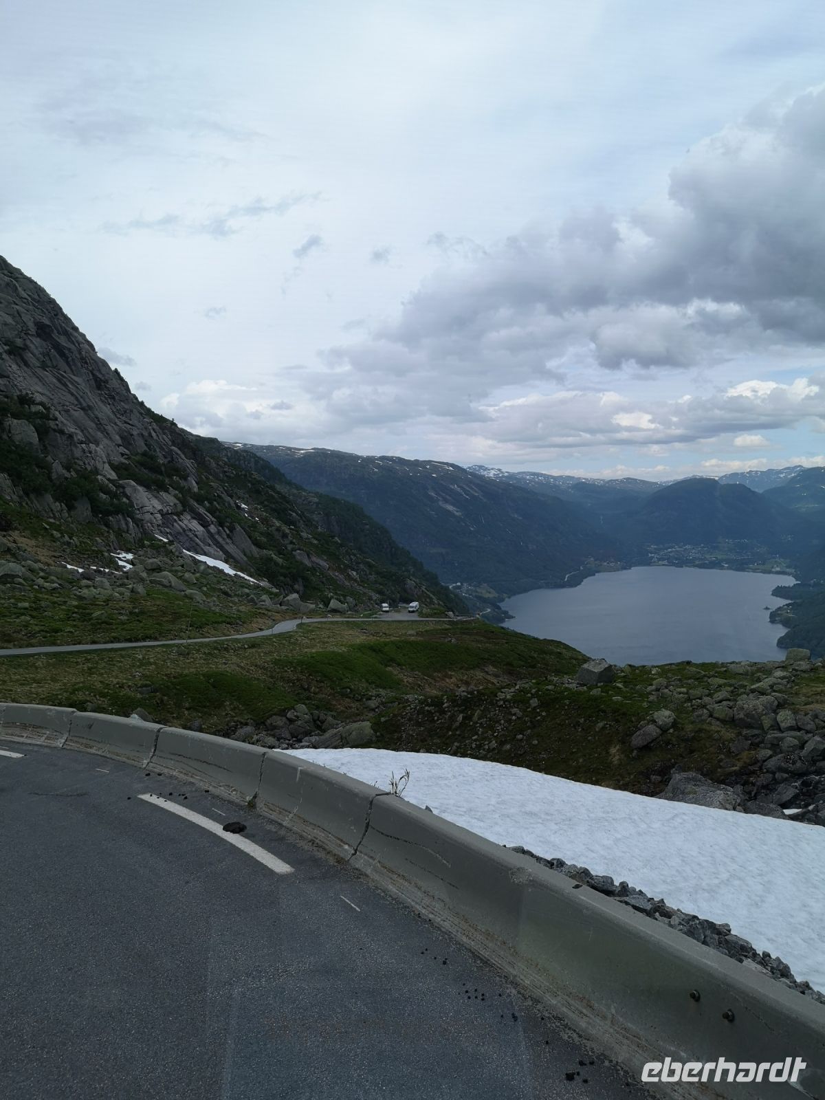 Von da an beginnt ein stopp and go: wir machten einen Stopp, wo man ein tolles Foto machen konnte, zB. Parkplatz Ostasteidn über den Sandfjord, oder Svandalfossen – ein Wasserfall von 180m Höhe und nebenan 540 Stufen, wenn man ihn erklimmen möchte. Kurzer Stopp in Sauda und schon gehts bergauf zum Saudafjell - einer Hochebene oberhalb der Baumgrenze, die auch norwegische Tundra genannt wird. Die Passstraße steigt bis auf 900 m Höhe hinauf und wurde 1960 mit amerikanischem Kapital gebaut. Sie ist eine reine Sommerstrasse, im Winter liegen hier 5-6 m Schnee und sie ist gesperrt. Saudafjell war die erste Hochebene und sie hat mit ihrer Landschaft jeden fasziniert. Ich denke, jeder würde sein Empfinden beim Anblick auf diese Natur anders beschrieben – und das ist auch gut so. Immer wieder hielten wir an und versuchten die schönsten Motive vor die Linse zu bekommen.