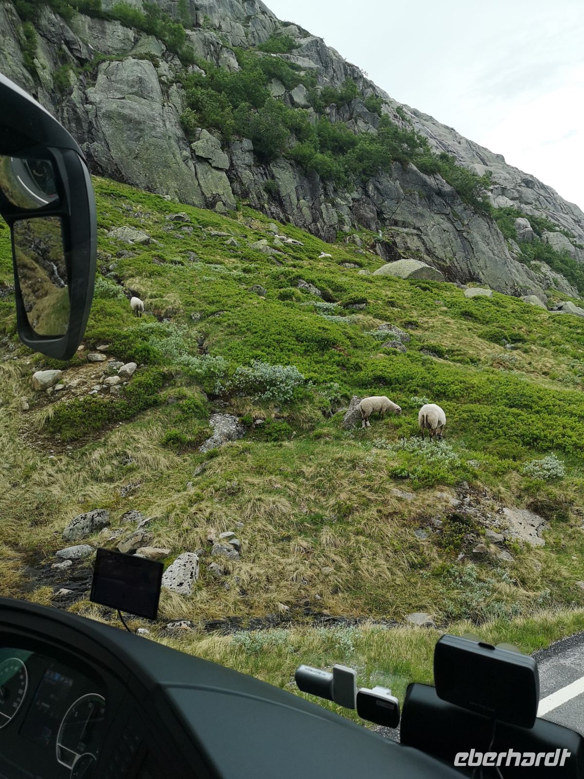 Adlerstrasse hinauf, von 0 m auf 620 m üms., über 11 Serpentinen mit einem herrlichen Blick auf den Geirangerfjord, wunderbar in seinem Wesen und frisch vom Regen gewaschen. Unser Bus schnurrte beständig und ruhig, Jan meisterte die Kurven als er schon mit dem Lenkrad auf die Welt gekommen wäre…….