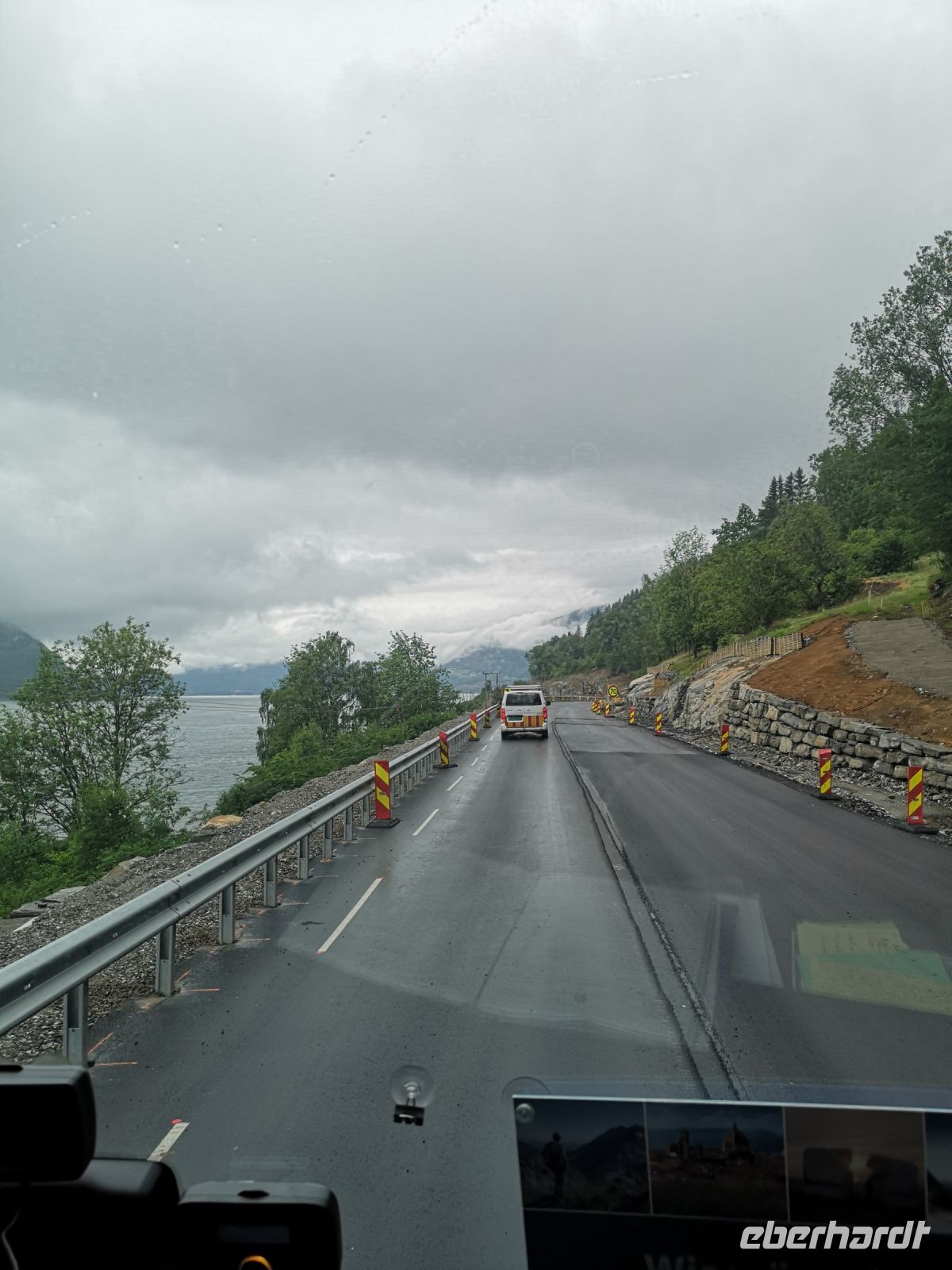 Bis wir nach Sogndal kamen, vergingen einigen Stunden und weil man sich schon nach dem Hotel gesehnt hatte, wurden wir noch in der Geduld geprobt: viele Staus wegen den Baustellen – wie ich schon erwähnt hatte: Norwegen hat viel vor im Puncto Infrastruktur!! Teilweise wurden wir sogar vom Fahrzeug der Baufirma eskortiert – das erlebt man auch nicht alle Tage ??. Und ja, das reichliche Abendbuffet war eine gute Entschädigung für all die Strapazen dieses Tages