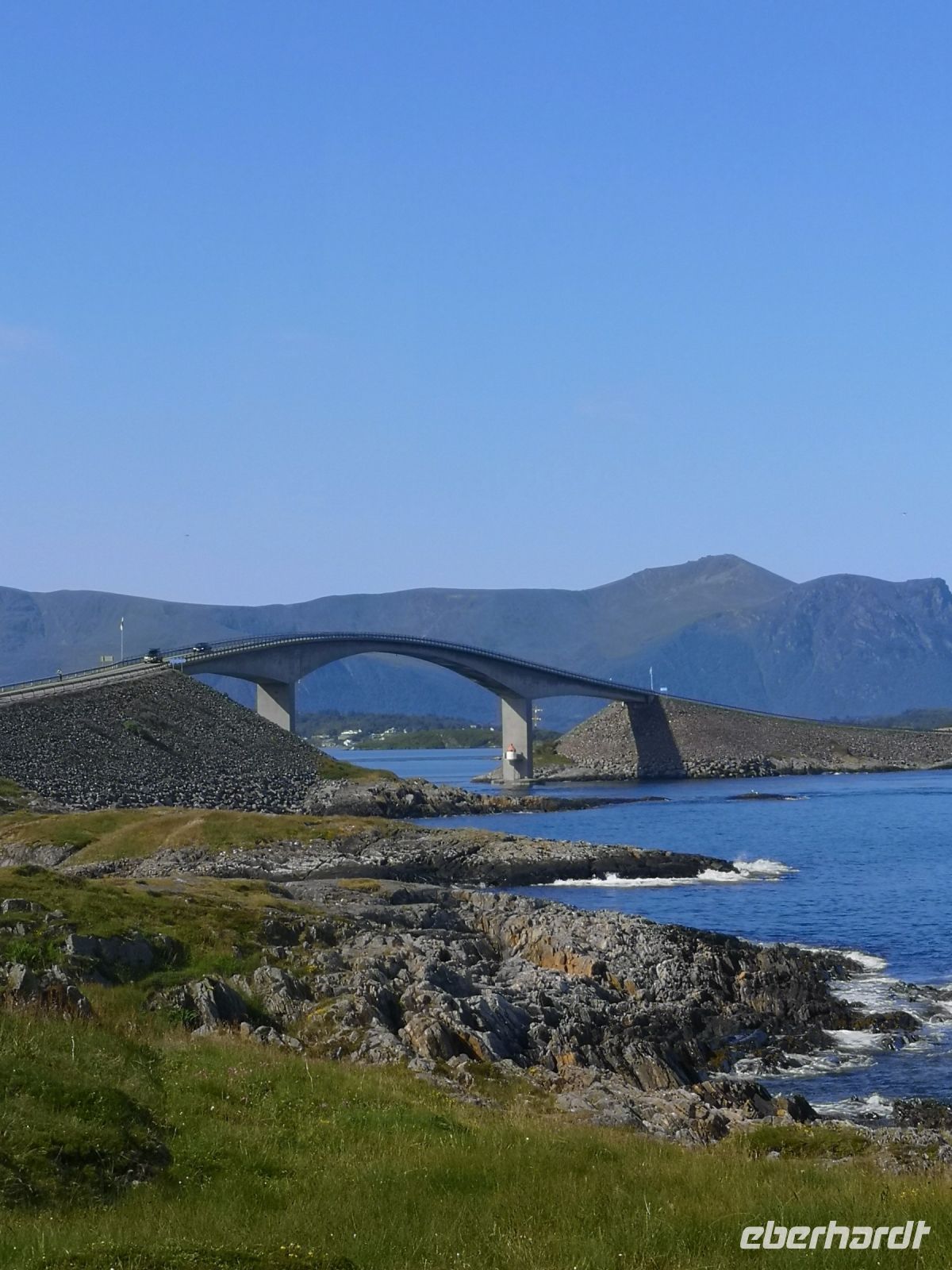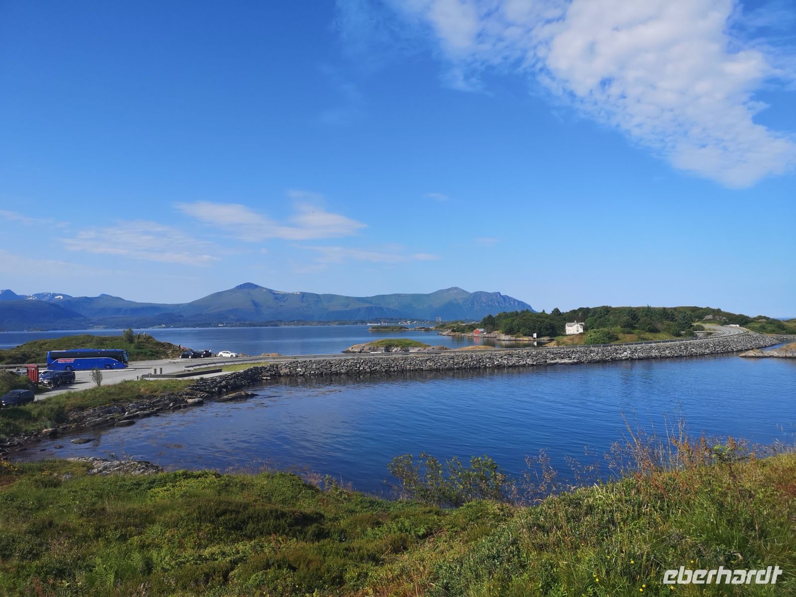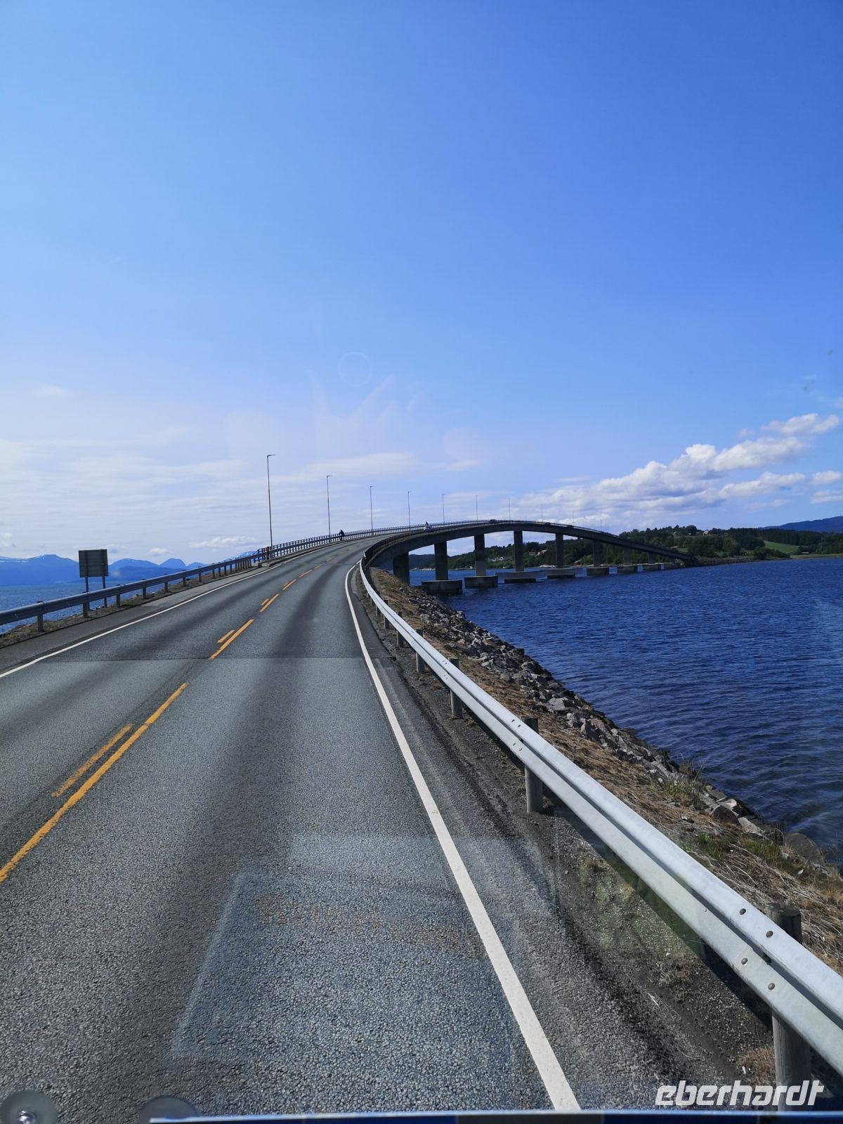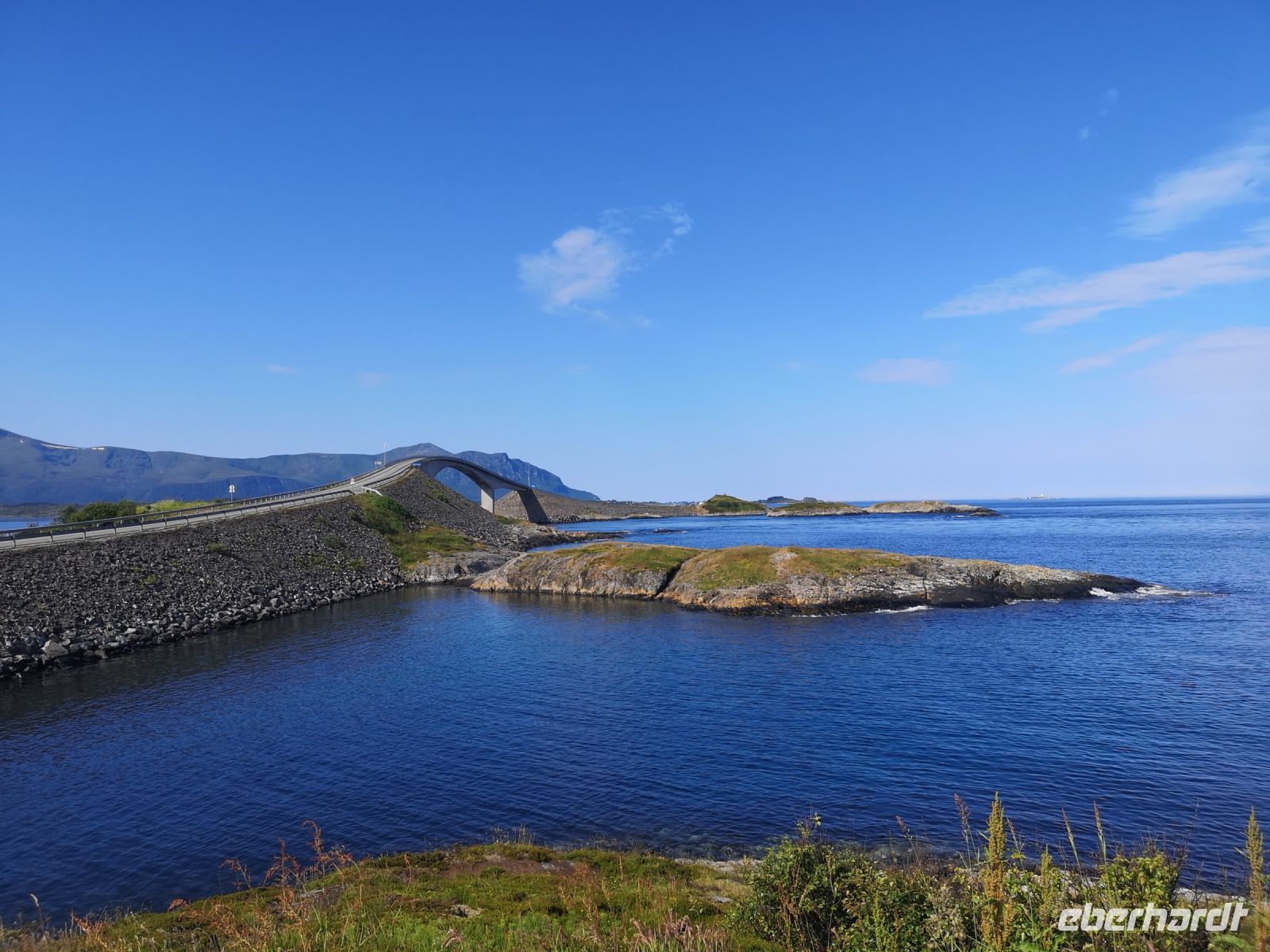 Atlantikstrasse: einst gebaut, um die Wirtschaft der Insel Averoya anzukurbeln, aber letztendlich von den Touristen zur Touristenattraktion gekürt. An dem Tag schlängelte sie sich in Sonne gebadet und bei ruhigem Wasser durch die Schären, hüpft bei Storseisund-Brücke auf 23 m Höhe hinauf und endete nach guten 8 km Fahrt. Man musste einfach paar Fotostopps mehr machen als geplant.