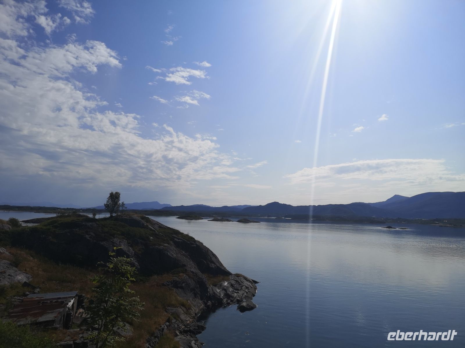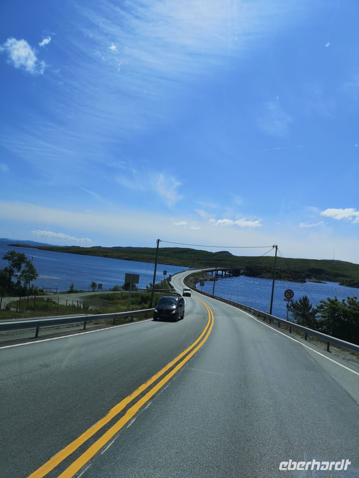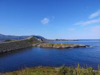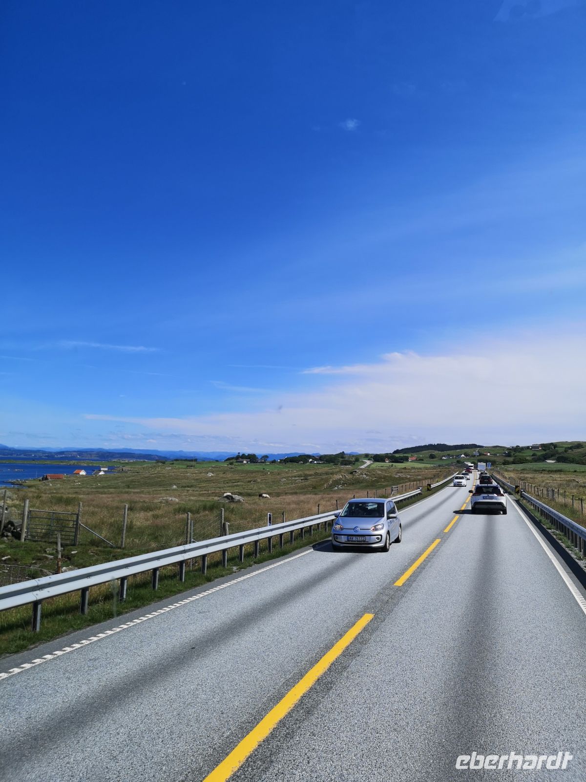 Atlantikstrasse: einst gebaut, um die Wirtschaft der Insel Averoya anzukurbeln, aber letztendlich von den Touristen zur Touristenattraktion gekürt. An dem Tag schlängelte sie sich in Sonne gebadet und bei ruhigem Wasser durch die Schären, hüpft bei Storseisund-Brücke auf 23 m Höhe hinauf und endete nach guten 8 km Fahrt. Man musste einfach paar Fotostopps mehr machen als geplant.