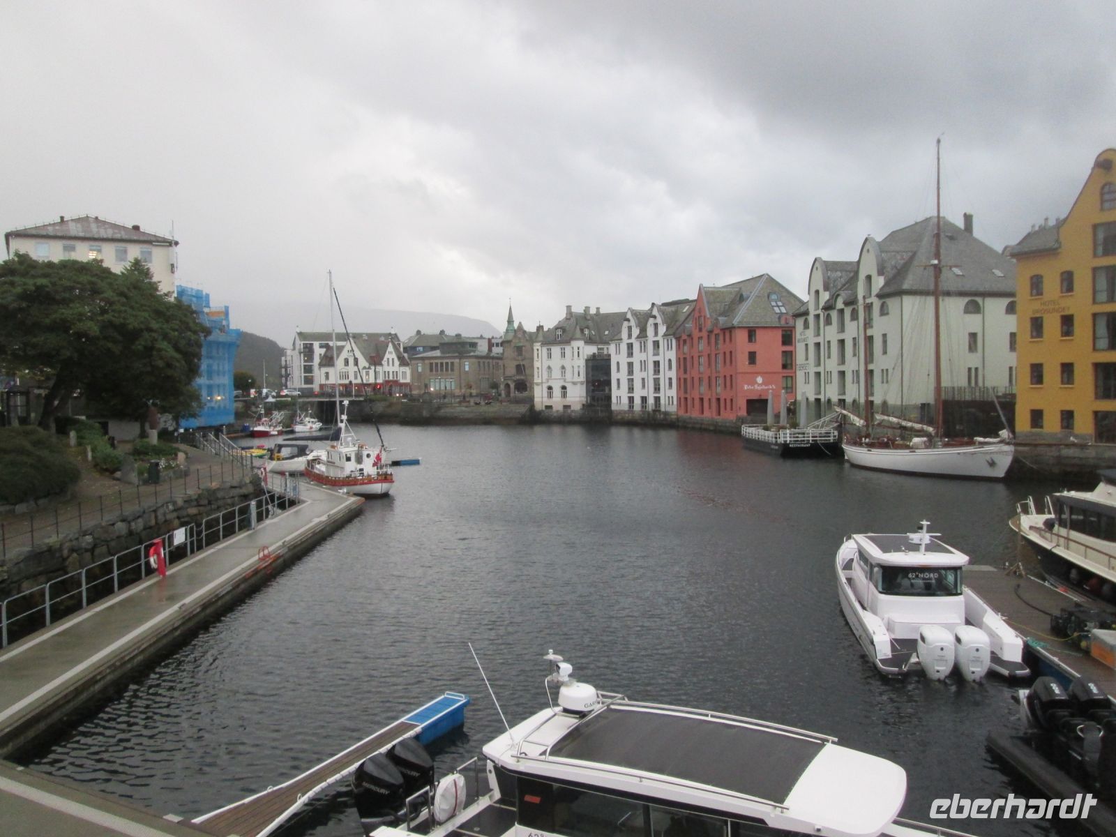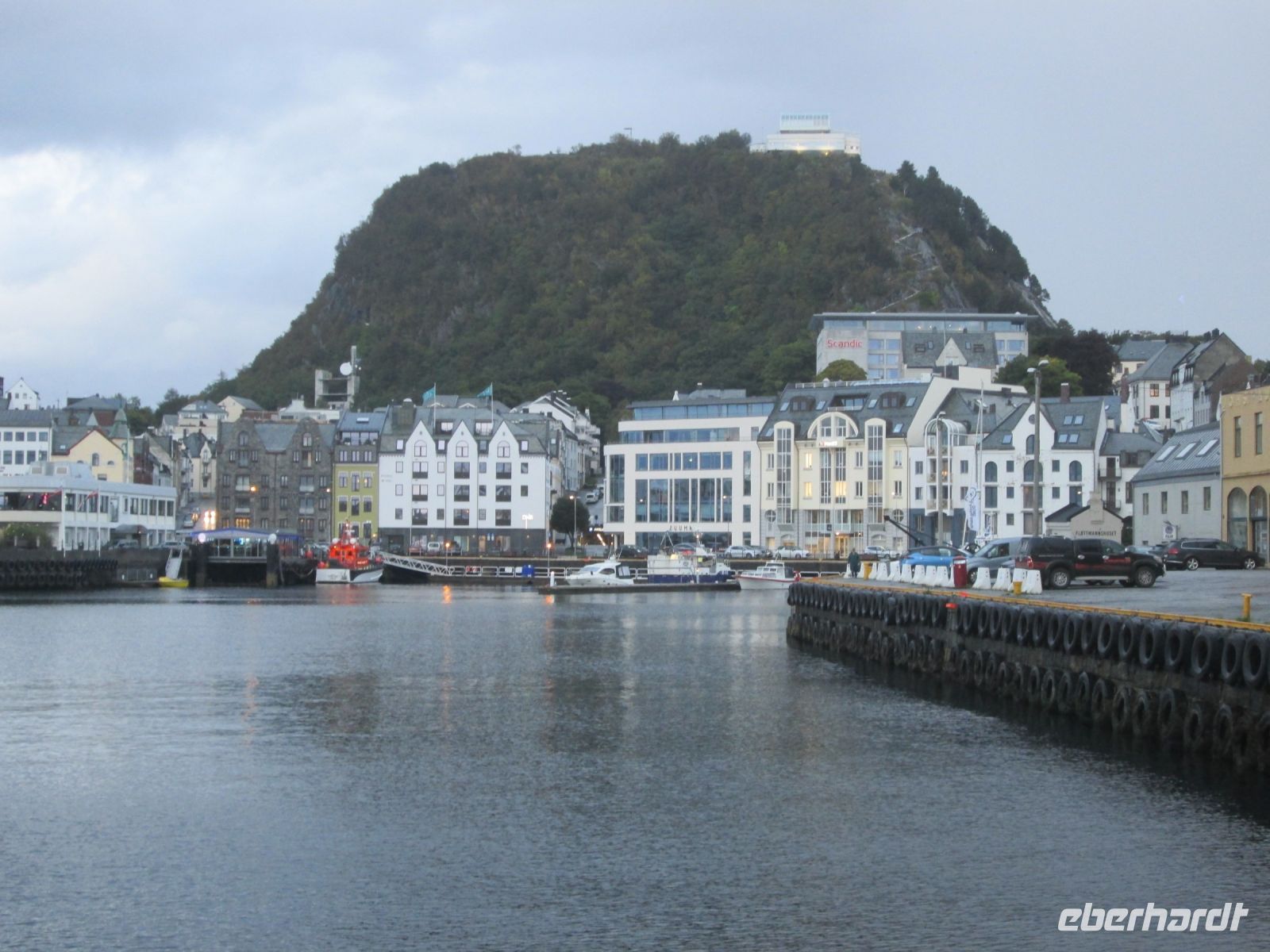 Das Besondere an der Oktoberreise ist die Einfahrt in den ca. 12 km langen Hjörnundfjord. Da ein direktes Anlegen unseres Schiffes mit seinem Tiefgang von etwa 5 Metern nicht möglich war, gab es das Tendern. Per Boot ging es somit in Urke an Land, um von dort die angebotenen Landausflüge per Bus zu starten. Der Längste führte uns über das Weltnaturerbe der UNESCO, den Geirangerfjord nach Ålesund , während die Schiffsgäste Ålesund 18.00 Uhr erreichten. Den angebotenen Spaziergang mit der Reisebegleitung nahmen einige gern an und so lernten wir die Jugendstil-Stadt etwas näher kennen. Ålesund ist als Siedlungsplatz relativ jung. 1848 wurde das Stadtrecht verliehen. Leider wurde 1904 die Stadt durch einen Großbrand zerstört. Da Kaiser Wilhelm II. nicht nur ein Norwegen-Fan und -Kenner war, sondern auch Ålesund sehr mochte, ließ er 4 Schiffe mit Hilfsgütern und Baumaterial nach Ålesund fahren, um den Bewohnern zu helfen. Nach Löschen der Ladung dienten die Schiffe als Notbehausung. Der Wiederaufbau geschah alsbald, dem damaligen Zeitgeist entsprechend im Jugendstil. In der Fußgängerzone präsentieren sich heute die meisten Jugendstil Gebäude. Über der Stadt lädt der Hausberg Aksla zu einem herrlichen Rundblick ein. Aber die Liegezeit war begrenzt, man musste sich entscheiden: Stadtspaziergang oder 418 Stufen auf den Hausberg.