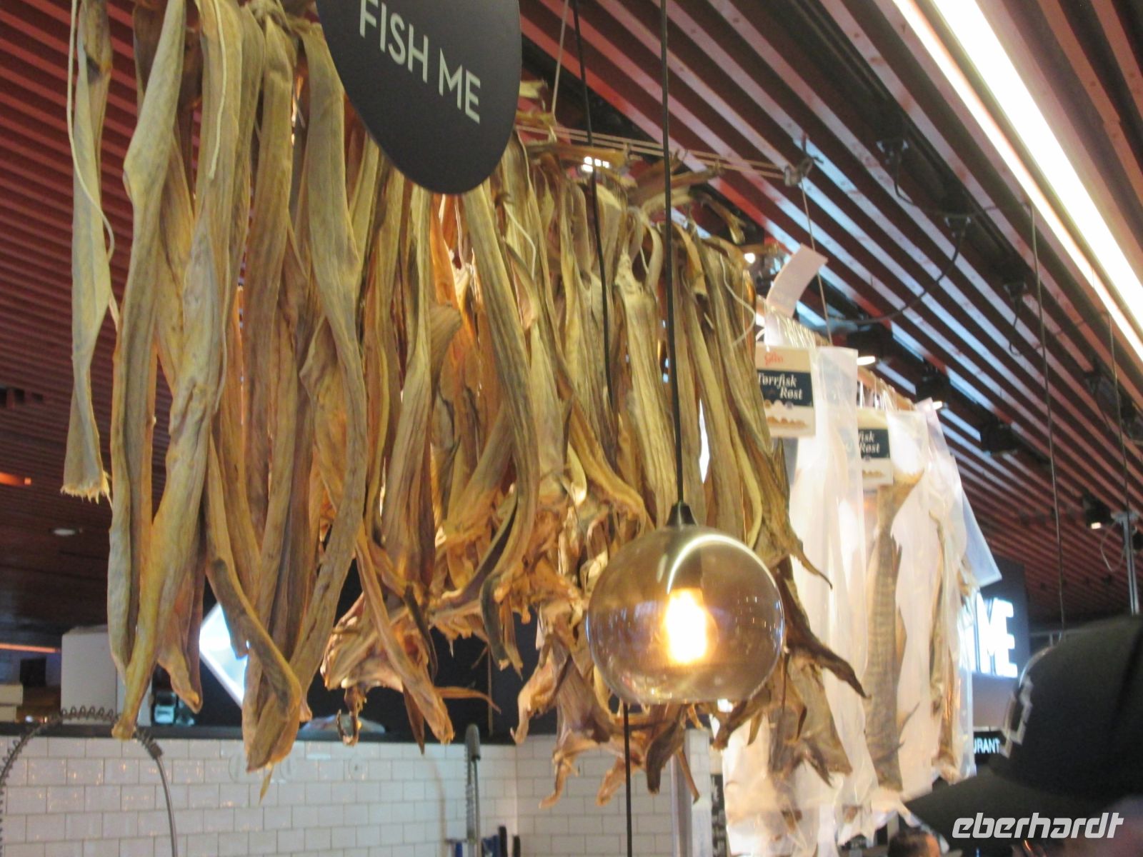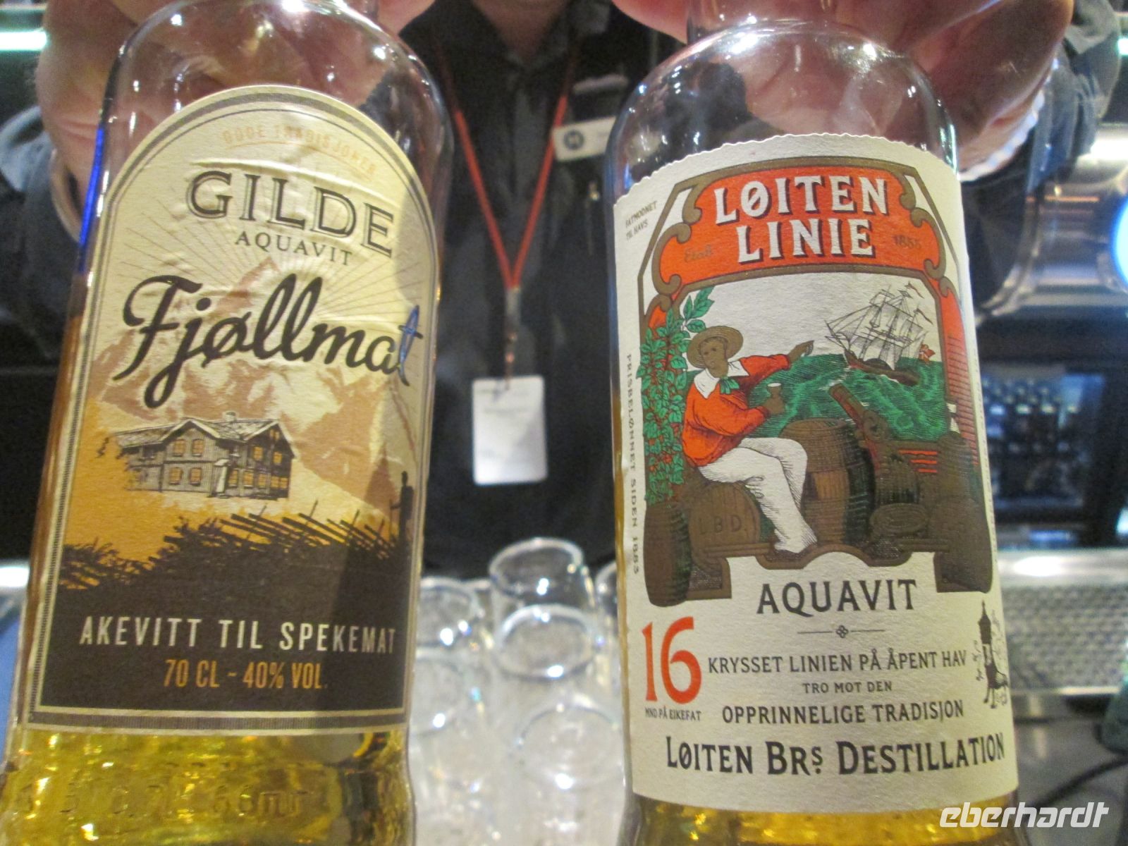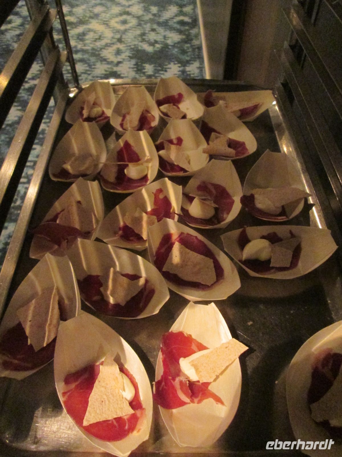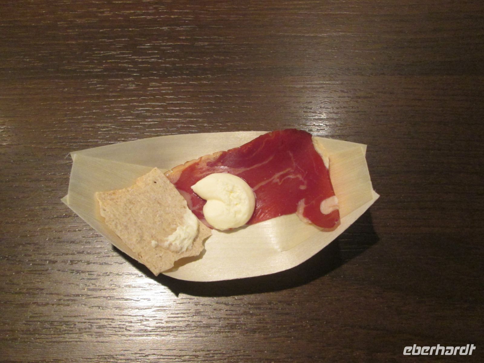 Es gab danach zu später Stunde noch eine norwegische Spezialität: Fenalår, getrockneter und gesalzener Lammschinken, serviert mit einem Hauch von Knäckebrot und Sauerrahm. Dazu wurden 2 Sorten von Aquavit angeboten, zum Schnäppchenpreis von 12€ oder 20 €- nein, nicht die Flasche, sondern etwa 1 cm Füllmenge in einem kleinen Schnapsgläschen. Skål !