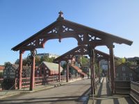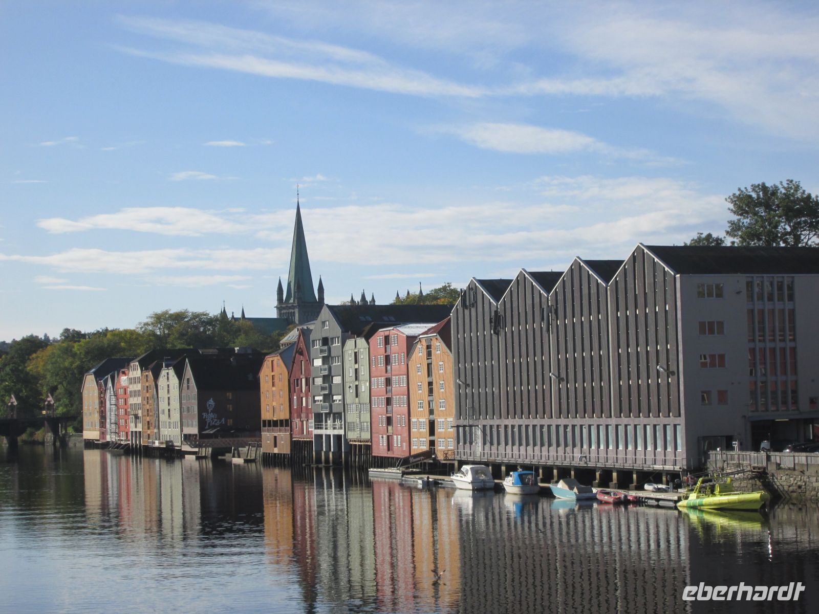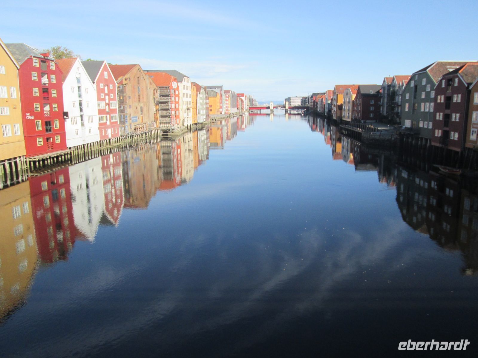 Die Alte Steinbrücke (Gamle Bybro) wird flankiert vom Zoll-und Wächterhäuschen und überspannt den Nidelven. Vom meistfotografierten Objekt der Stadt hat man zudem einen schönen Blick über die den Fluss säumenden Speicherhäuser, auf die hoch gelegene Festung Kristiansten und die NTNU, die Technisch- Naturwissenschaftlichen Universität. Sie verbindet das direkte Stadtzentrum mit dem charmanten Bakklandet mit ihren Holzhäusern, wo es den einzigen Fahrradlift der Welt gibt, der sich aber zum Zeitpunkt unserer Besichtigung in einer Großbaustelle befand.