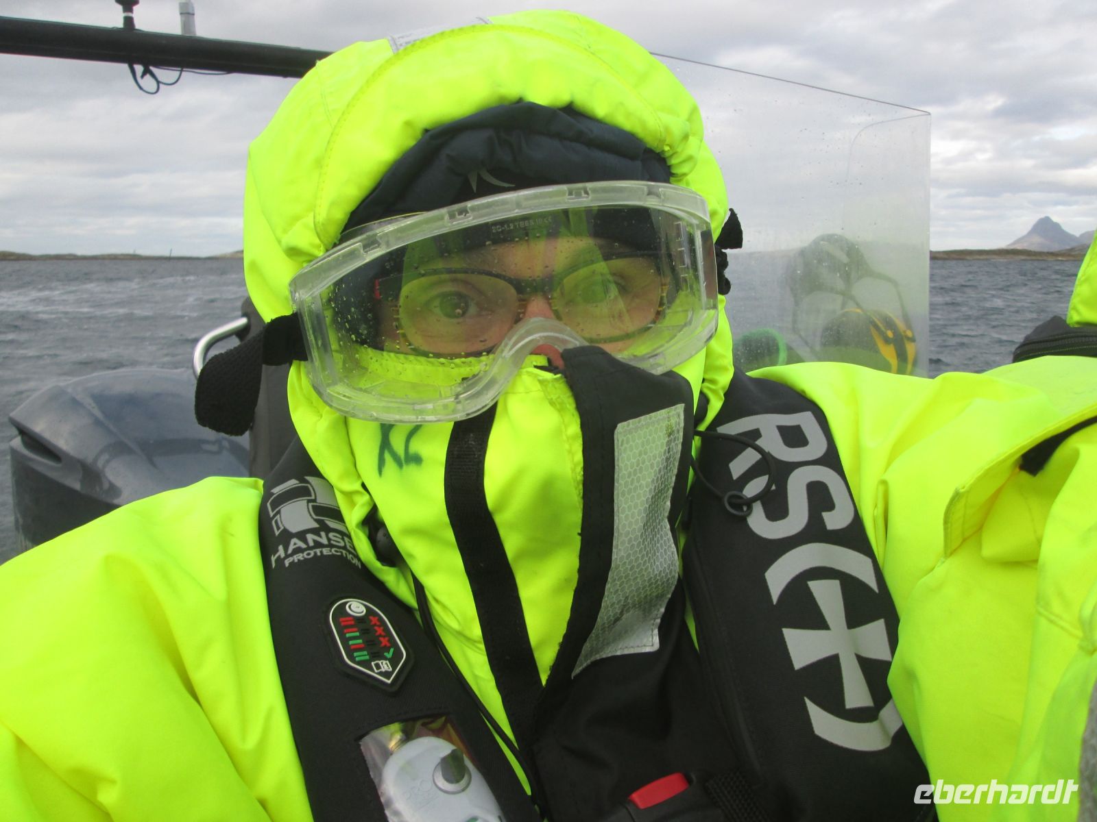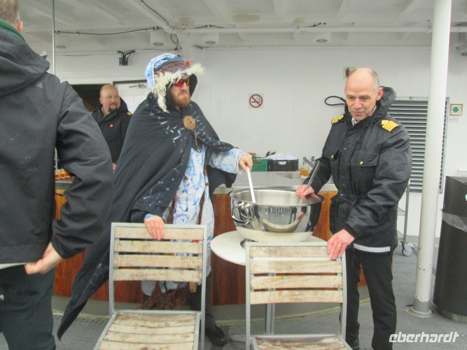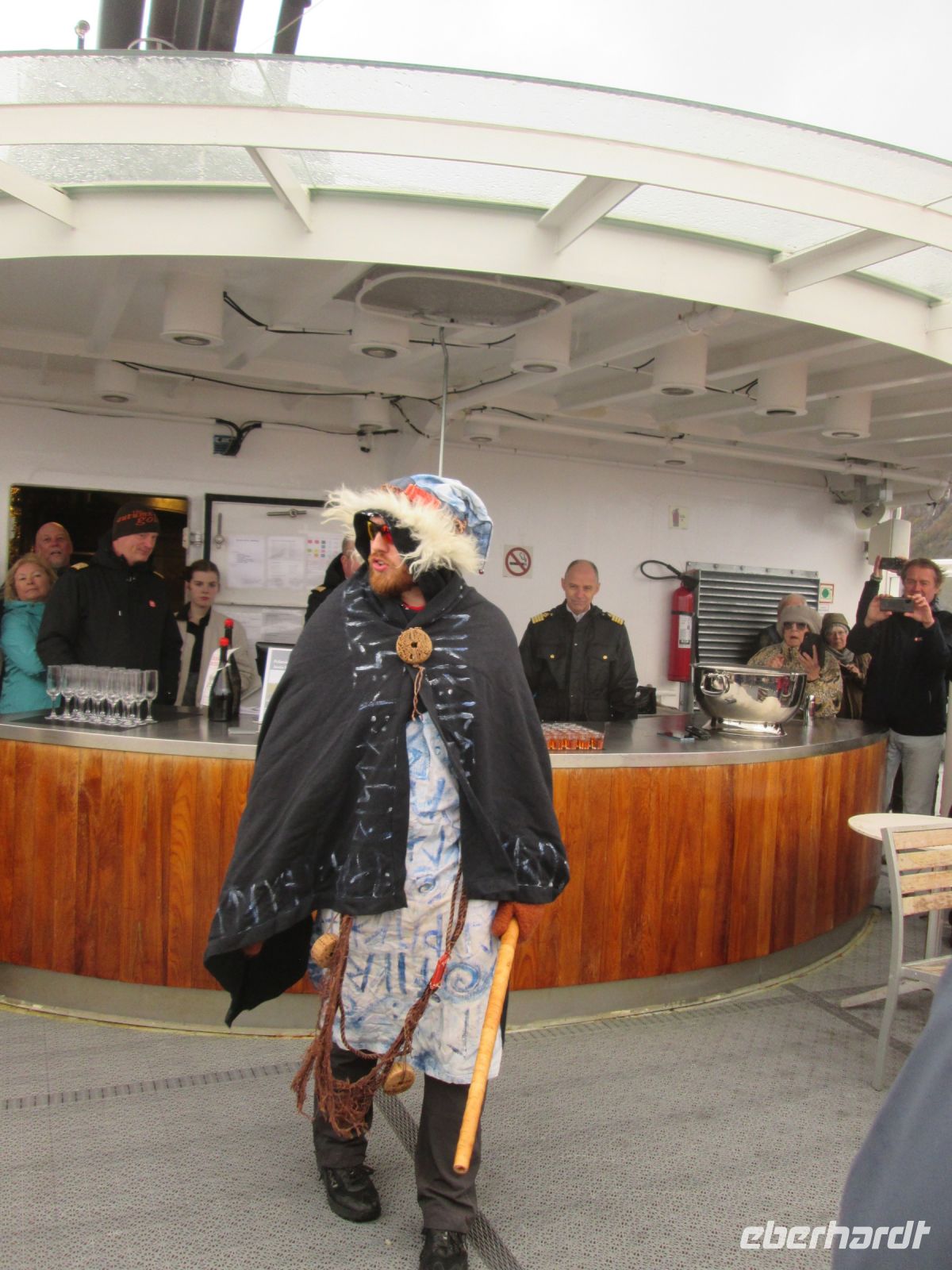 Der stolze Gewinner mit seiner präzisen Zeitangabe von 7 Uhr, 42 Minuten und 45 Sekunden freute sich über eine vom Kapitän überreichte Hurtigruten-Flagge. Was er aber zu diesem Zeitpunkt noch nicht wusste, war die Tatsache, dass er auch als Erster sich der Polarkreistaufe stellen musste. Dem Ritual entsprechend wird Taufwilligen Eiswasser vom Kapitän und dem laut herbeigerufenen König Njørd in den Nacken gegossen. Mancher verzieht keine Miene und erträgt dies tapfer schweigend, andere verleihen ihrer nassen und eiskalten Wahrnehmung durch Schreien und Kreischen Ausdruck. Manchmal wurde sogar geschimpft, warum gerade er oder sie so viel Eisiges ab bekam. Trotz des stürmigen und nassen Wetters war es ein tolles, lustiges Spektakel.