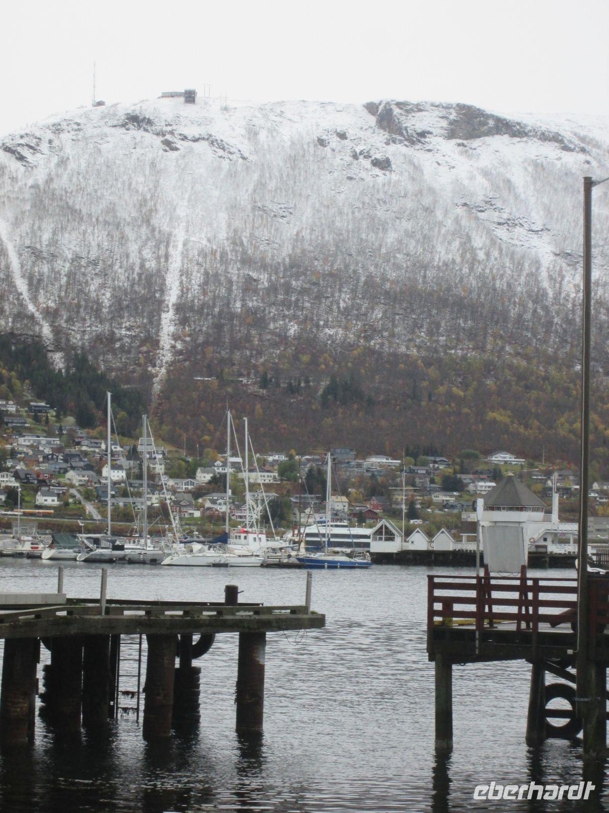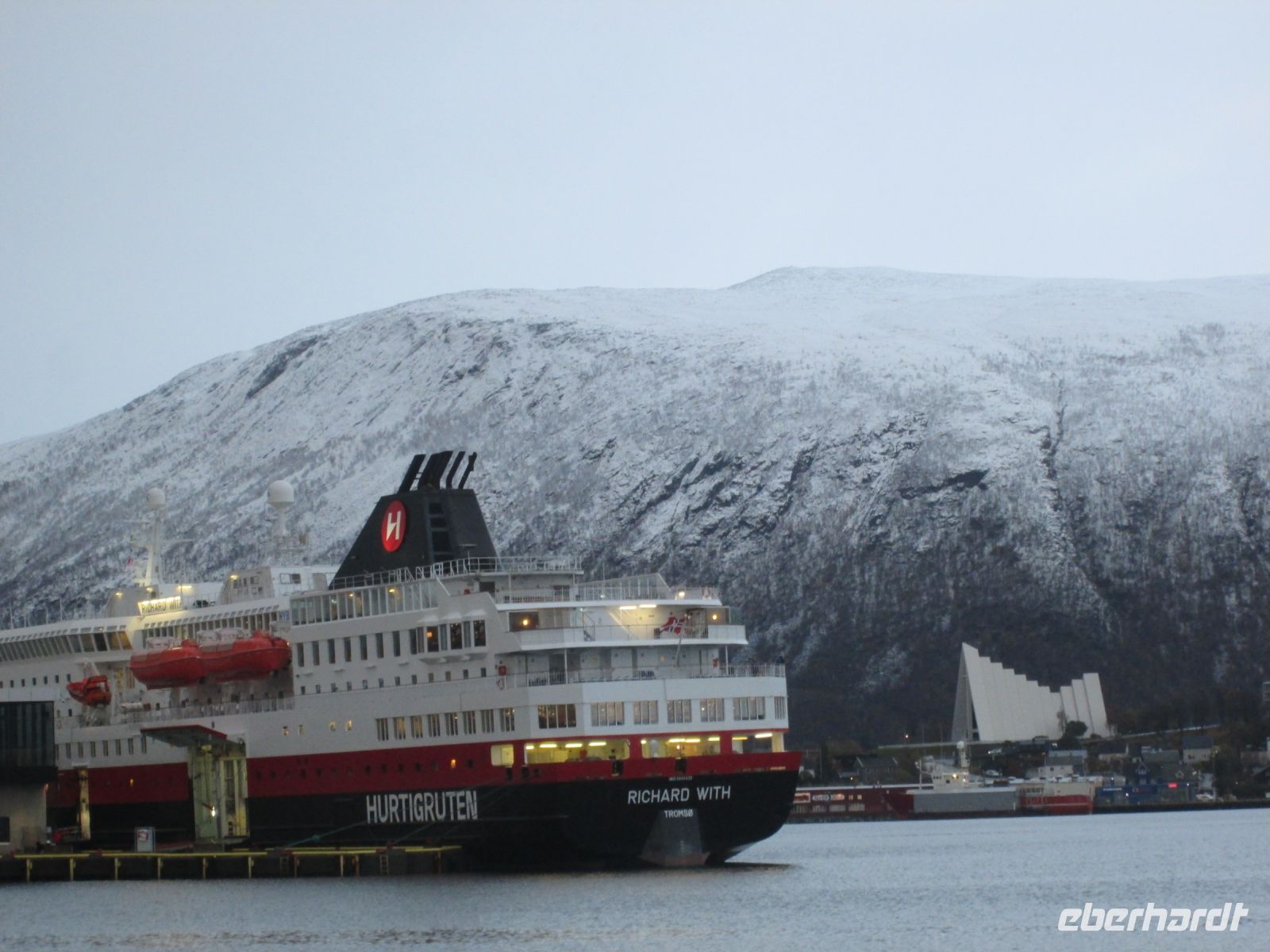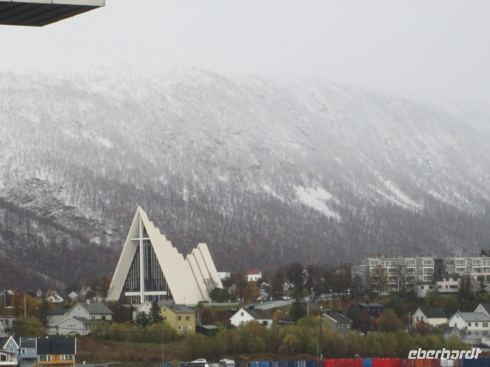 Pünktlich 14.15 Uhr wurde Tromsø erreicht. Das "Tor zur Arktis" machte ihrer Bezeichnung alle Ehren, es schneite etwas. Am Anleger begrüßte uns Fabian, mit ihm und der Chaufferin des Reisebusses Maja, konnten wir im Eberhardt-Sonderausflug die Sehenswürdigkeiten der Stadt kennenlernen.