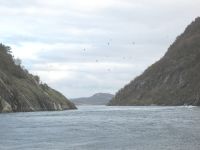 Norwegen ohne Trollfjord -unvorstellbar. Er ist 2 km lang und an der Mündung auf der Westseite des Raftsund nur etwa 80 m breit. Über 1000 m hohe Berge säumen ihn. 1890 war er Schauplatz einer Schlacht zwischen stark kommerziell orientierten Dampfschiffen, die mit ihren großen Schleppnetzen zum Fischfang hineingefahren sind und diesen gleich für sich abriegeln wollten und kleinen Ruder-und Segelbooten. Die Fischer in ihren kleineren Nordlandbooten trugen den Sieg davon und erkämpften sogar 1 Jahr später im Storting/Parlament ein Verbot von Schlepp-und Senknetzen während der Zeit des Lofotfischfang zwischen Januar und April.