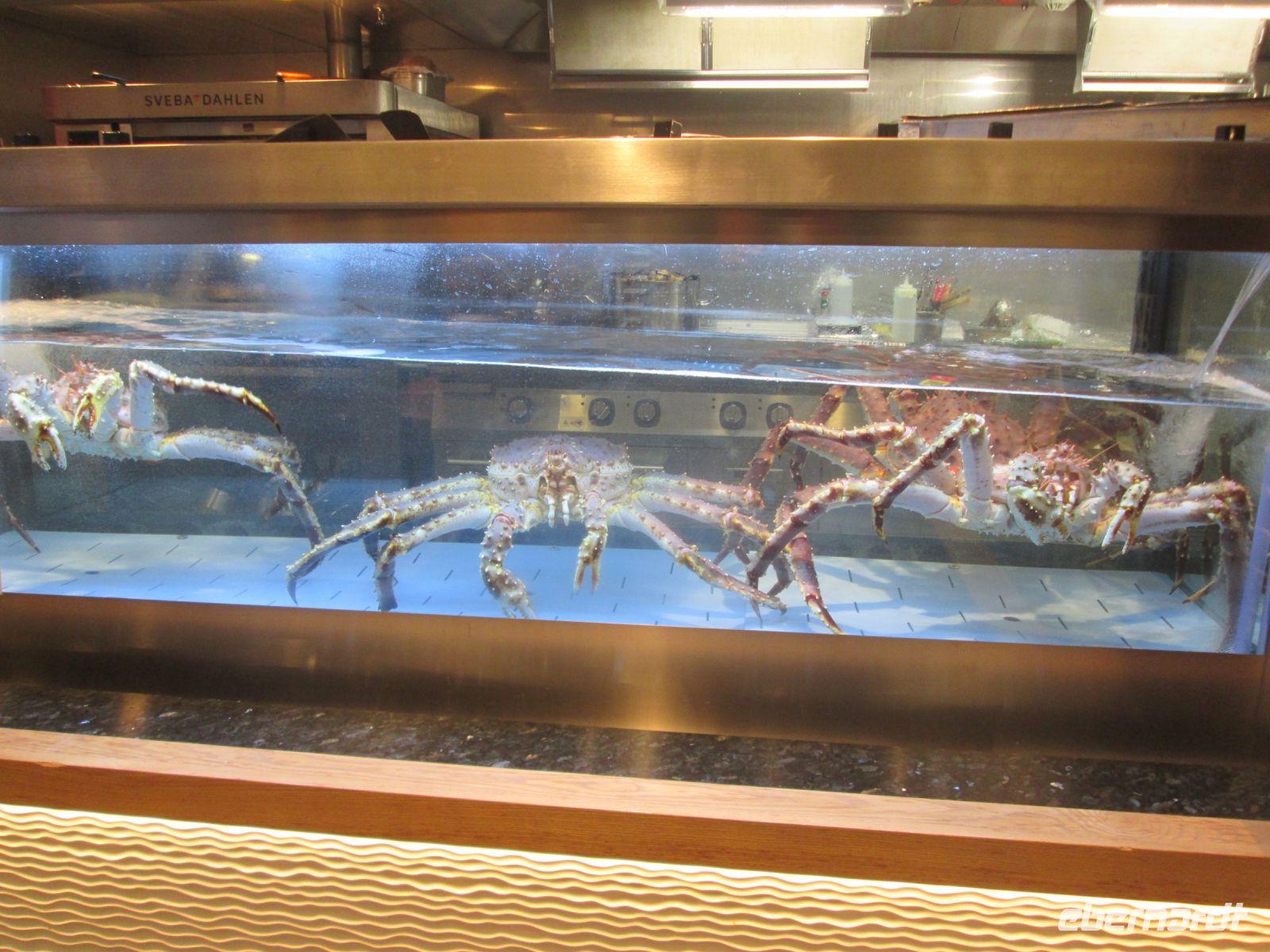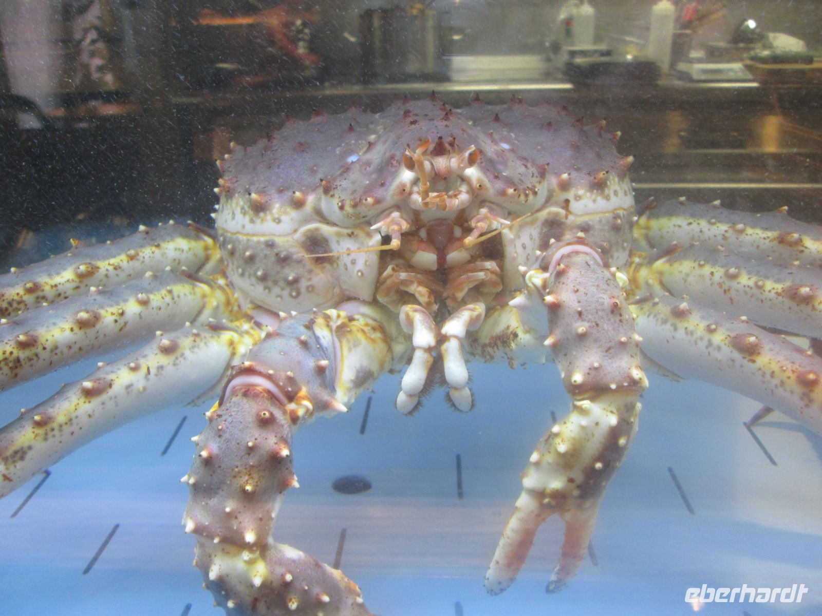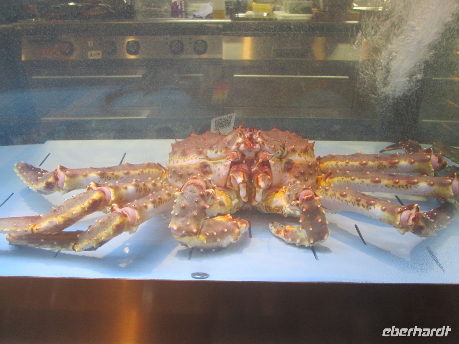 Die rote Königskrabbe wurde in norwegische Gewässer/Barentsee, ursprünglich im Pazifik beheimatet, eingeführt und lebt zwischen 5 und 400 Metern. Heute ist sie eine lokale Spezialität, welche bei dem angebotenen Ausflug probiert werden konnte, aber auch bei unserem zurückliegenden "Meeresfrüchte-Buffet" am Tag 5.