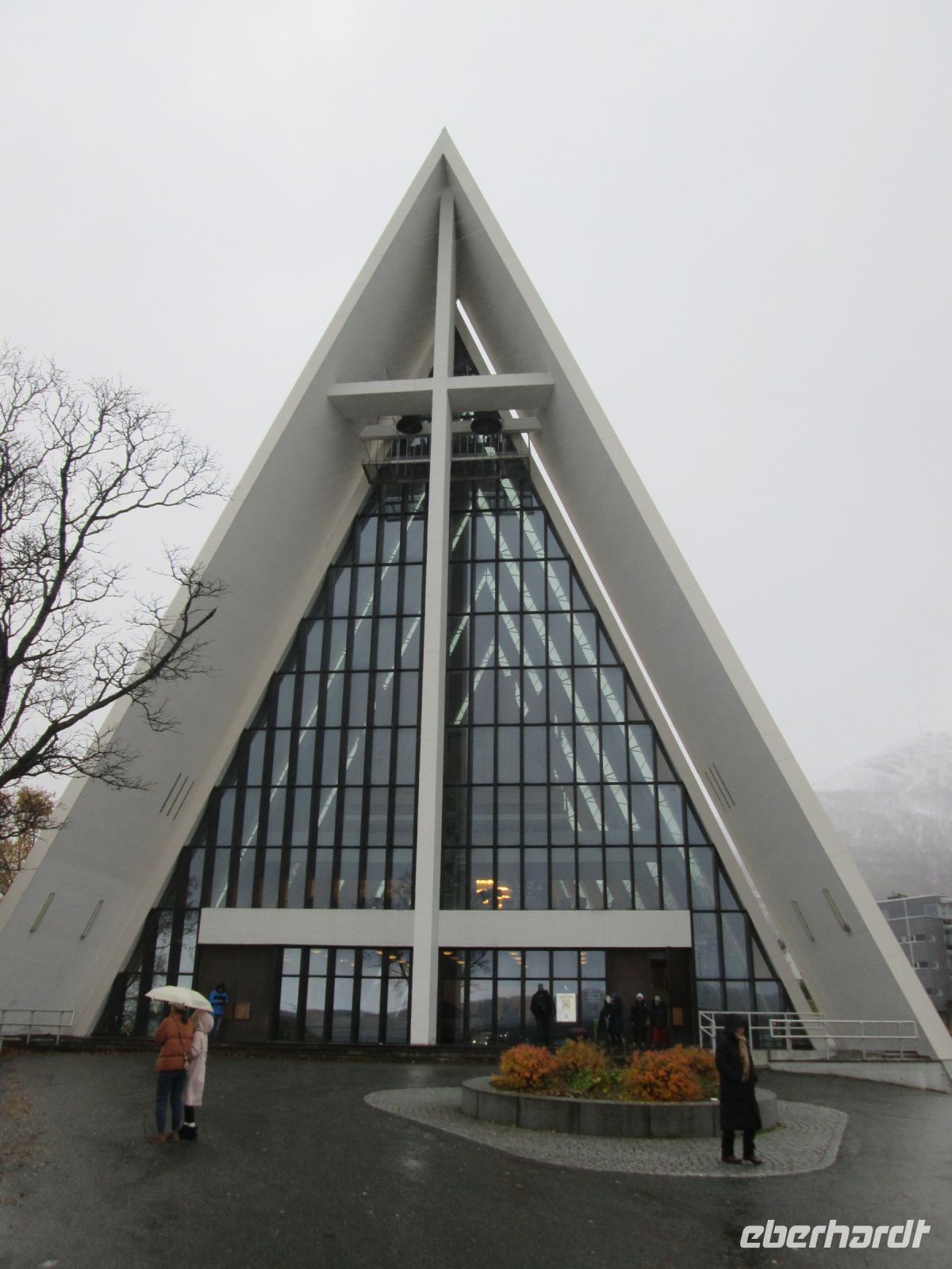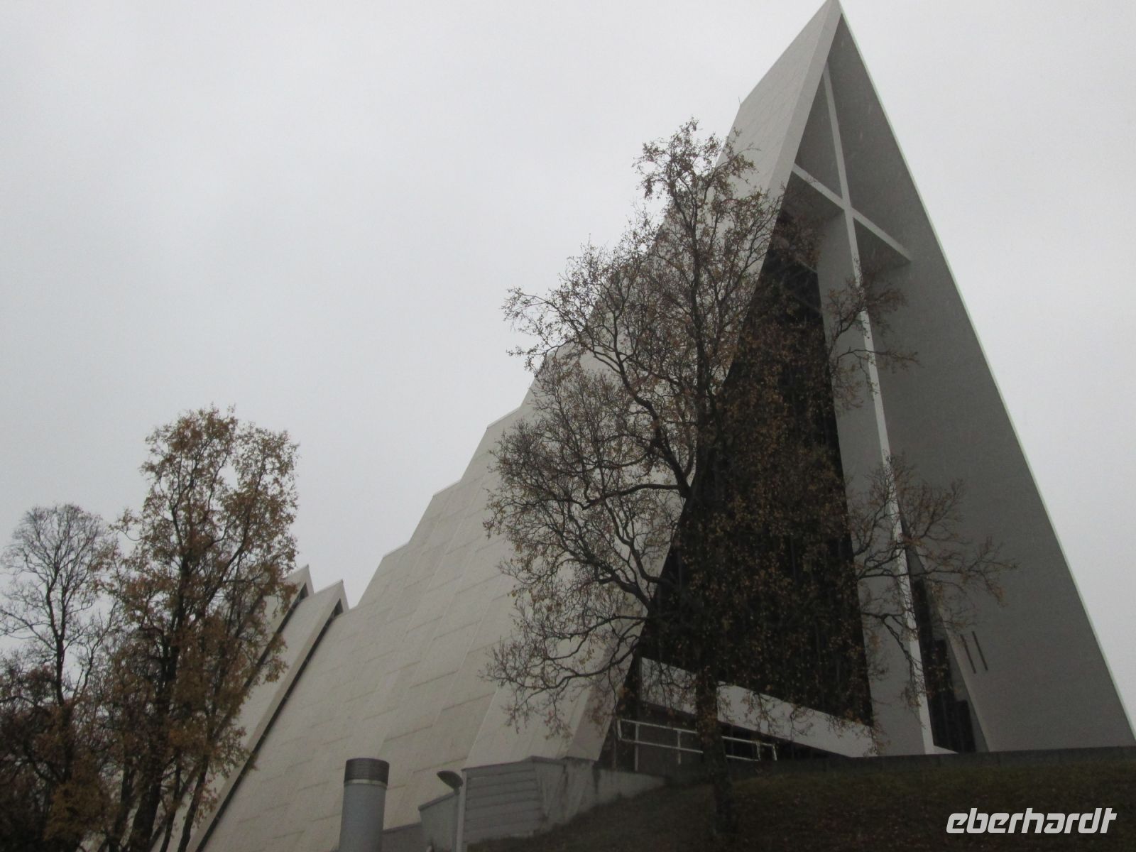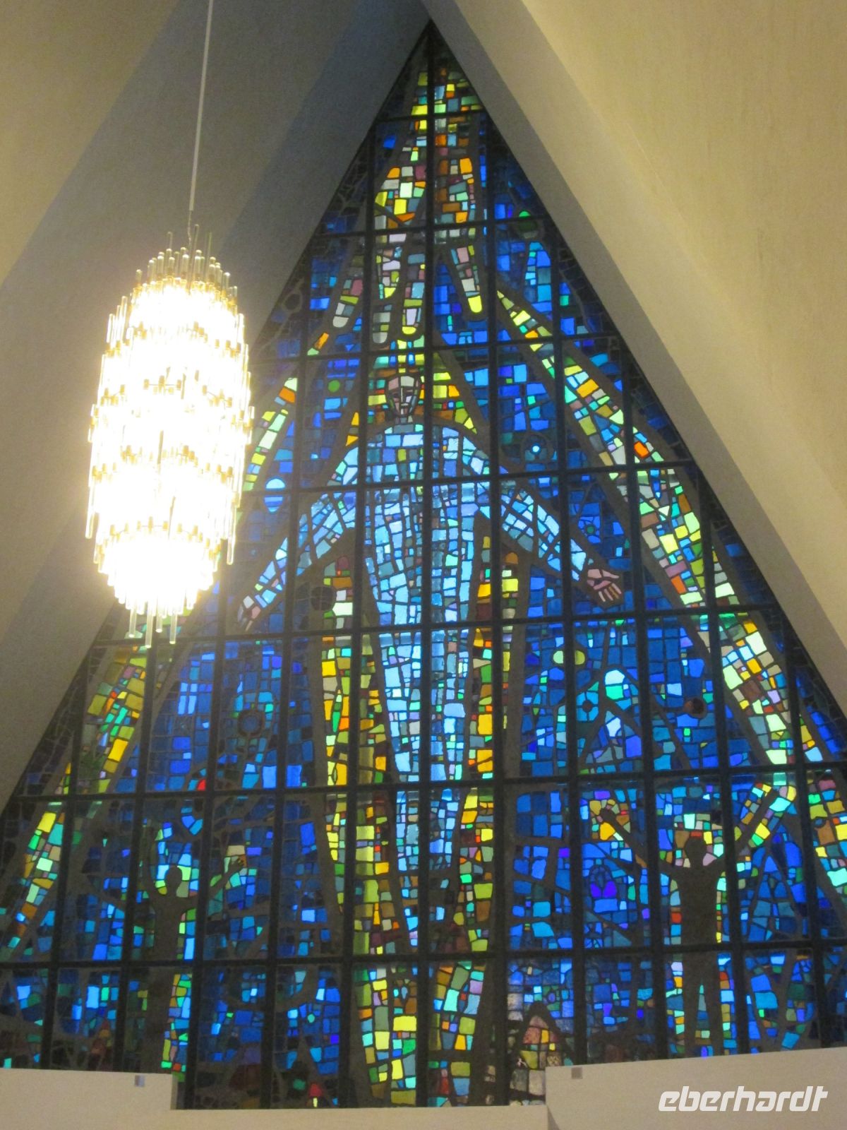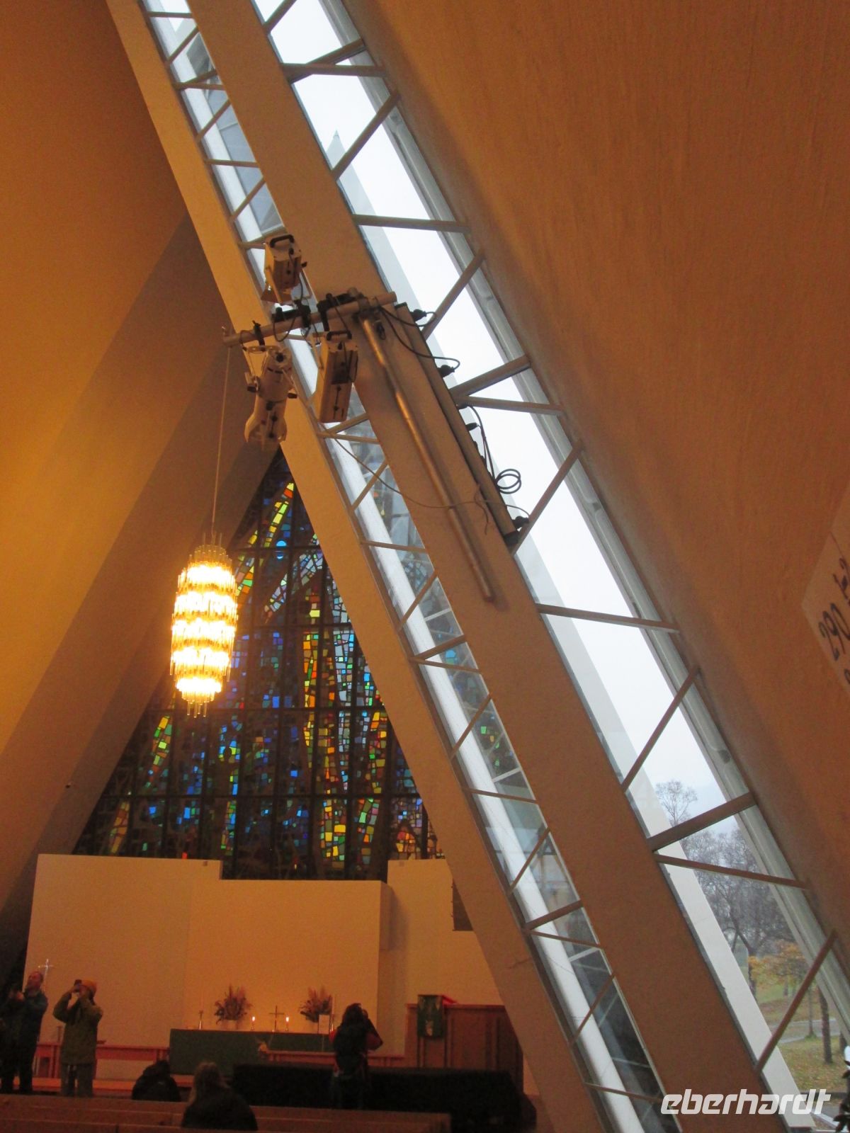 Die Bezeichnung "Eismeerkathedrale" hört man oft, ist aber nicht korrekt. Mit ihrem Aussehen und der weißen Farbe erinnert sie zweifelsohne an einen Eisberg oder ein Stockfischgestell, korrekt ist aber "Tromsdalen Kirche". Erbaut wurde sie in 1,5 Jahren, die Weihe erfolgte am 19.12.1965. Beton ist im Inneren das beherrschende Material, jedoch geben Kronleuchter, die an Eiszapfen erinnern und das 23 m hohe Glasmosaik, in dem der Künstler Victor Sparre 11 Tonnen Glas für seine Darstellung "Christi Wiederkehr in Herrlichkeit" verwendete, einen interessanten Kontrast.