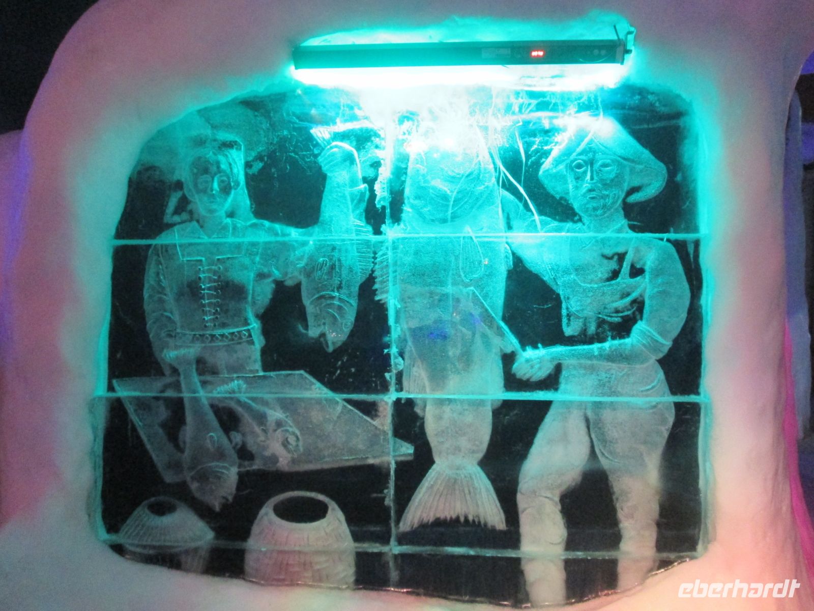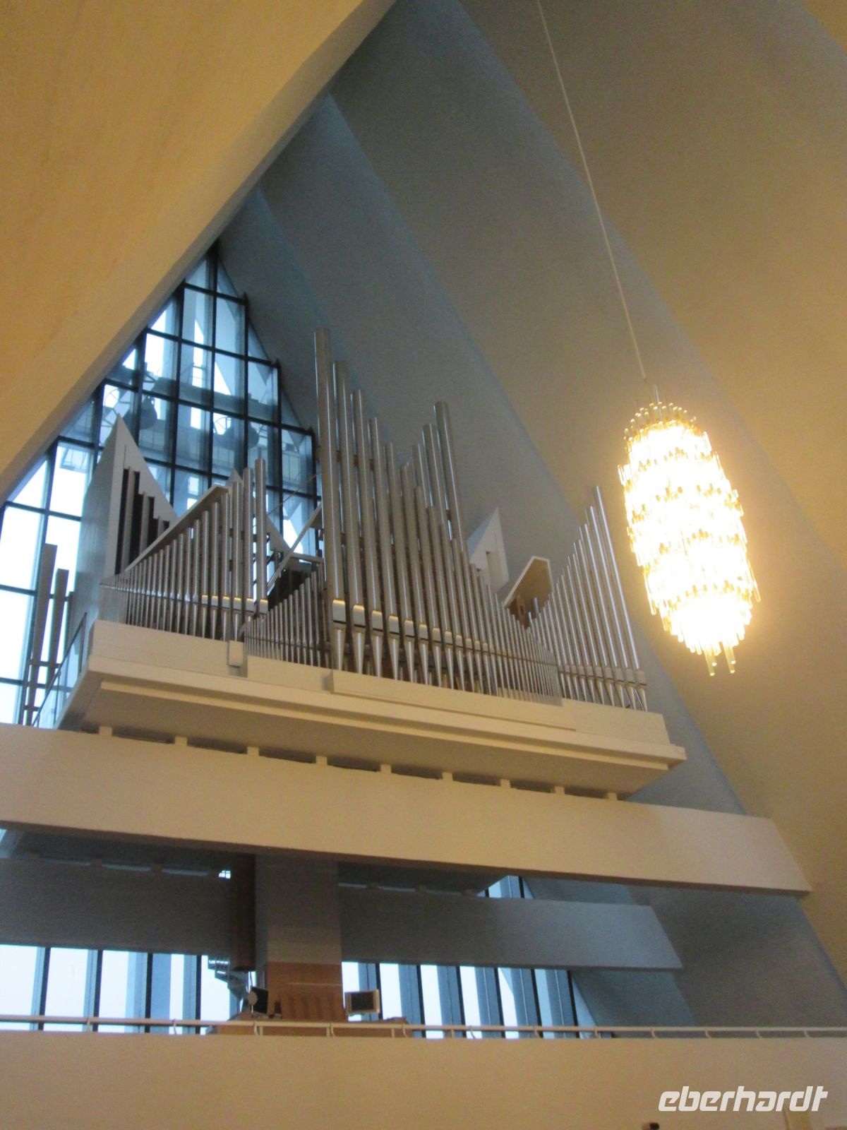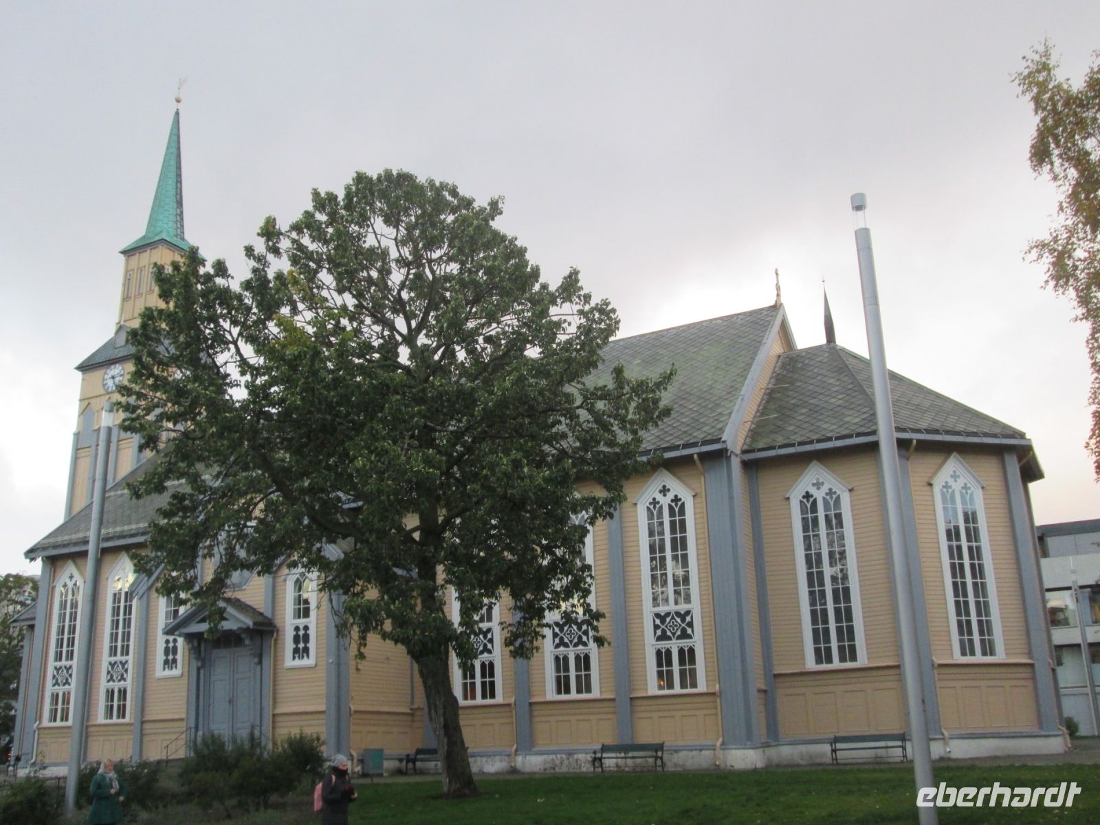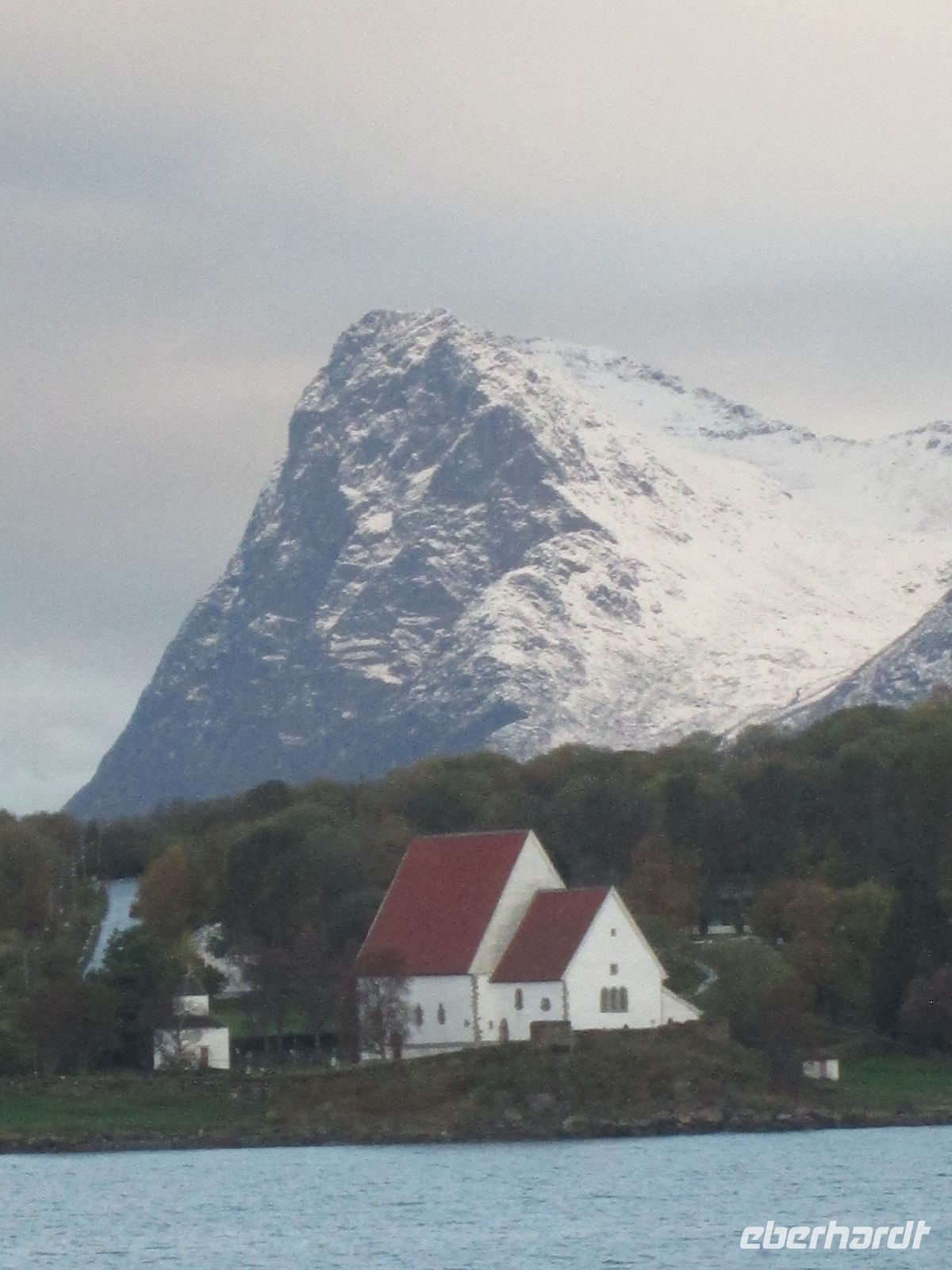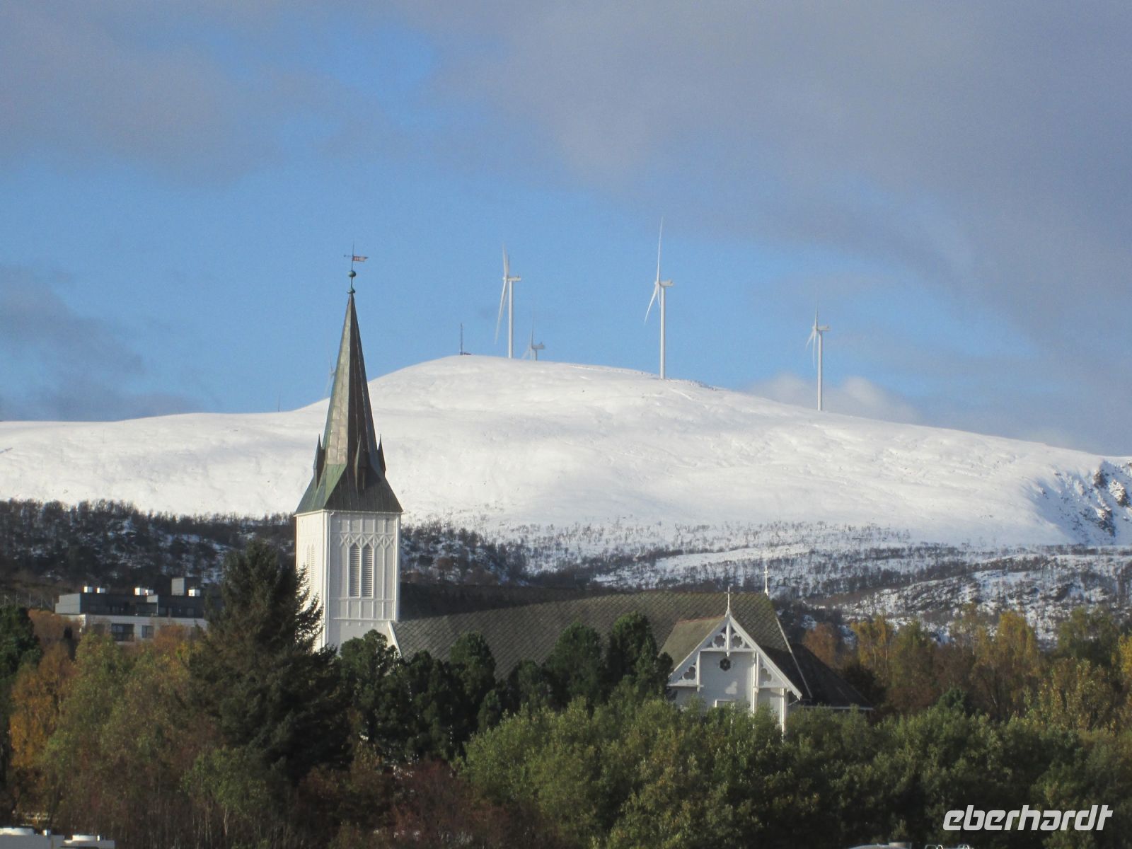 Die Bezeichnung "Eismeerkathedrale" hört man oft, ist aber nicht korrekt. Mit ihrem Aussehen und der weißen Farbe erinnert sie zweifelsohne an einen Eisberg oder ein Stockfischgestell, korrekt ist aber "Tromsdalen Kirche". Erbaut wurde sie in 1,5 Jahren, die Weihe erfolgte am 19.12.1965. Beton ist im Inneren das beherrschende Material, jedoch geben Kronleuchter, die an Eiszapfen erinnern und das 23 m hohe Glasmosaik, in dem der Künstler Victor Sparre 11 Tonnen Glas für seine Darstellung "Christi Wiederkehr in Herrlichkeit" verwendete, einen interessanten Kontrast.
