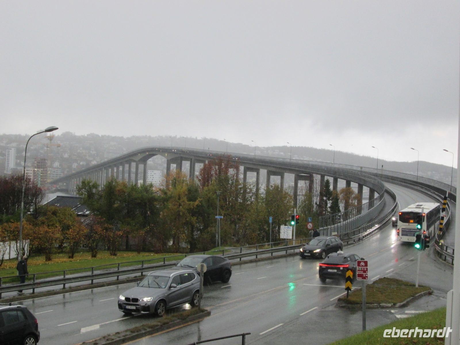 Tromsø liegt auf der Insel Tromsøya, welche durch die 1,1 km lange Brücke mit ihrer Höhe von 36 m mit dem Festland verbunden ist. Da wir auch der berühmten "Eismeerkathedrale" einen Besuch abstatteten, waren wir dort auf dem Festland, im Zentrum der Stadt aber auch der Insel.