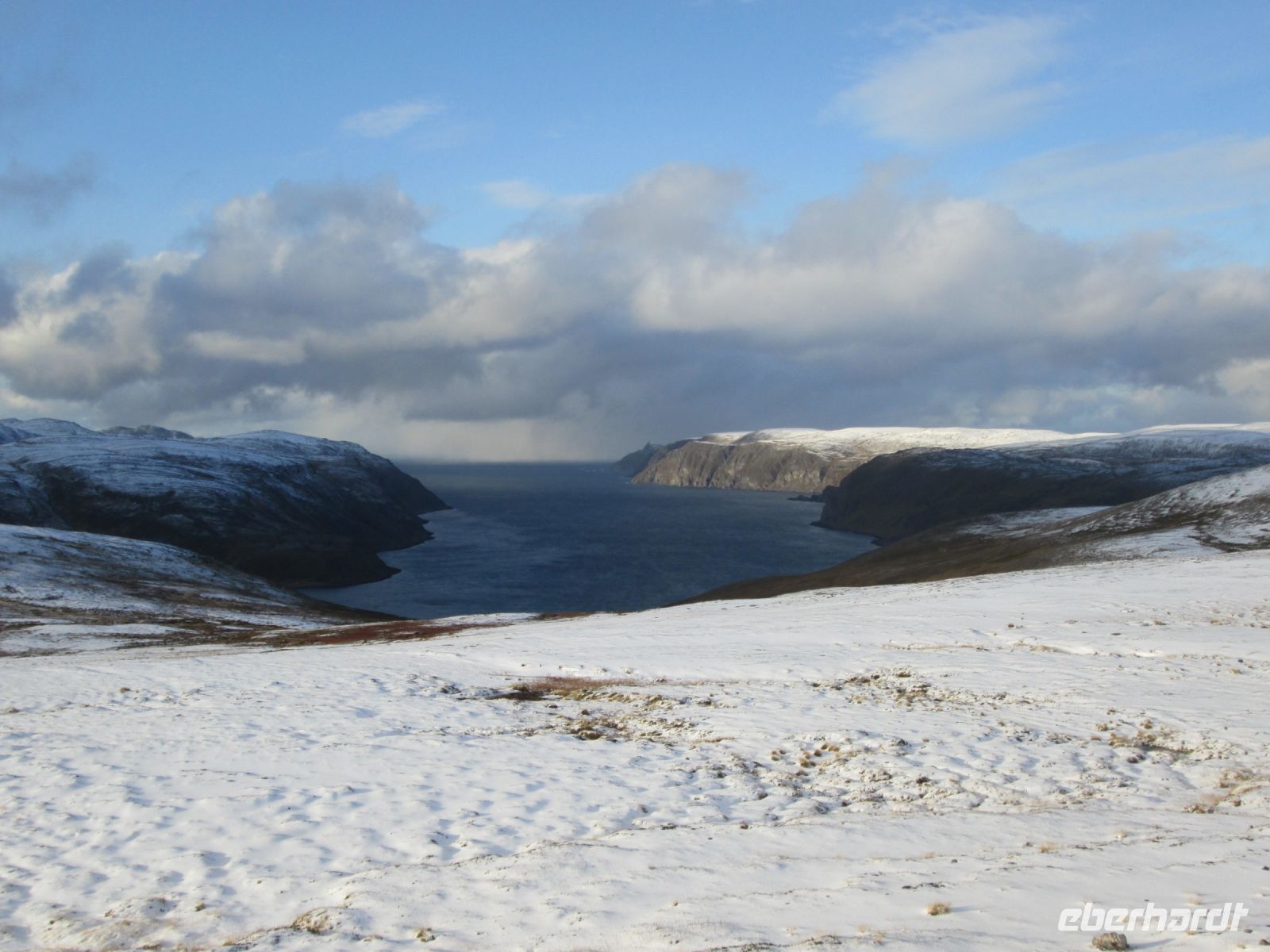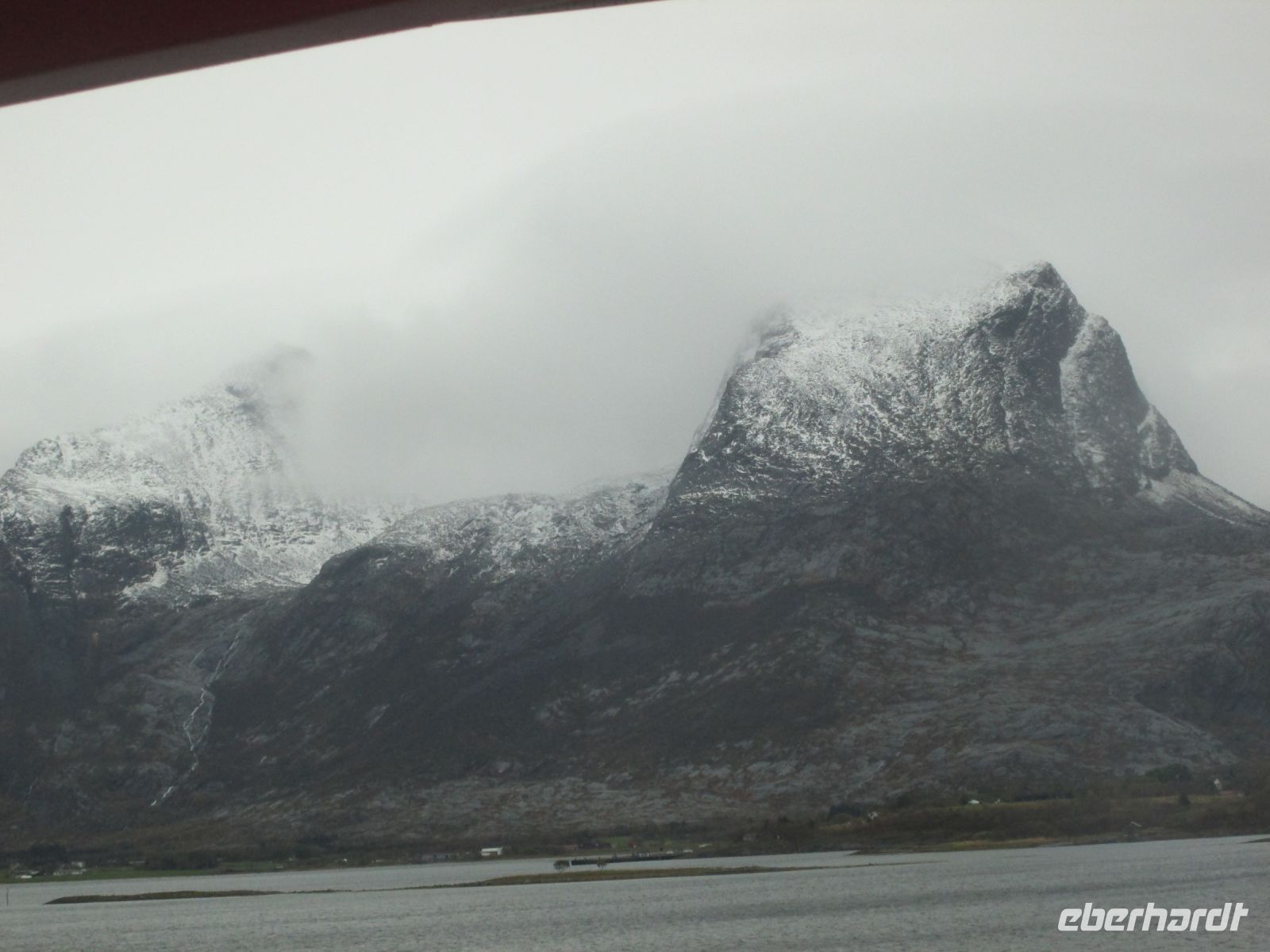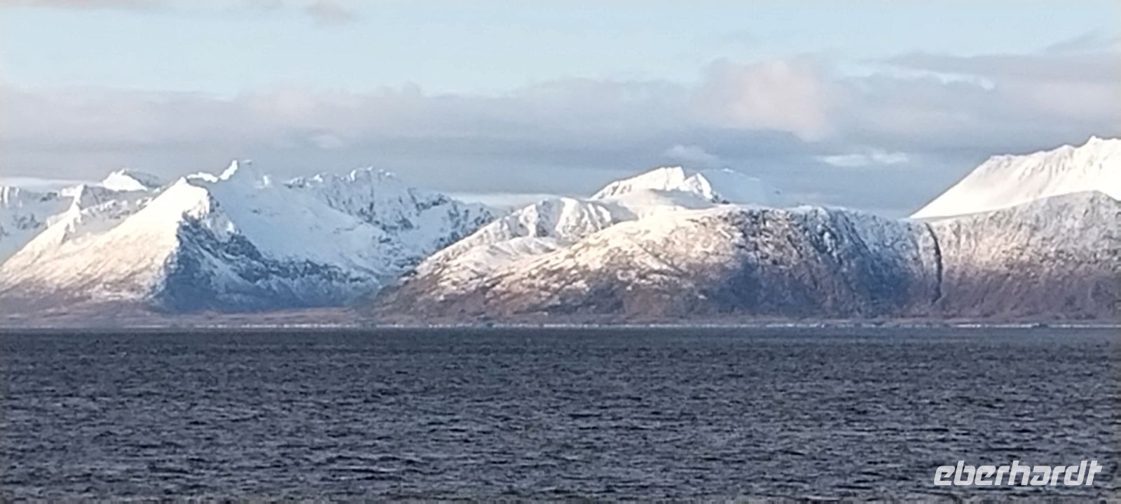 In der Nacht hatte es auf den uns umgebenden Bergen kräftig geschneit, alles erstrahlte in einem weißen Kleid. Das Strahlen hielt nicht sehr lange, es zogen Nebel und Regen auf. Wer kurz in Finnsnes von Bord wollte, musste sich dementsprechend wetterfest kleiden. So gab es ein kurzes Nickerchen, der persönliche Reisebericht wurde aktualisiert oder man traf sich auf ein Gespräch bei Kaffee oder Tee.