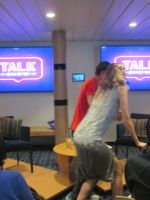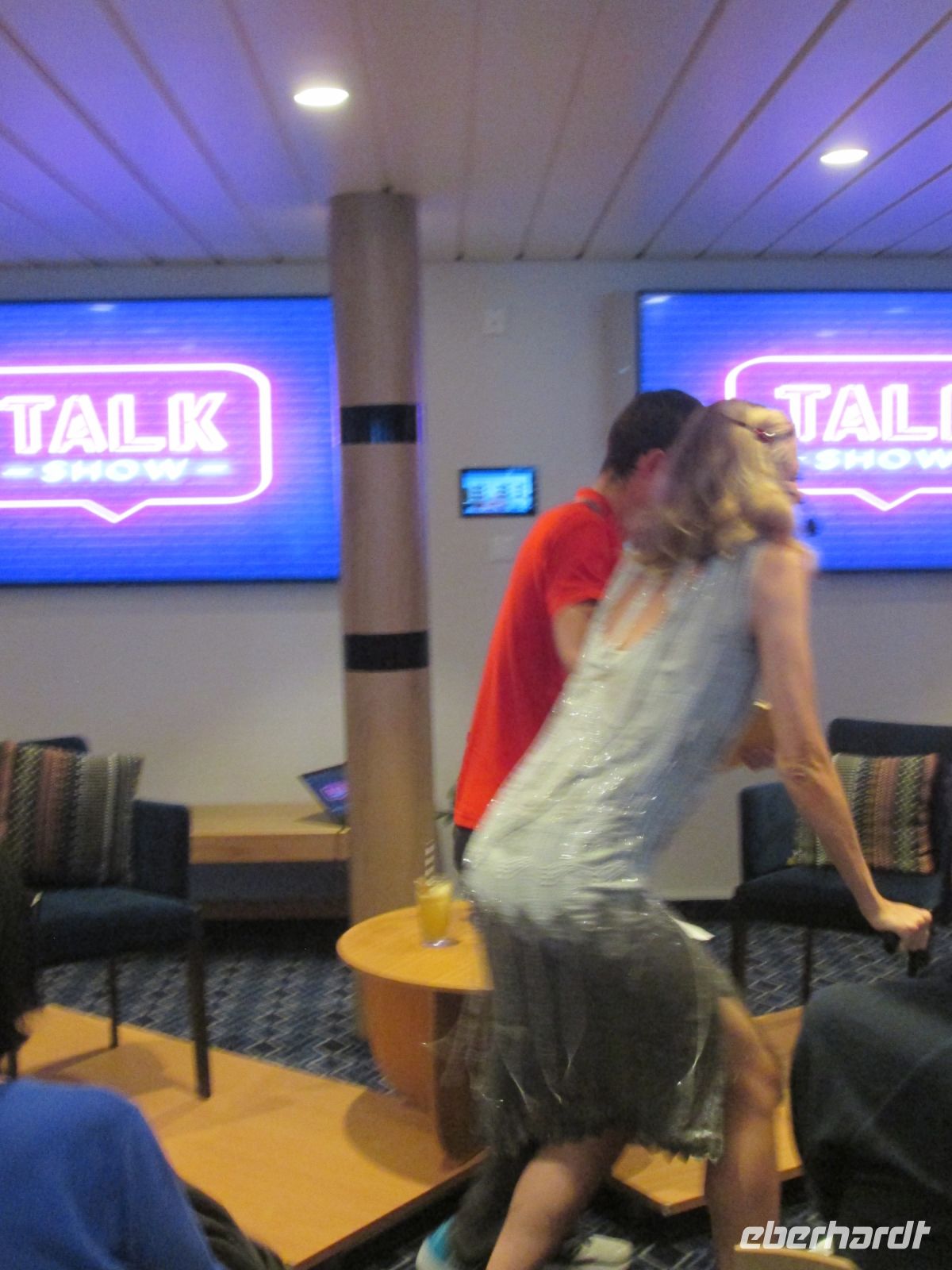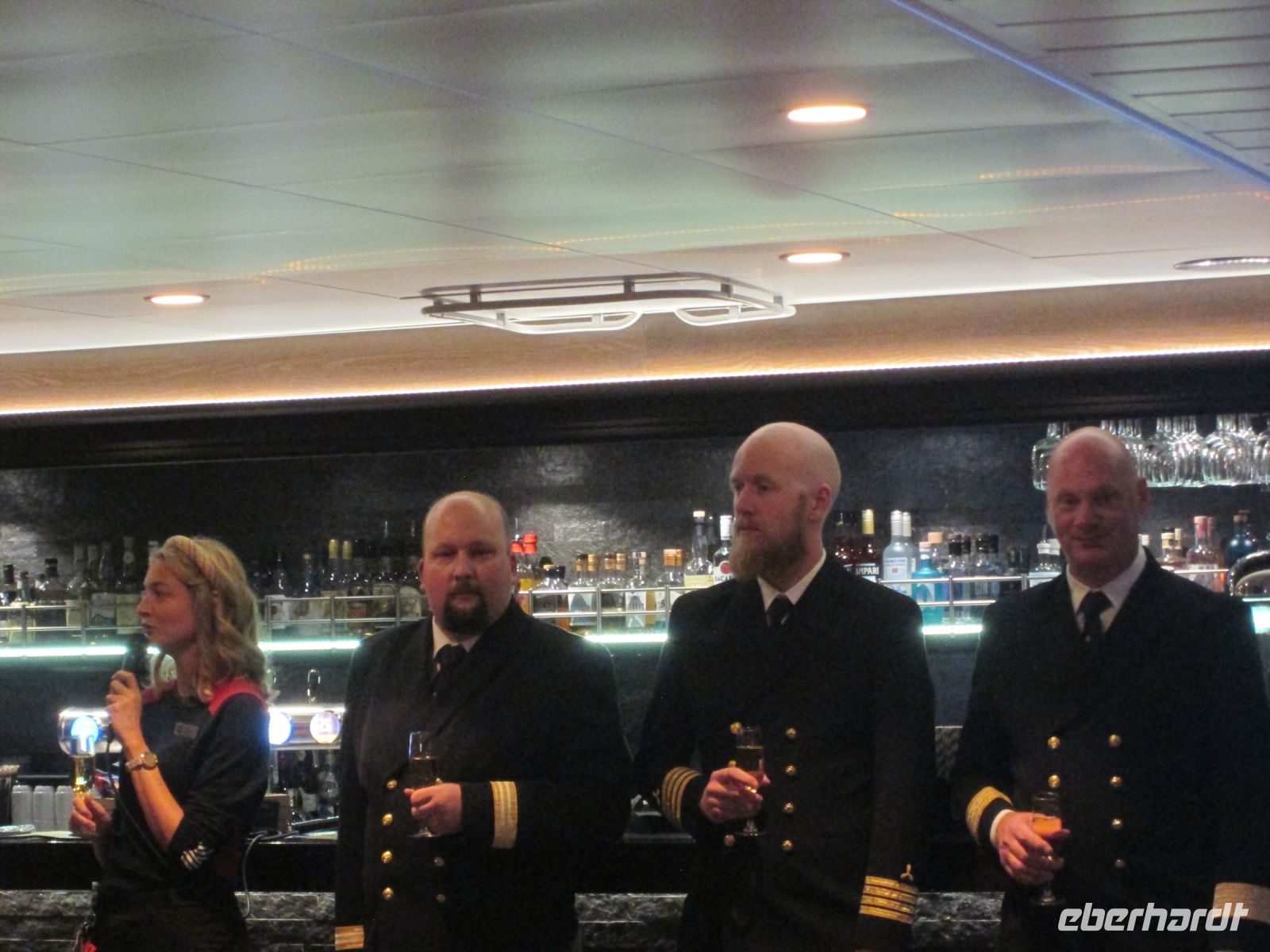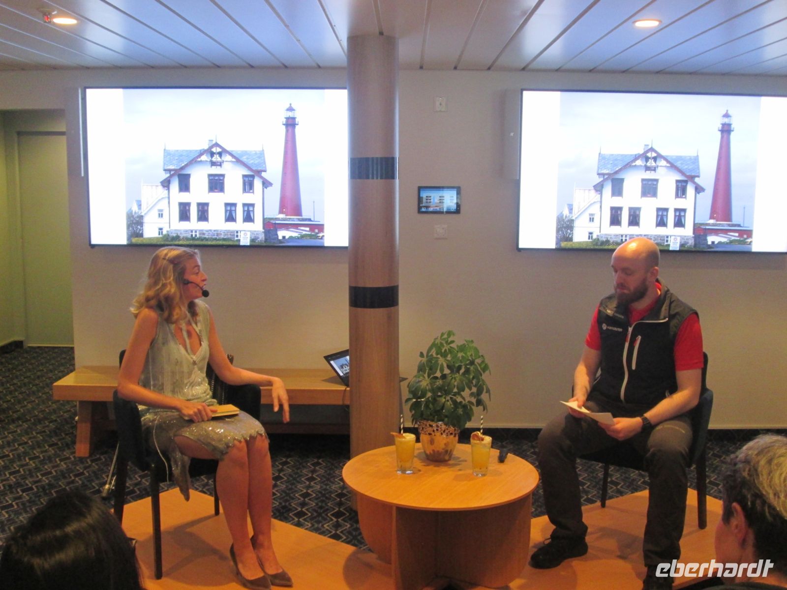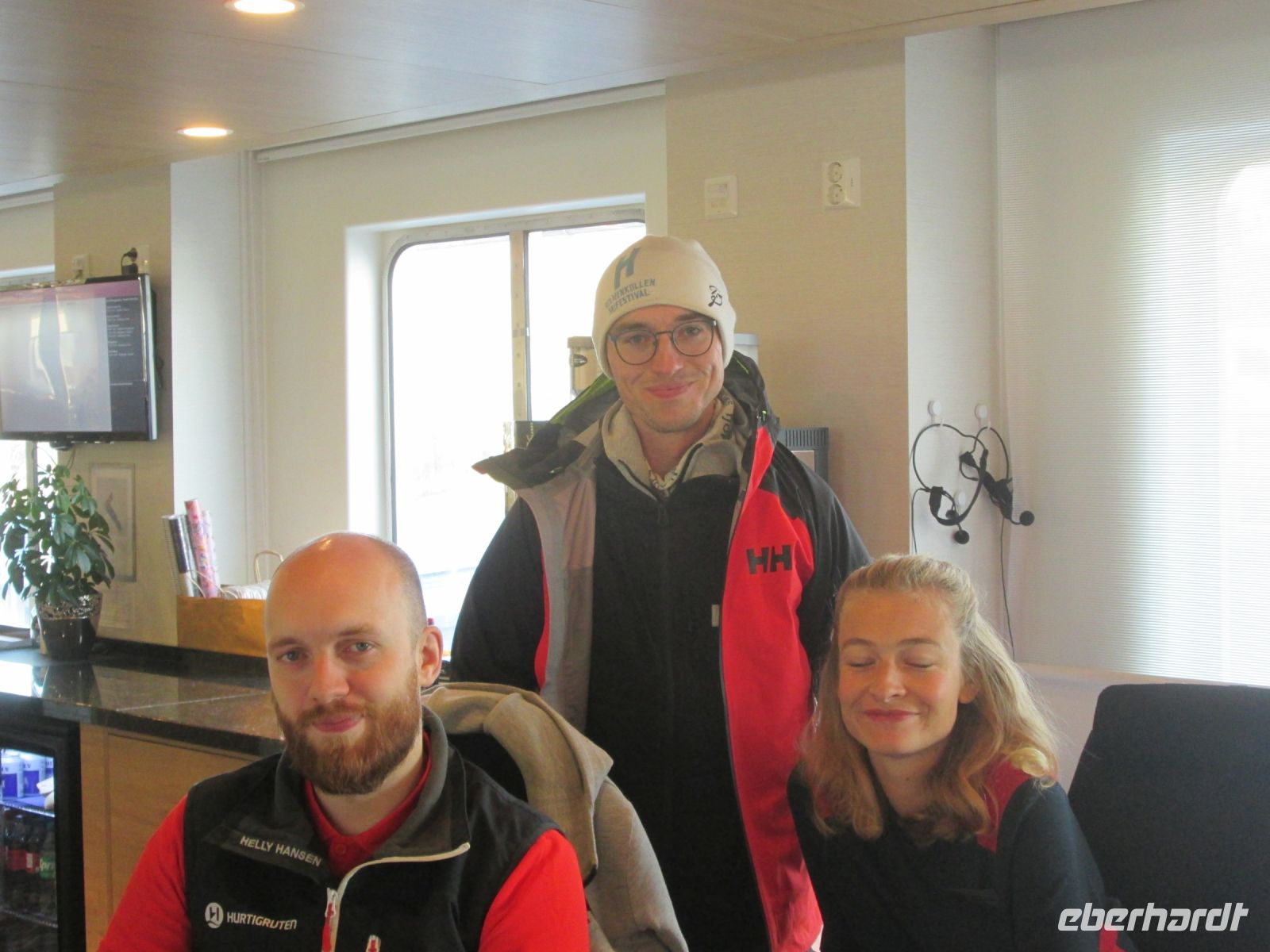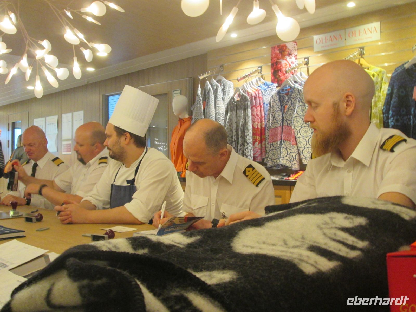 Etwas Besonderes ließ sich am Abend das Expeditionsteam um Svenja, Sven und Emmanuel einfallen: eine Talkshow, geleitet von Sven als Moderator. Aber wer war der Ehrengast dieser Talkshow? In einem silberglänzenden langen Abendkleid kam eine alte Dame, gestützt auf einen Gehstock herein und Jubel, Beifall und Gelächter waren riesengroß. Svenja hatte sich nämlich als älteste Tochter vom Hurtigruten-Mitbegründers Richard With ausgegeben und erzählte uns somit etwas zum Leben ihres berühmten "Vaters" und gab auch einige Anekdoten aus ihrem langen Leben, sie war immerhin schon 139 Jahre alt (!), zum Besten. Ein rundum gelungener Auftritt um die Geschichte von Hurtigruten und ihrem Mitbegründer Richard With! Takk !
