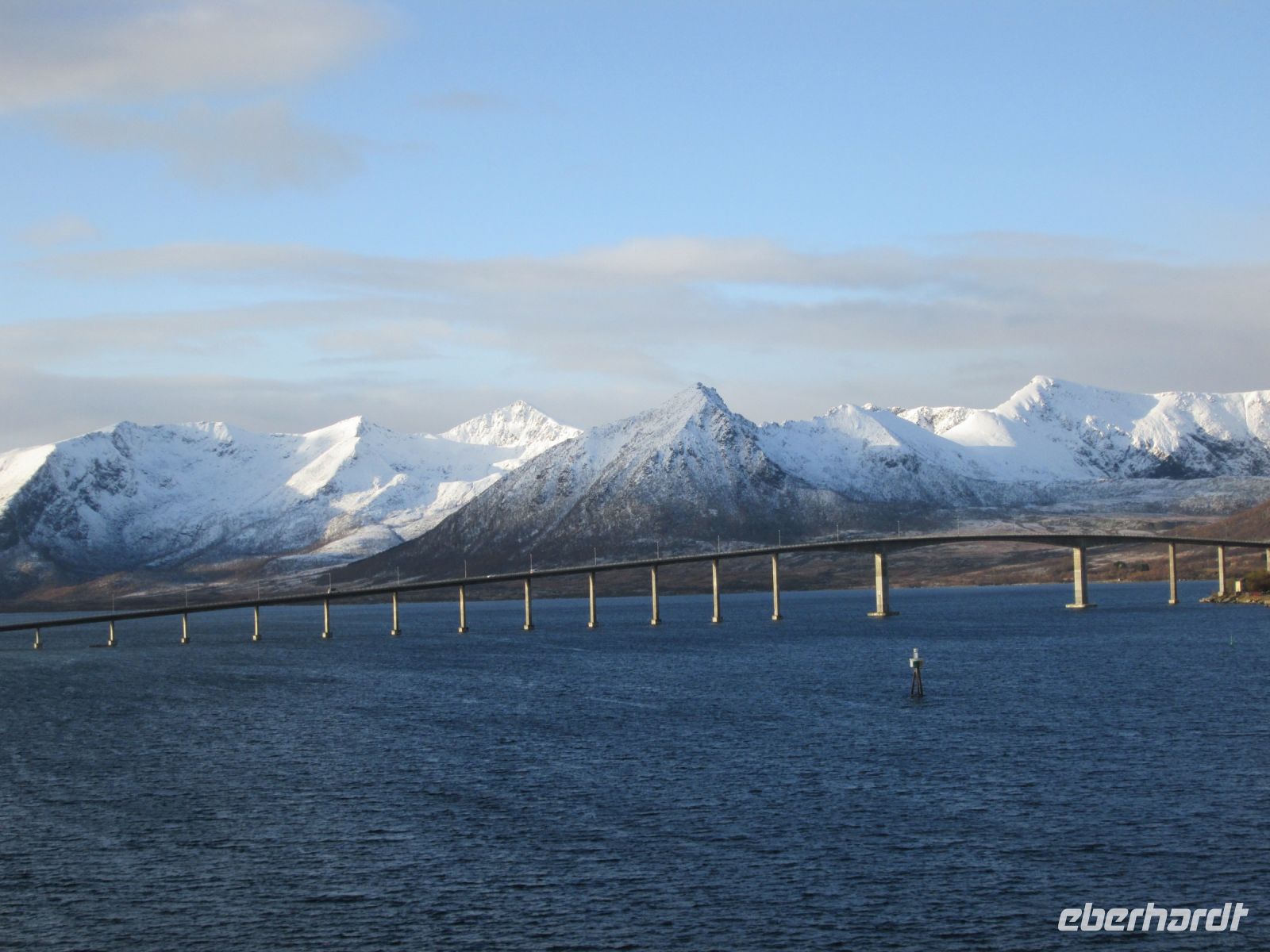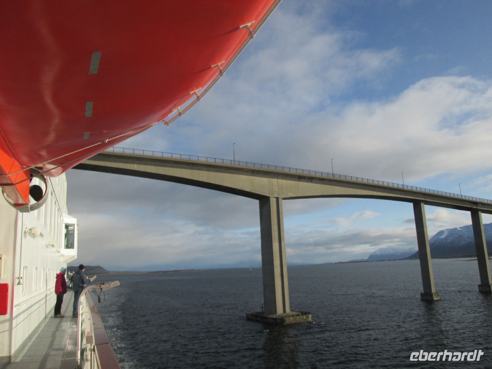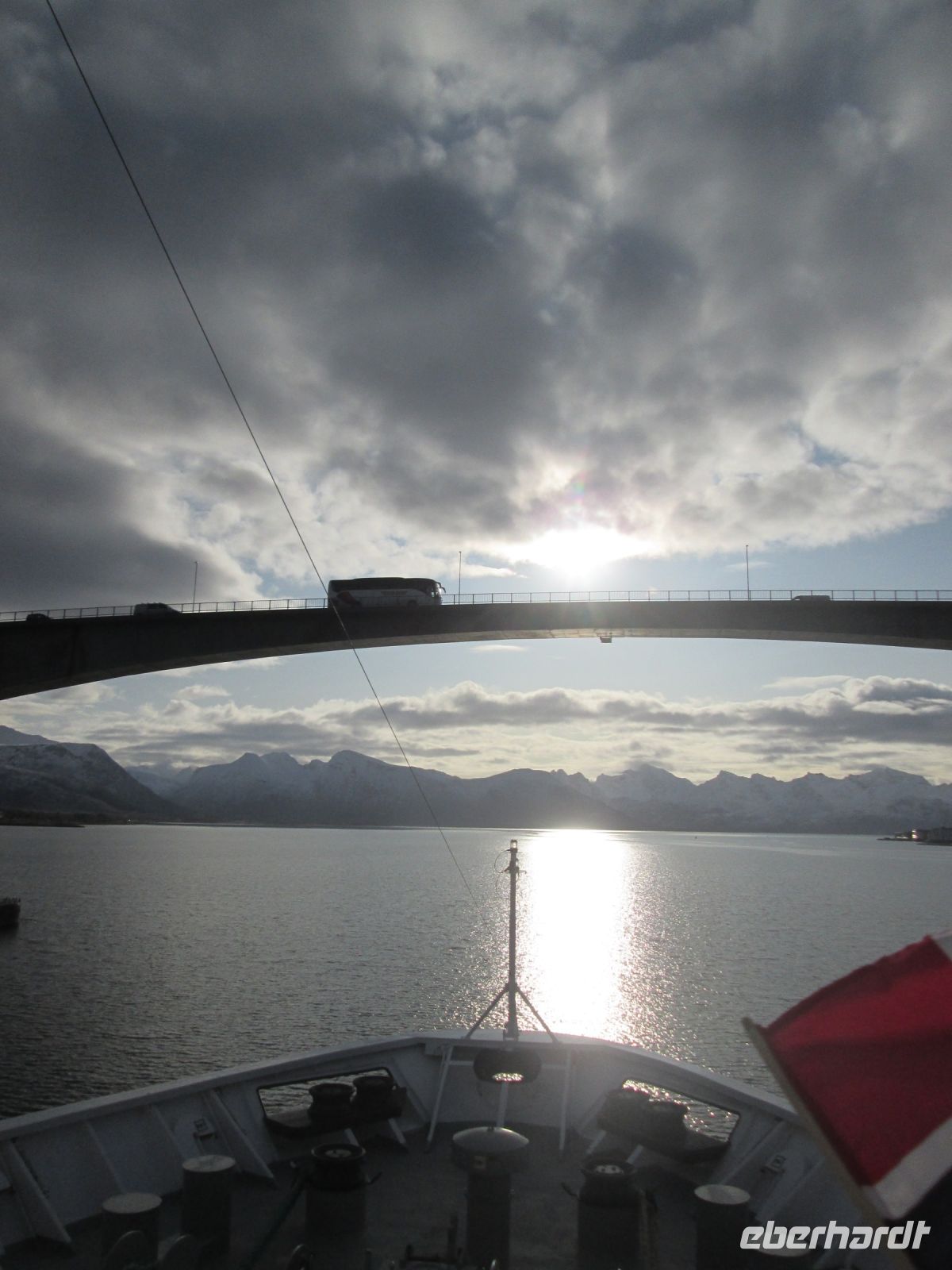 In Sortland gibt es einen wichtigen Posten der norwegischen Küstenwache, was nicht zu übersehen war. Wir nahmen Kurs auf Stokmarknes und passierten die etwa 1 km lange Brücke zwischen den Inseln Langøya und Hadseløya. Pünktlich 10.15 Uhr fuhr unser Schiff unter ihr hindurch und ein Ausflugsbus mit unseren Gästen oben drüber. Natürlich mussten alle winken. Wir kannten uns damit schon aus, bekamen norwegische Flaggen in die Hand, der Buschauffeur oben hupte, der Kapitän ließ das Schiffshorn ertönen, jeder hatte seinen Spaß.