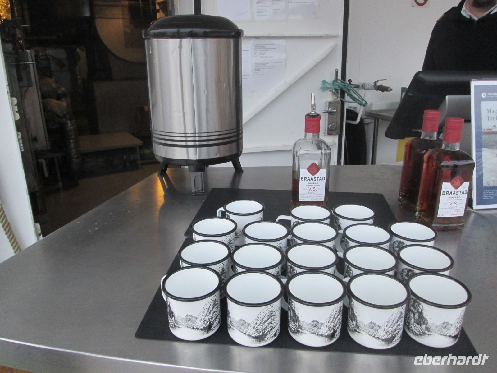 Während wir uns außerhalb des Schiffes etwas die Beine vertraten, fing es stark an zu regnen. Wieder an Bord, war eine Tasse Tee oder Kaffee sehr willkommen.