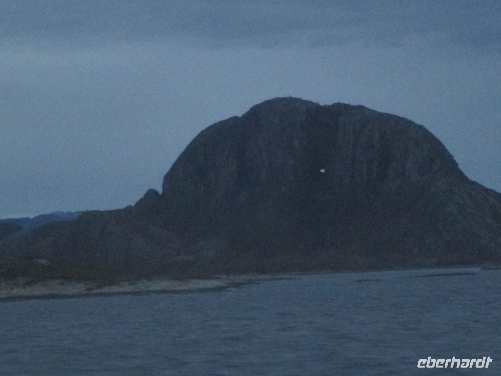 25 m breites Loch im Berg. Wissenschaftler meinen dass das Loch vom Meer ausgehöhlt wurde, als das Land einst tiefer lag. Viel schöner ist dagegen die Sage: Vågekallen saß auf den Lofoten hinter Henningsvær und sehnte sich nach einer Frau. Bei den Damen an der Küste hatte er kein Glück. Eines Nachts aber kamen die 7 Schwestern. Sie waren ihrem Vater, dem Trollkönig Suliskongen, davongeschlichen und tanzten nackt um den Fjord. Die Nanny der 7 Schwestern, Lekamøya, war gerade nach Tjøtta gegangen, um Fladenbrot zu backen. Diese Chance wollte Vågekallen nutzen. Er stieg aufs Pferd und ritt in wildem Galopp nach Süden. Die Schwestern flohen, verfolgt von Vågekallen. Der erwachte Hestmannen, ein anderer Troll, schoss einen Pfeil nach Süden, was von Brønnøykongen gesehen wurde, und er warf seinen Hut dazwischen. Alle vergaßen den nahenden Sonnenaufgang und wurden zu Stein. Somit ist der durchlöcherte Hut des Brønnøykongen heute der Berg Torghatten auf der Steuerbordseite. Auf der Backbordseite sahen wir in den Wolken die 7 Schwestern .