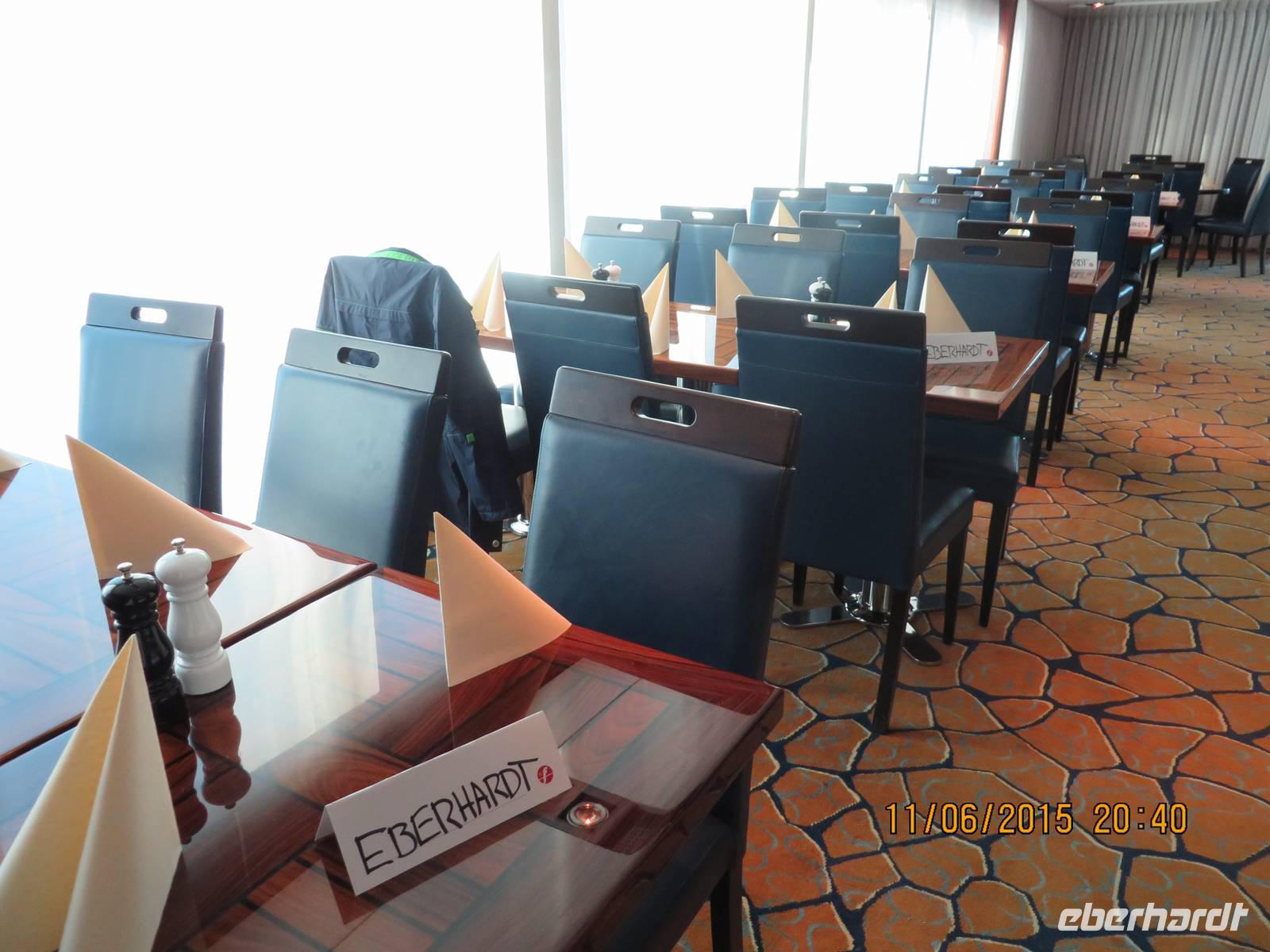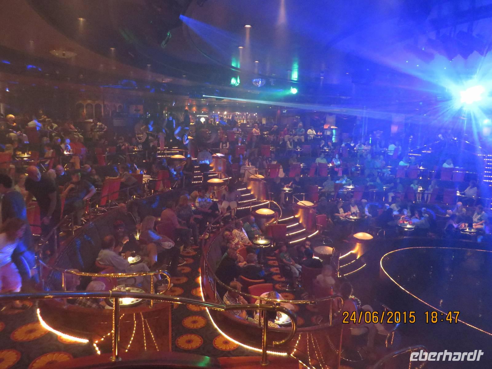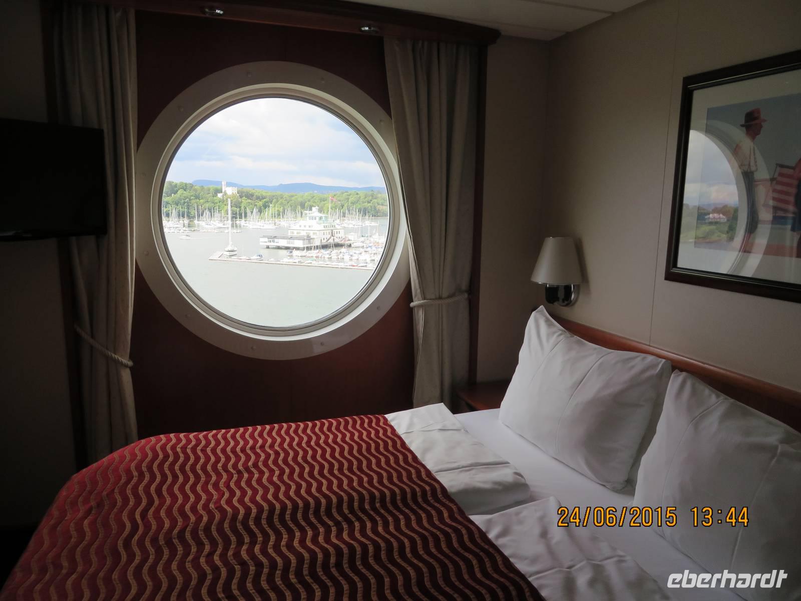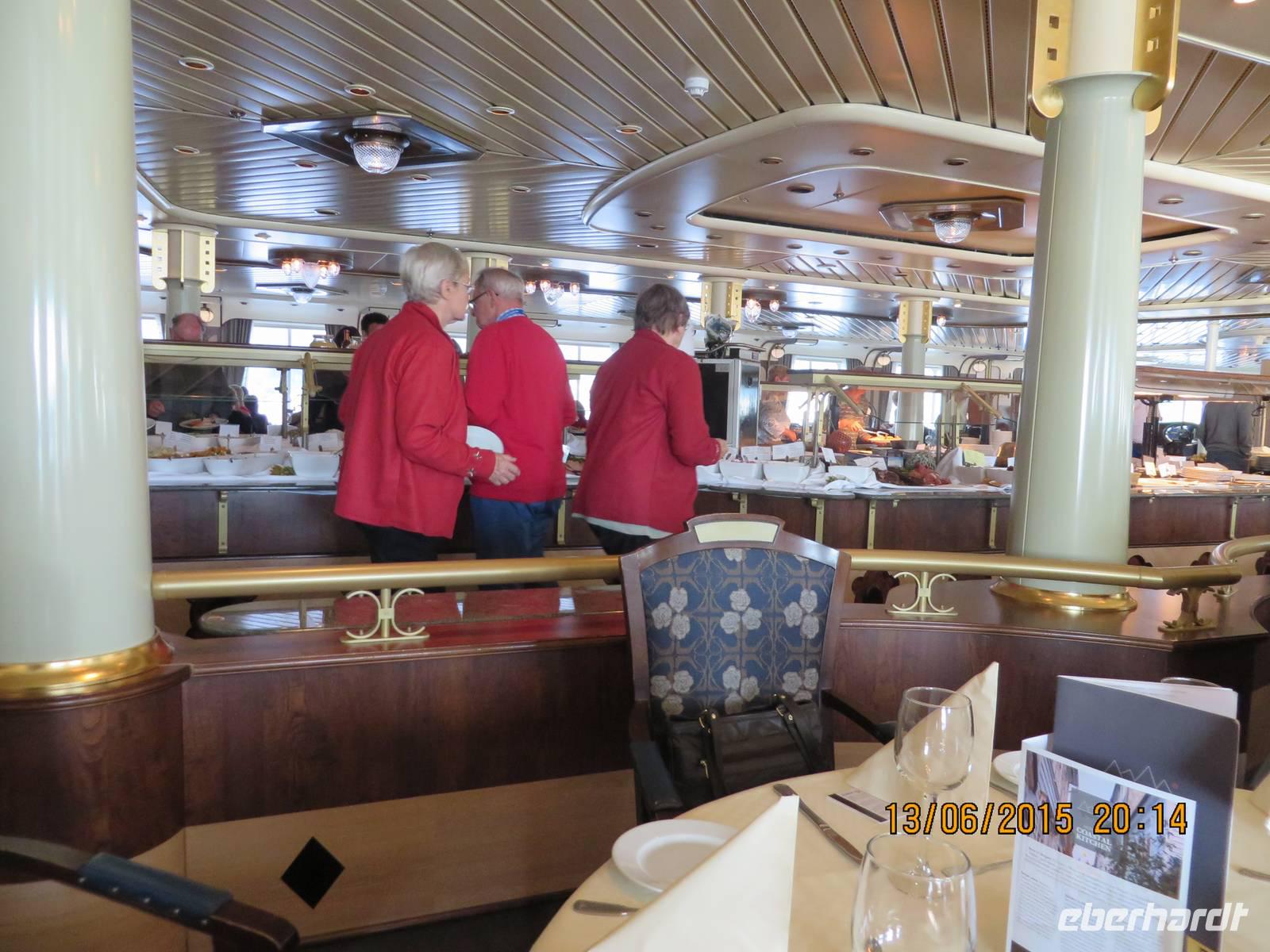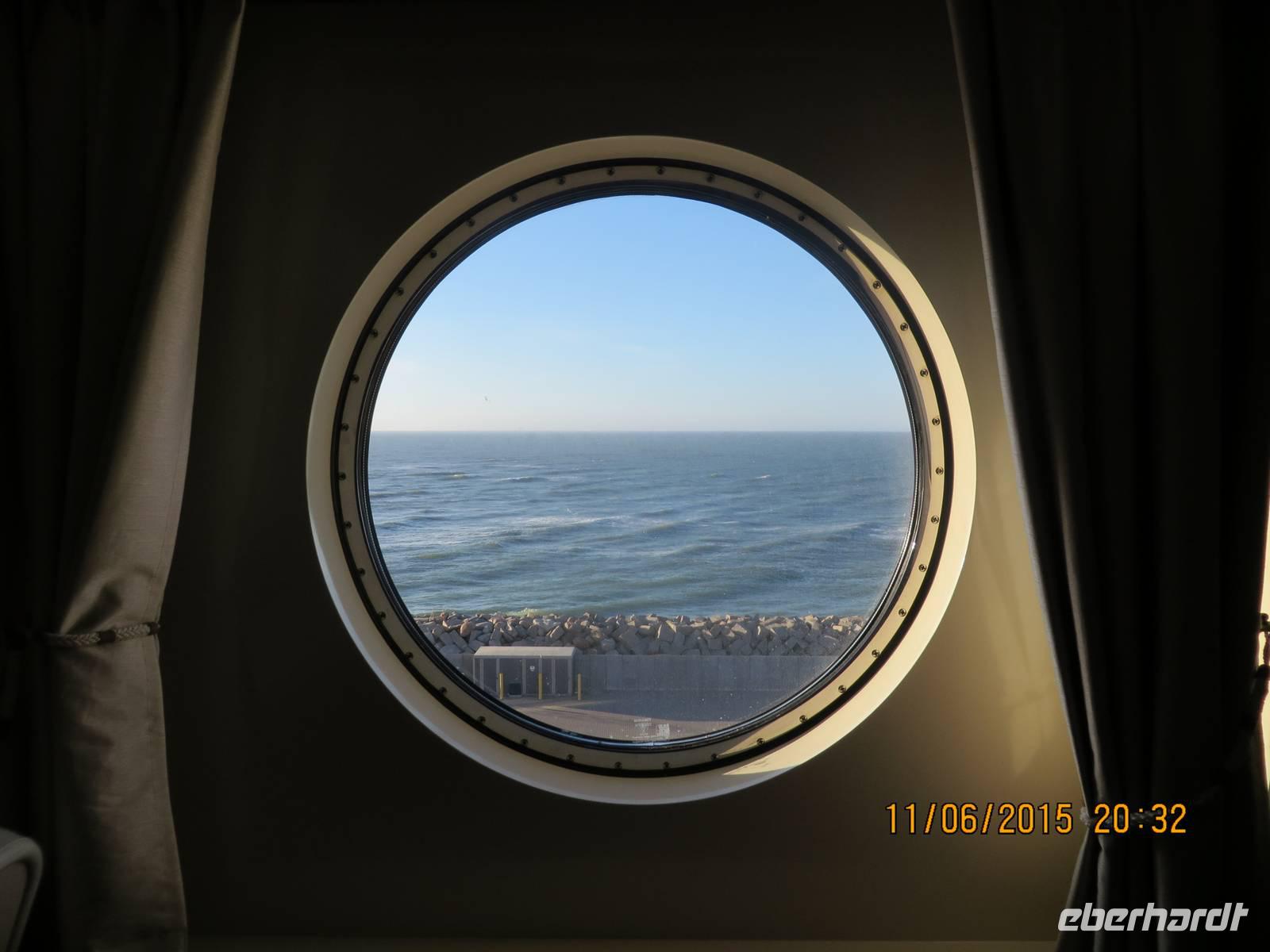Auf der Color Fantasy haben alle eine Außenkabine mit gewaltigem Bullauge. Das Schiff hat eher Kreuzfahrtcharakter als das es einer Fähre gleicht. Auf Deck 7, wo wir einschiffen, befindet sich eine Shoppingmeile und mehrere Kneipen und Cafés. Ein halbes Deck tiefer unser Grand Buffet Restaurant, wo wir ein köstliches Abendessen einnehmen. Anschließend erwartet uns das Theater mit einer bunten Show.