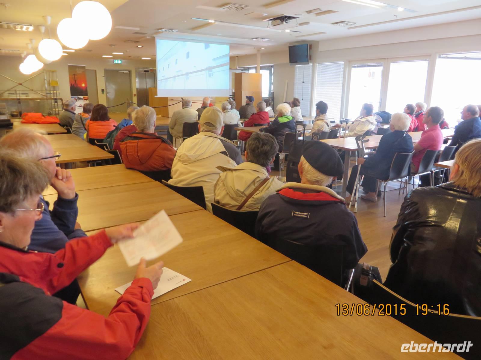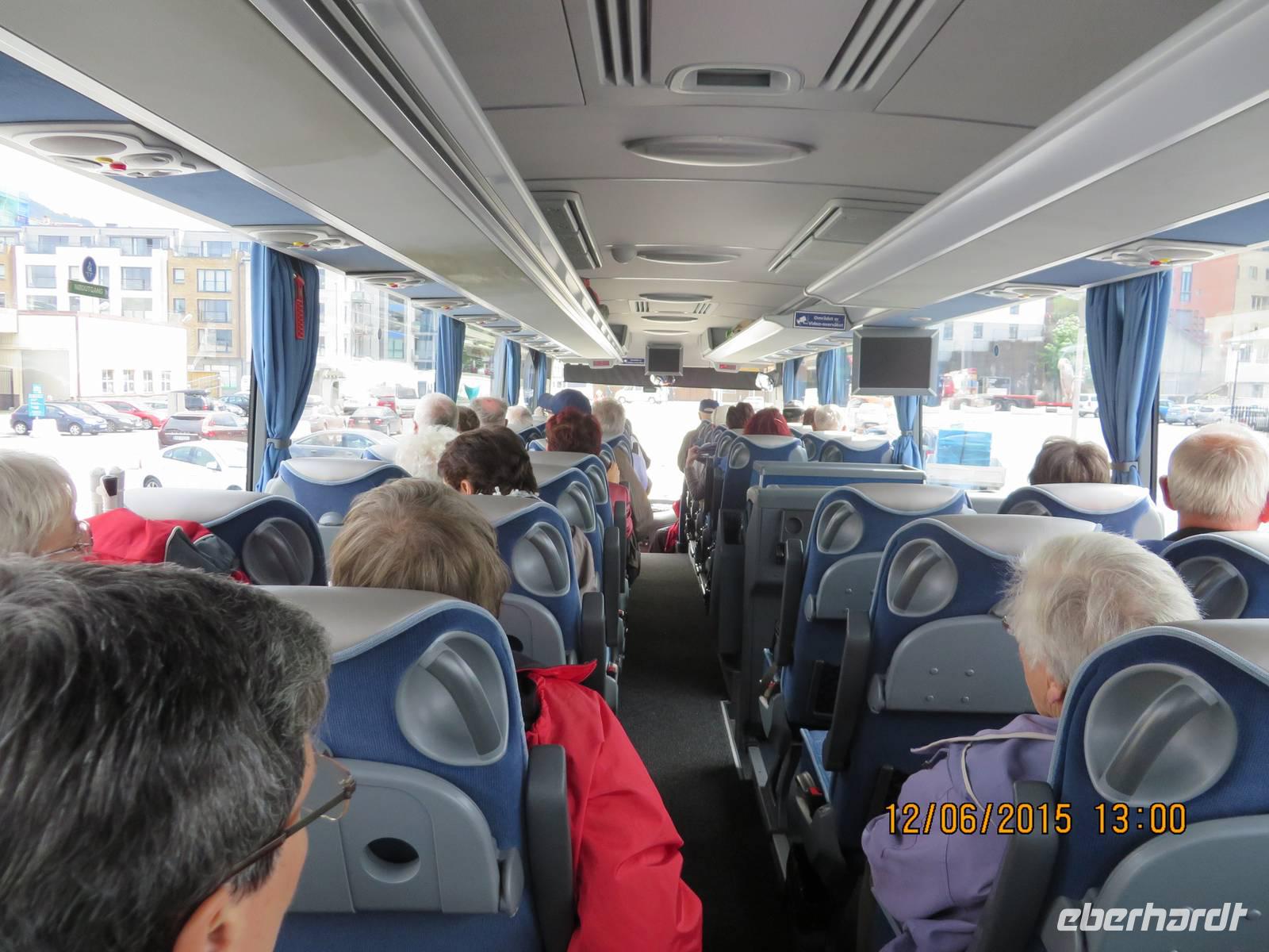 6.30 Uhr: Die Lautsprecherdurchsage in jeder Kabine weckt uns energisch. Wir kommen gleich in Stavanger an und wer aussteigen will, soll sich bereit machen. Einigen von uns fährt der Schreck durch die Glieder. Halb verschlafen, denken wir zuerst, wir wären gemeint und hätten den Ausstieg verpasst. Aber recht schnell klärt sich der Irrtum auf und wir können uns nochmal in der Koje umdrehen oder in Ruhe auf das Frühstück vorbereiten, denn wir steigen ja erst in Bergen aus. Im Restaurant lassen wir es uns schmecken. Um zehn gibt es eine weitere freundliche Lautsprechansage, die uns darüber informiert, dass wir bis 10.30 Uhr aus den Kabinen ausgezogen sein sollen. Mit samt unseren Koffern begeben wir uns auf Deck 7, um dort die nächsten zwei Stunden bis zur Ankunft zu verbringen. Es sitzt sich gemütlich, die traumhafte Landschaft zieht an uns vorbei und weckt schon Vorfreude auf die kommenden Tage. Pünktlich 12.30 Uhr legen wir an. Über Rolltreppen und Fahrstühle gelingt es relativ unkompliziert, das Gepäck zum Ausgang zu befördern. Unsere Stadtführerin ist bereits da und wedelt fröhlich mit einer Sonnenblume. Es handelt sich um eine ausgewanderte Schwäbin mit ansteckendem Humor. Nachdem auch unser Bus eingetroffen und das Gepäck verstaut ist, beginnt unsere Stadtrundfahrt in Bergen mit einem Besuch des Fischmarktes. Ein leichtes Hüngerchen soll hier gestillt werden. Die Preise sind saftig, aber sonst schmeckts. Anschließend führt uns Angie durch Bergen, wir lernen das Stadtzentrum kennen und das Brüggeviertel mit seinen außergewöhnlichen Holzhäusern. Traumhaft muss es am ersten Advent auf dem Hauptplatz sein, wenn tausende Berser im Fackelschein Weihnachtslieder singen und die Stadt mit Kerzen erleuchtet ist. Nach drei Stunden verabschieden wir uns und beziehen unsere Hotelzimmer im Scandic City Hotel. Nachdem ein paar Miniproblemchen mit Zimmern geklärt sind, ist Freizeit angesagt. Erst um 19 Uhr treffen wir uns zum Abendessen wieder. Dass es im gegenüberliegenden Teil des Hotels stattfindet, macht uns weniger aus, als die enge Bestuhlung. Trotzdem ist das Essen vom Buffet köstlich und das Bier zu 10 € pro halben Liter schmeckt auch. Nachdem wir uns über den Plan für den nächsten Tag verständigt haben, begeben wir uns zur Nachtruhe.