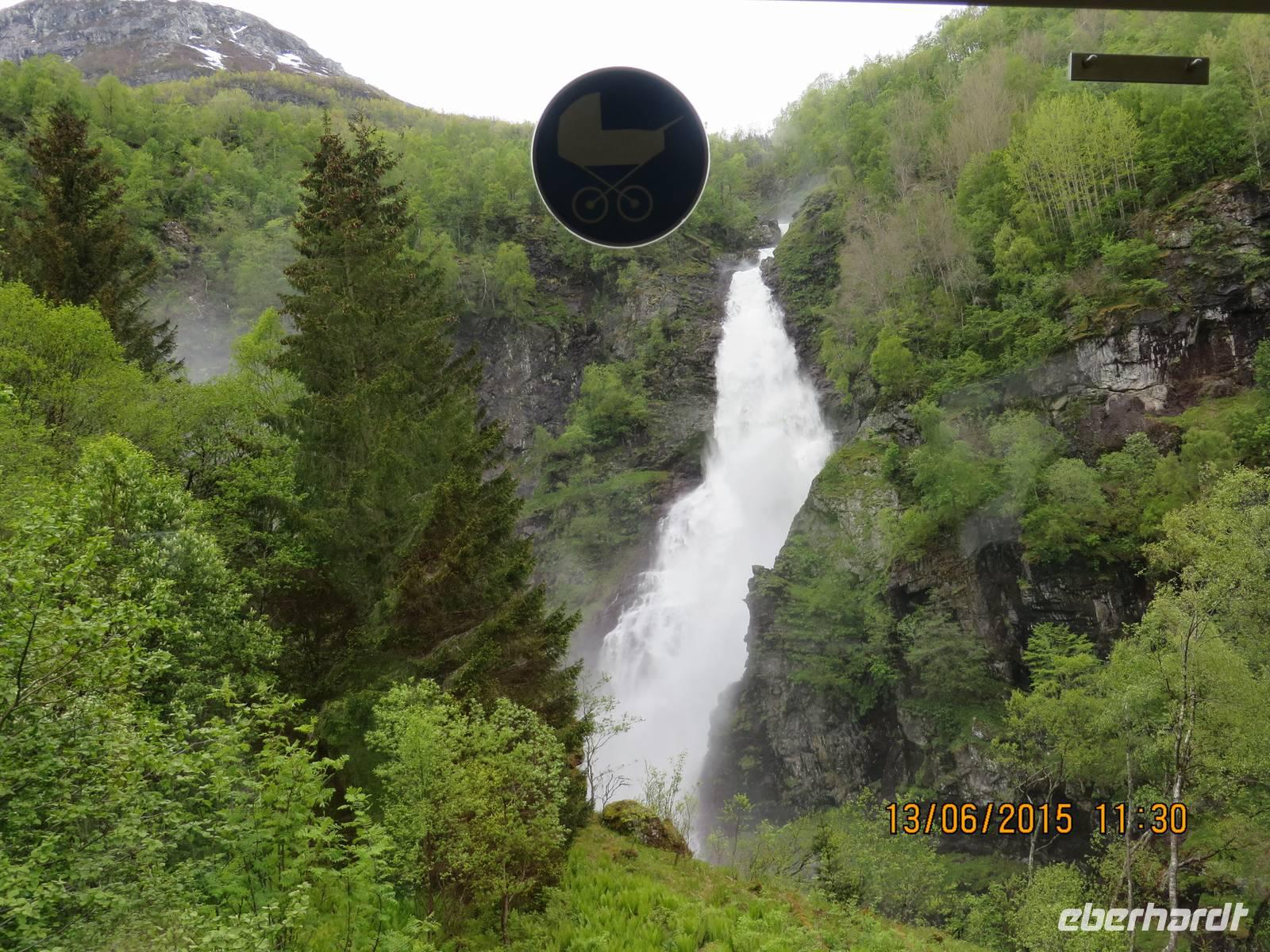 Überpünktlich steht Viertel vor Acht unser goldgrüner Bus vor dem Hotel. Na dann kann ja nichts mehr schief gehen. Auch am Bahnhof sind wir zeitig genug, um uns zu orientieren und das lt. Fahrplan vorgesehene Gleis 4 zu inspizieren. Glücklicherweise studieren wir trotzdem die Anzeigetafel und siehe da, der Zug fährt ab Gleis 2. Auch gut. Wir fragen uns durch und erfahren, dass sich unser Wagon am Ende des Bahnsteigs befindet. Auch das tut der guten Laune keinen Abbruch, wir freuen uns auf die Fahrt mit der Bergenbahn nach Voss. Das Abteil ist groß genug für alle und zwischen den für uns reservierten Plätzen sind sogar noch einige frei, auf die sich munter immer mehr andere Passagiere niederlassen. Eben ein Regelzug und nicht ausschließlich für Touristen. Gespannt erwarten wir die schönen Aussichten, die jedoch auf der ersten Hälfte ziemlich verdunkelt sind, denn es geht von einem Tunnel in den anderen. So eine Eisenbahnstrecke ist eben ein gigantisches Bauwerk und solche Tunnel muss man erstmal bauen können. Zum Ende werden es aber weniger Tunnel und es gibt auch etwas zu sehen. Kurz vor Zehn kommen wir in Voss an. Während alle anderen aufgeregt aus der Bahn stürzen, haben wir, in der Annahme, wir hätten einen eigenen Bus, die Ruhe weg. Ich bitte die Gruppe, zu warten, bis ich unseren Bus ausfindig gemacht habe. Leider ist bei den vielen Bussen, die tatsächlich auf dem Bahnhofsvorplatz stehen, keiner für uns dabei. Die erste Idee der völlig überforderten Busfahrer ist, dass wir uns auf die Busse aufteilen sollen, denn es wären noch Plätze frei. Nicht gerade glücklich sind wir trotzdem bereit, das zu versuchen, scheitern jedoch kläglich an der mangelnden Platzzahl. Wieder steht die ganze Gruppe vor den Bussen, anstatt drinnen zu sitzen. Der Chef der Busfahrer telefoniert aufgeregt und verkündet nach einer viertel Stunde, dass noch zwei Busse kommen werden. Diese Nachricht ereilt auch die anderen gestrandeten Passagiere, die sich gierig in den uns zugeteilten Bus stürzen. Trotz energischem körperlichen Einsatzes gelingt es uns nicht, für alle Plätze im Bus zu erobern. Der auf diesen Missstand hingewiesene Busfahrer ist abgeklärt und stellt uns vor die Wahl, entweder stehend fahren oder den Bus wechseln. Da wir nun entschlossen sind, die Gruppe nicht mehr trennen zu lassen, fahren ein Gast und ich stehend, eine Dame sitzt auf der hinteren Bank in der Mitte eingequetscht und zwei Gäste haben es sich auf den Notklappsitzen gemütlich gemacht. Trotz dieser Einschränkungen ist die Fahrt eine Wucht. Die Stahlheimskleivene entpuppt sich als eine Straße mit zahllosen engen Haarnadelkurven, die vom Busfahrer meisterhaft bewältigt werden. Der Übergang zur Bootsfahrt ist mit einer halben Stunde gut kalkuliert, wenn der Bus pünktlich abfährt und pünktlich ankommt. Wir sind mit 40 Minuten Verspätung abgefahren, aber fünf Minuten vor der Abfahrt am Hafen. Das nutzt aber nichts, denn das Boot ist voll und fährt ohne uns ab. Schade. Der Chef der Busfahrer lässt sich nicht beeindrucken und verspricht, dass in einer halben Stunde das nächste Boot fährt. Da just in diesem Moment ein Boot anlegt, gehen wir davon aus, dass dies nur unser Boot sein kann und drängeln uns am Eingang, um diesmal die Ersten an Bord zu sein. Wir müssen warten, bis alle Autos und Passagiere das Boot verlassen haben, um dann zu erfahren, dass dies mitnichten unser Boot ist, denn es fährt in eine andere Richtung. „12.30 Uhr" ist die neue Parole. Die Gruppe zerstreut sich. Es dauert gar nicht lange, da bekommen wir den Geheimtipp, dass am Nachbaranleger ein Schiff kommt, das in unsere Richtung fährt. Nun gut, dann nehmen wir eben das. Doch auch hier haben wir die Rechnung ohne den Wirt - in diesem Fall ohne den Bootsführer - gemacht, denn dieser hat eine 48köpfige Gruppe im Visier und nicht uns. Eine große Gruppe Japaner steht gemeinsam mit uns in den Startlöchern, doch als sie gefragt werden, ob sie als Gruppe angemeldet sind (in Englisch wohlgemerkt), reagieren sie so, wie wenn uns einer etwas auf Japanisch fragen würde, nämlich gar nicht. Irgendwann hat der Bootsführer seine Gruppe (tatsächlich Japaner) gefunden und das Boot füllt sich (ohne uns). Doch nunmehr werde ich penetrant und weiche ihm nicht von der Seite. Zuerst wird er wütend und versucht, mich zu verscheuchen, dann kommt seine Kollegin, der ich verzweifelt nochmal unsere Situation schildere und diese hat Erbarmen. Wir werden ins Allerheiligste eingelassen. Ohne Skrupel haben die Japaner das gesamte Unterdeck in Beschlag genommen und ihre Lunchpakete ausgepackt. Uns zieht es, zum Glück, eher an die frische Luft. Für fast alle sind auch Bänke oder Plastikstühle vorhanden. Nach einer Weile hält es uns sowieso nicht mehr auf den Sitzen, denn es gibt jede Menge zu fotografieren. An Bord befindet sich tatsächlich, wie ausgeschrieben, eine Cafeteria, das Angebot ist jedoch ziemlich spärlich. Unsere Hoffnung, hier Mittagessen zu können, löst sich in Luft auf. Nun, zur Stärkung des Kreislaufs gibt es für jeden eine Flasche Wasser (0,5 l zu 6,50 €), spendiert von Eberhardt TRAVEL. Die Schönheit der Landschaft betört. Hinter jeder Kurve eine neue phantastische Aussicht. Doch dann heißt es wieder: auf die Uhr sehen. Wir müssen unseren Zug schaffen. Die Flambahn startet um 14.50 Uhr. Planmäßige Ankunftszeit unseres Ersatzbootes: 14.45 Uhr. Das wird knapp. Wieder ist uns die Dame an Bord behilflich. Sie ruft am Bahnhof an und kündigt uns an. Wir bekommen die Information, dass der Zug auf uns wartet, wir aber nicht bummeln sollen. Leichter gesagt als getan, denn nicht alle sind gut zu Fuß und unser Wagon ist - na, wo? Richtig, am Ende des Bahnsteiges. Trotzdem gelingt es, dass alle Gäste die Bahn erreichen. Schreck lass nach. Es folgen weitere traumhafte Aussichten. Einmal, an einem Wasserfall, gibt es sogar einen Fotostopp. Meine Güte - dieser Wasserfall hat sogar eine musikalische Untermalung, na, wenn