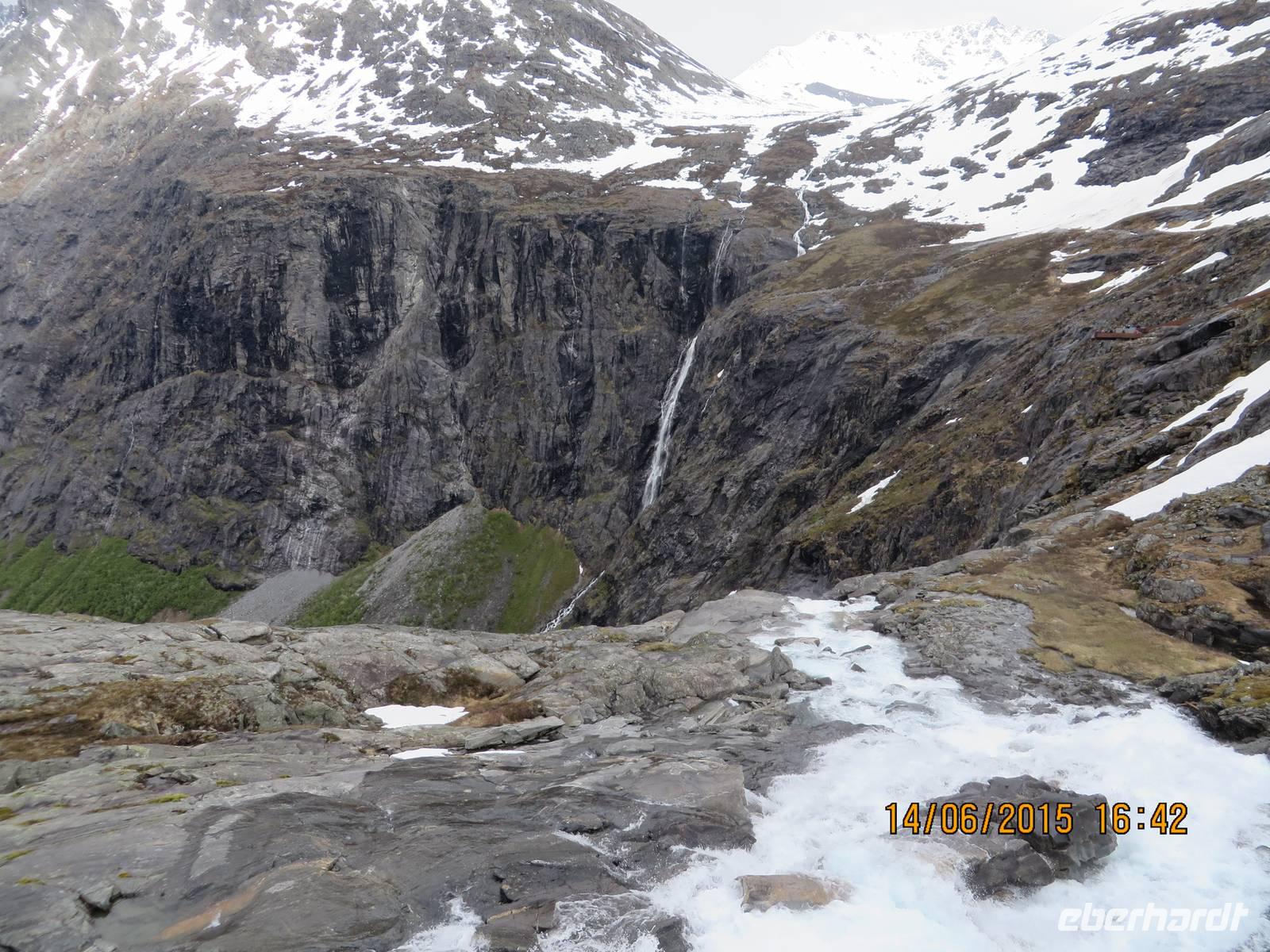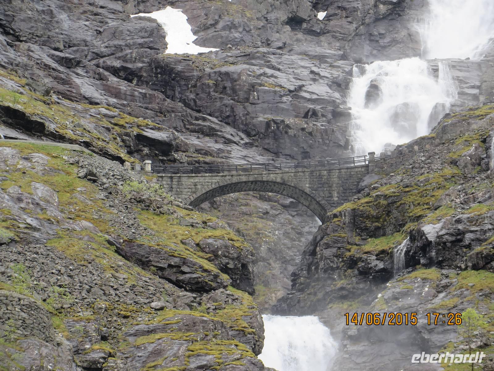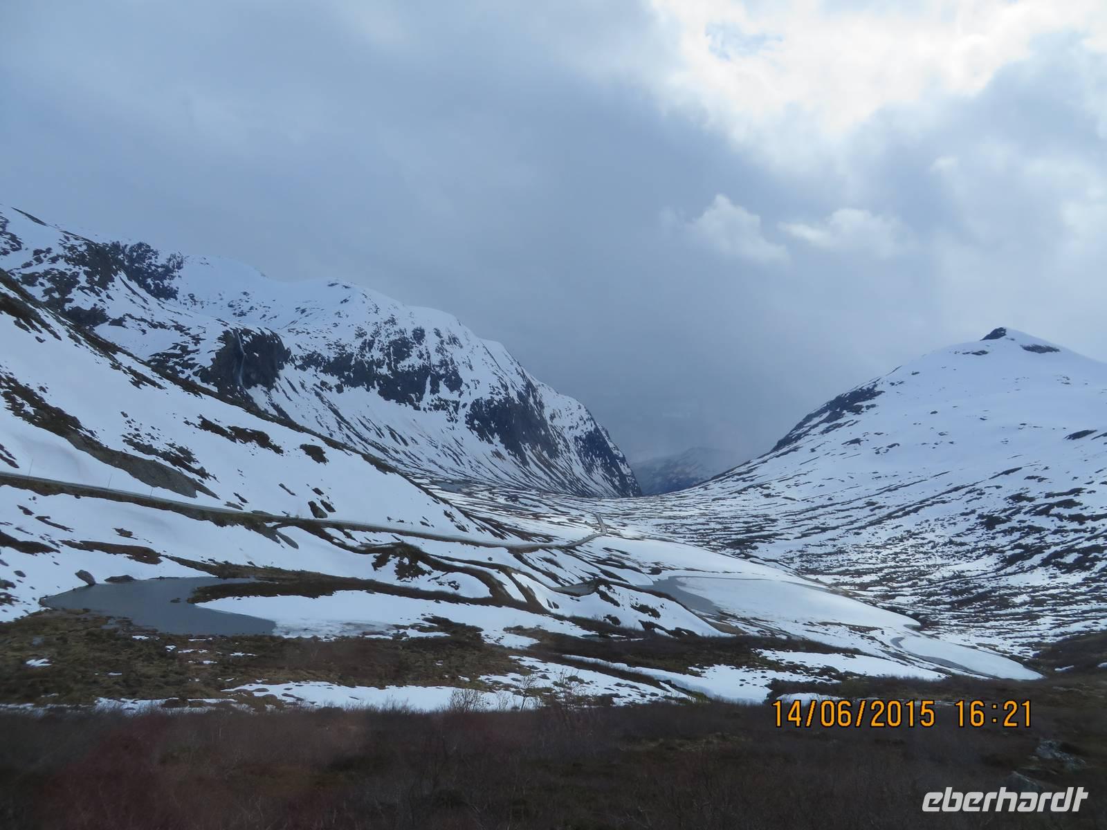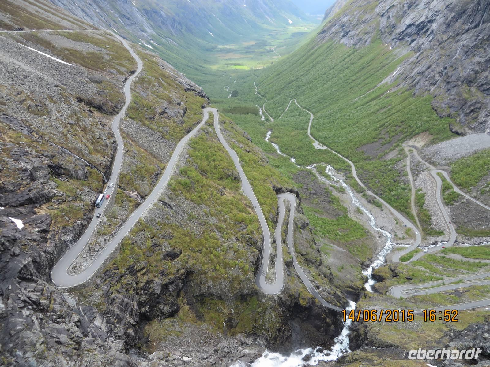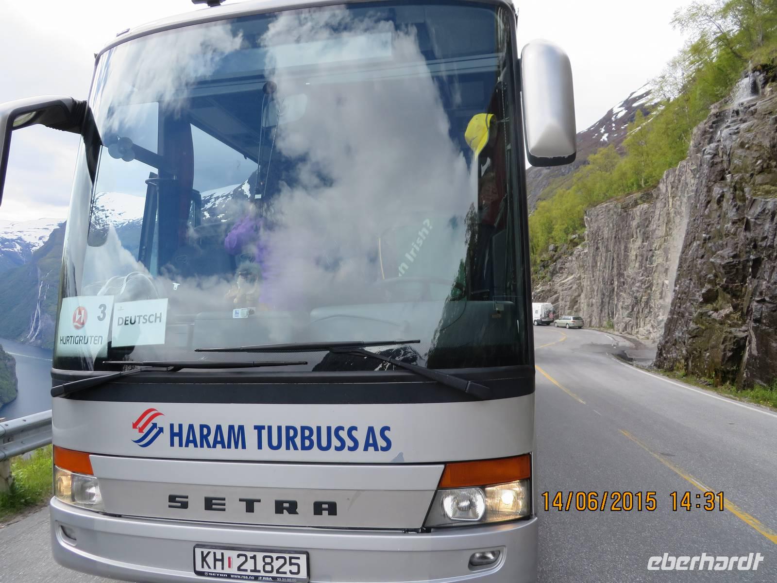 Ab 13 Uhr wird es spannend, denn nun geht es zum ersten Ausflug. Die Massen drängeln sich am Ausgang. Wir sind nicht die einzigen Passagiere an Bord. Außer uns wollen noch mehr als hundert andere Deutsche den Ausflug machen, außerdem diverse Englisch und Französisch sprechende Gäste. Nach dem wir mit dem Tenderboot übergesetzt haben, geht es im Sturmschritt durch das Dörfchen Geiranger zu den bereit stehenden Ausflugsbussen. Auch ohne Beschreibung kann man sich vorstellen, was sich an den Bussen abspielt. Trotzdem erobern wir unsere Plätze. Geiranger ist das älteste Touristenziel Norwegens. Unsere Fahrt beginnt auf Haarnadelkurven bergauf zum Orneveien. 600 Meter über dem Fjord gibt es den ersten Fotostopp mit einer fantastischen Aussicht auf den Fjord. Gerade noch so erwischen wir unsere M/S Finnmarken fürs Foto. Denn diese ist schon unterwegs nach Molde, wo wir wieder zusteigen werden. Soweit der Pan. Weiter geht es durch eine karge Berglandschaft, die vor allem dadurch überrascht, dass überall noch Schnee liegt. Wir fahren entlang des Eidsdalvatnet-Sees und setzen mit der Fähre von Eisdal nach Linge über. Mit Rücksicht auf die Touristenseele werden reichlich Stopps für die Fotografen eingelegt. An der Gudbrandsjuvetschlucht, wo wir eine dreiviertel Stunde Pause machen, gibt es auch einen großen Shop mit vielen Souvenirs und WCs). Ab hier geht es über elf enge und steile Haarnadelkurven die berühmten Trollstigen bergab. Unten gibt es Kaffee und Kuchen (gefüllte Waffeln und kleines belegtes Stüllchen).