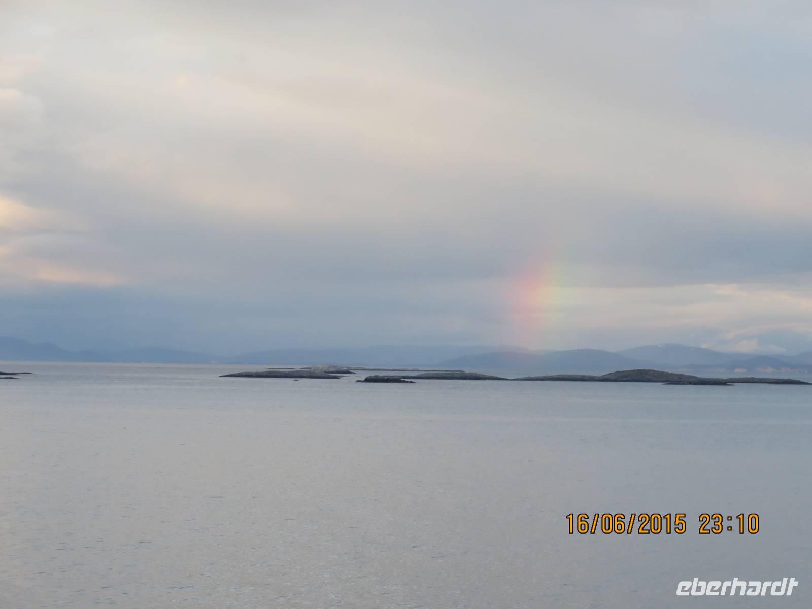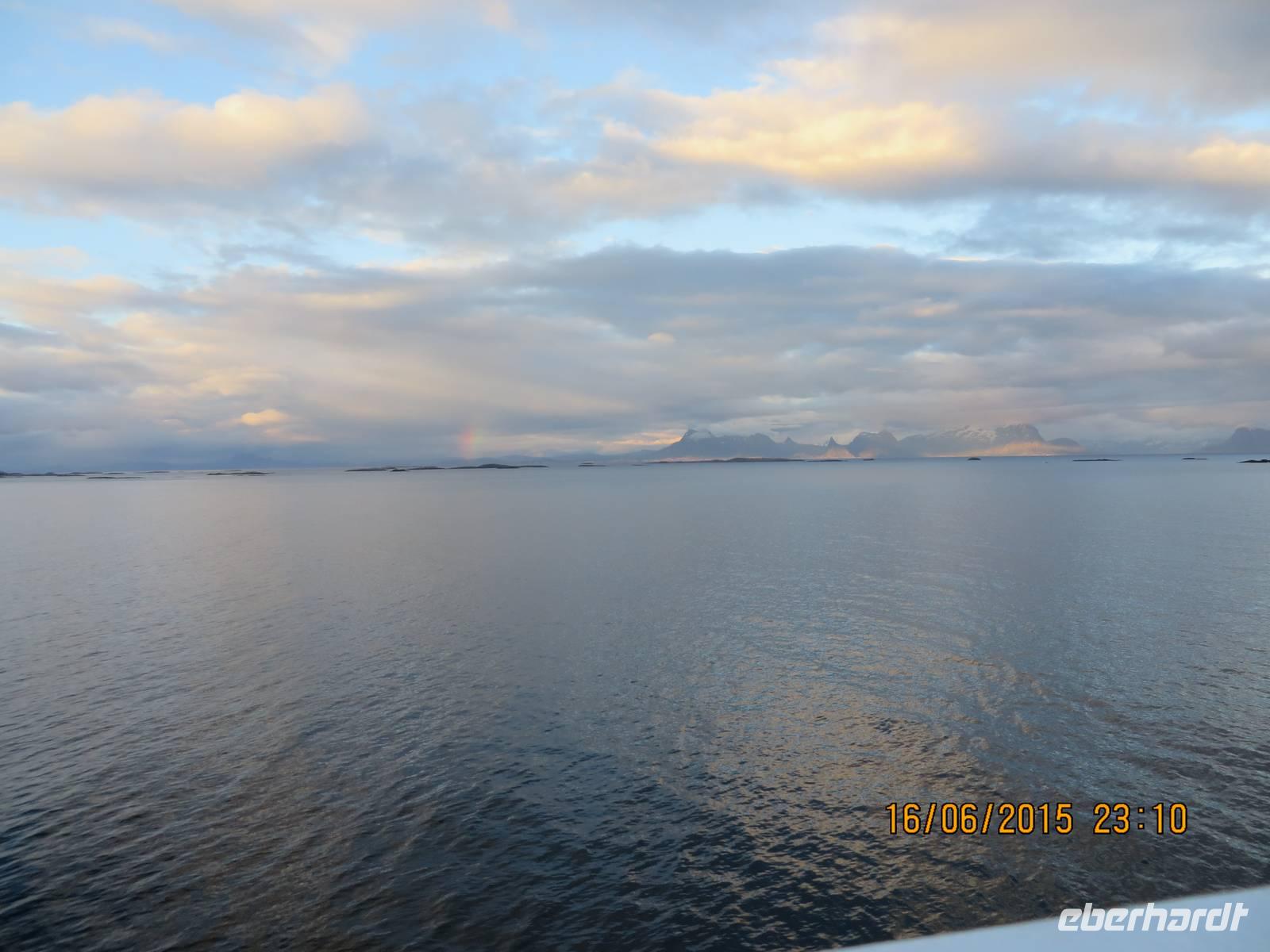 Unsere Gruppe trifft sich um 22 Uhr auf Deck 8. Mit dem Trollfjorddrink, einem sehr süßen Grog, den unser Reiseveranstalter Eberhardt TRAVEL spendiert, stoßen wir auf unsere schöne Reise an. Die Tassen dürfen als Souvenir mit nach Hause genommen werden. Während dessen fährt das Schiff durch den Raftsund. Backbord und steuerbord wartet die unglaublich faszinierende Landschaft darauf, von uns fotografiert zu werden. Jede Ecke schimmert in einem anderen Licht. Das Wetter wechselt zwischen Sonne und Regen und teilweise dicken Wolken. Auch ein Regenbogen gibt uns die Ehre. Trolle jagen über das Schiff und erschrecken die Passagiere. Die Stimmung ist ausgezeichnet. 23.30 Uhr fahren wir in den Trollfjord. Weit ragen die Fjordwände in den Himmel hinauf. Als das Schiff wendet, können wir fast die Felsen berühren, so eng ist es hier. Der Kapitän muss ein Künstler sein.