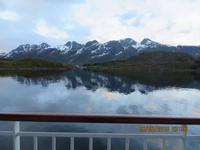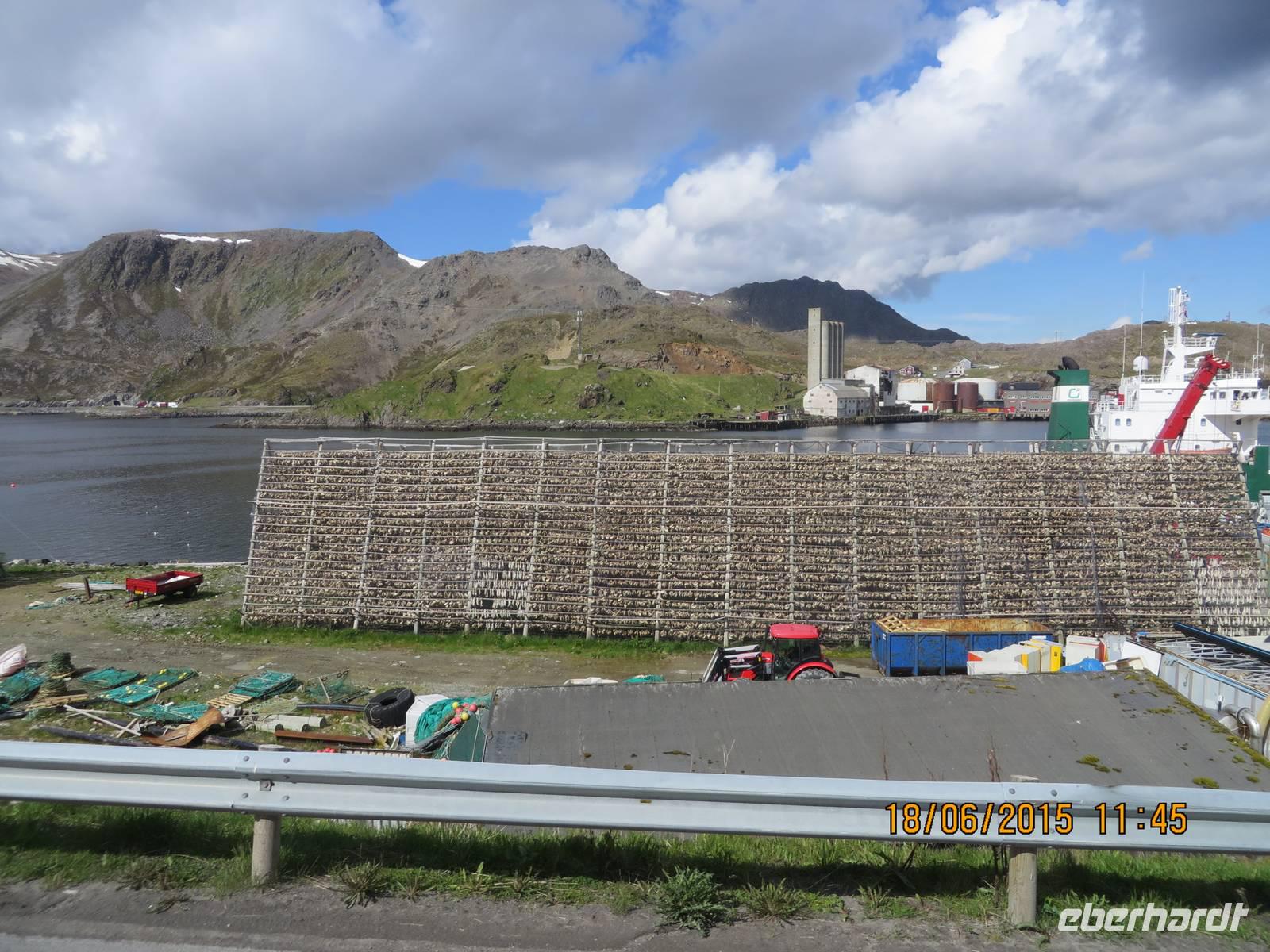Während der zweiten Fahrt durch den Trollfjord sitzen wir diesmal im Restaurant, denn wir begeben uns 18.45 Uhr auf den Ausflug „Lofoten", einem weiteren Höhepunkt unserer Reise. Wieder lernen wir ganz neue Landschaftsformationen kennen. Kahle Felsen und versteckte Buchten und sogar Sandstrände - das ist Norwegen pur. Hinter jeder Kurve vermittelt die Landschaft einen anderen Eindruck, aber der ist immer überwältigend, süchtig machend. In Henningsvaer besichtigen das "Lofotenhus", Norwegens größte Sammlung nordnorwegischer Malerei. Auf mehr als 100 Bildern ist eindrucksvoll das harte Fischerleben auf den Lofoten dargestellt. Die Leute hatten es hier schon ganz schön schwer - früher. Heute sehen ihre Häuser nicht mehr arm aus, aber unser Guide berichtet uns von der Schließung von Schulen und kleinen Läden. Die jungen Menschen wollen nicht mehr auf dem Land leben, sie ziehen in die Städte - das ist auf den Lofoten nicht anders als überall auf der Welt. Nach dem Besuch der Gallerie haben wir Zeit durch den Ort zu bummeln. Uns haben es besonders die Gestelle mit den Trockenfischen angetan. Hier können wir uns das mal von ganz nah anschauen. Immerhin befinden wir uns in einem der wichtigsten Fischerorte der Lofoten. Der Kabeljau, wie der geschlechtsreife Dorsch genannt wird, bildet die Existenzgrundlage der Region. Geköpft und an den Schwänzen zusammengebunden, hängen die Fische zu tausenden acht bis zehn Wochen an Holzgestellen, bis sie trocken und knochenhart geworden sind. Diese Prozedur gilt als die älteste Konservierungsmethode der Welt. Der nunmehr entstandenen Trockenfisch kann nach vielerlei Rezepten zu leckeren Gerichten verarbeitet werden. Die abgeschlagenen Köpfe werden nach Afrika exportiert, wo sie als Proteinquelle geschätzt werden. Vorher jedoch werden ihnen von Schulkindern die Zungen entfernt. Diese wiederum gelten (in Teig gebacken) als Delikatesse und bringen den Kindern ein zusätzliches Taschengeld ein. Auf unserer Fahrt über die Lofoten begegnen wir dem Kunstprojekt "Skulpturlandschaft Nordland" in Form eines Glas- und Spiegelpavillons. Leider ist nicht genügend Zeit zum Aussteigen, so dass wir uns auf den Bericht unseres Guides verlassen müssen, der besagt, dass sich beim Nähergehen, je nach konkretem Standpunkt des Betrachters, die Umgebung unterschiedlich in den Glas- und Spiegelwänden zeigt und damit zu einem einzigartigem Erlebnis wird.