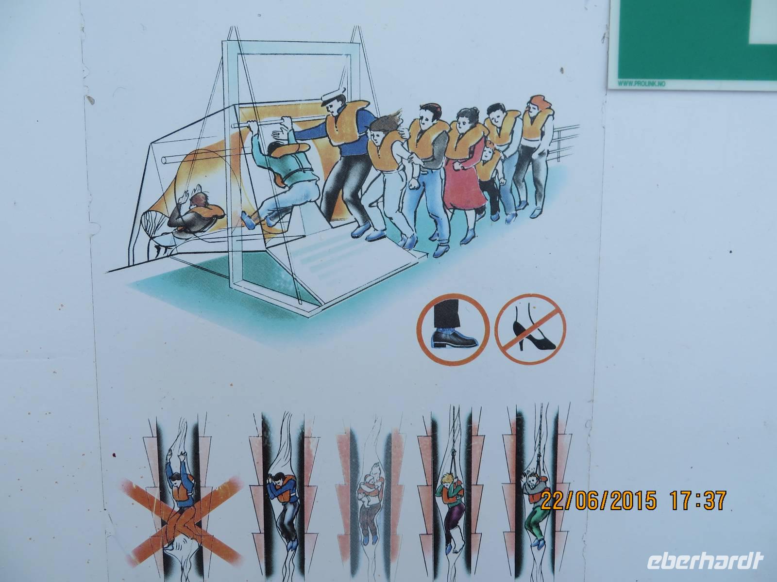 Noch einmal überqueren wir den Polarkreis. Diesmal erwartet uns kein Eiswasser, sondern ein Löffel Lebertran, wobei wir den Löffel als Souvenir behalten dürfen. Außerdem müssen wir uns heute über die Abreise unterhalten. Bis Mitternacht sollen alle Koffer an den nächst gelegenen Fahrstuhl gebracht und dort abgestellt (abgelegt) werden. Ein grüner Anhänger zeigt, dass diese Koffer zu uns gehören und nach Oslo gebracht werden sollen. Die andere Gruppe, die nach Kopenhagen fliegt, hat rote Anhänger. Dass dieser Fakt für uns noch eine Rolle spielen wird, wissen wir derzeit noch nicht. Am Mittag nehmen einige Gäste von uns am Ausflug „Vega" teil. Eine letzte Möglichkeit, die traumhafte Landschaft auf einem Ausflug zu erleben.