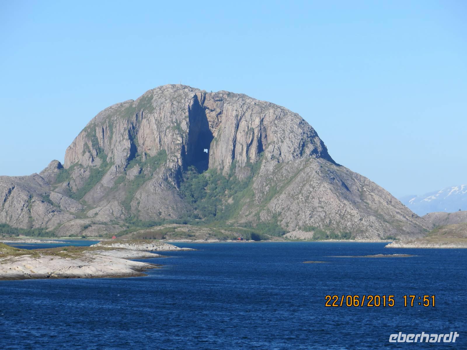 Die anderen, an Bord gebliebenen Gäste, haben das Glück, die Bergkette „Die sieben Schwestern" in schönstem Sonnenlicht zu sehen. Gegen 18 Uhr passieren wir den Torghatten, einen Berg mit einer besonderen geologischen Form. In der Mitte befindet sich ein etwa 35 Meter hohes und 160 Meter langes Loch. Natürlich gibt es auch eine passende Sage: Ein König hatte sieben recht wilde Töchter, die er zu einer Jungfrau schickte, um sie erziehen zu lassen. Der ungehorsame Sohn eines anderen Königs erblickte eines Abends die Jungfrau beim Baden und wollte sie für sich gewinnen. Die Jungfrau begab sich mit den sieben Schwestern auf die Flucht. Die Schwestern waren dem Königssohn jedoch nicht abgeneigt und hockten sich nebeneinander hin, um auf ihn zu warten. Dieser würdigte sie jedoch keines Blickes und jagte der Jungfrau hinterher. Als er sie nicht einholen konnte, schoss er einen Pfeil auf sie ab. Ein weiterer König hatte das beobachtet und warf seinen Hut in die Bahn des Pfeils. Der Hut blieb durchschossen liegen und bildet heute den Berg Torghatten. Die Schwestern jedoch hatten vergessen, wie kurz im Sommer die Nächte im Norden sind. Und als die Sonne aufging, wurden sie alle versteinert, wo sie gerade saßen oder standen.