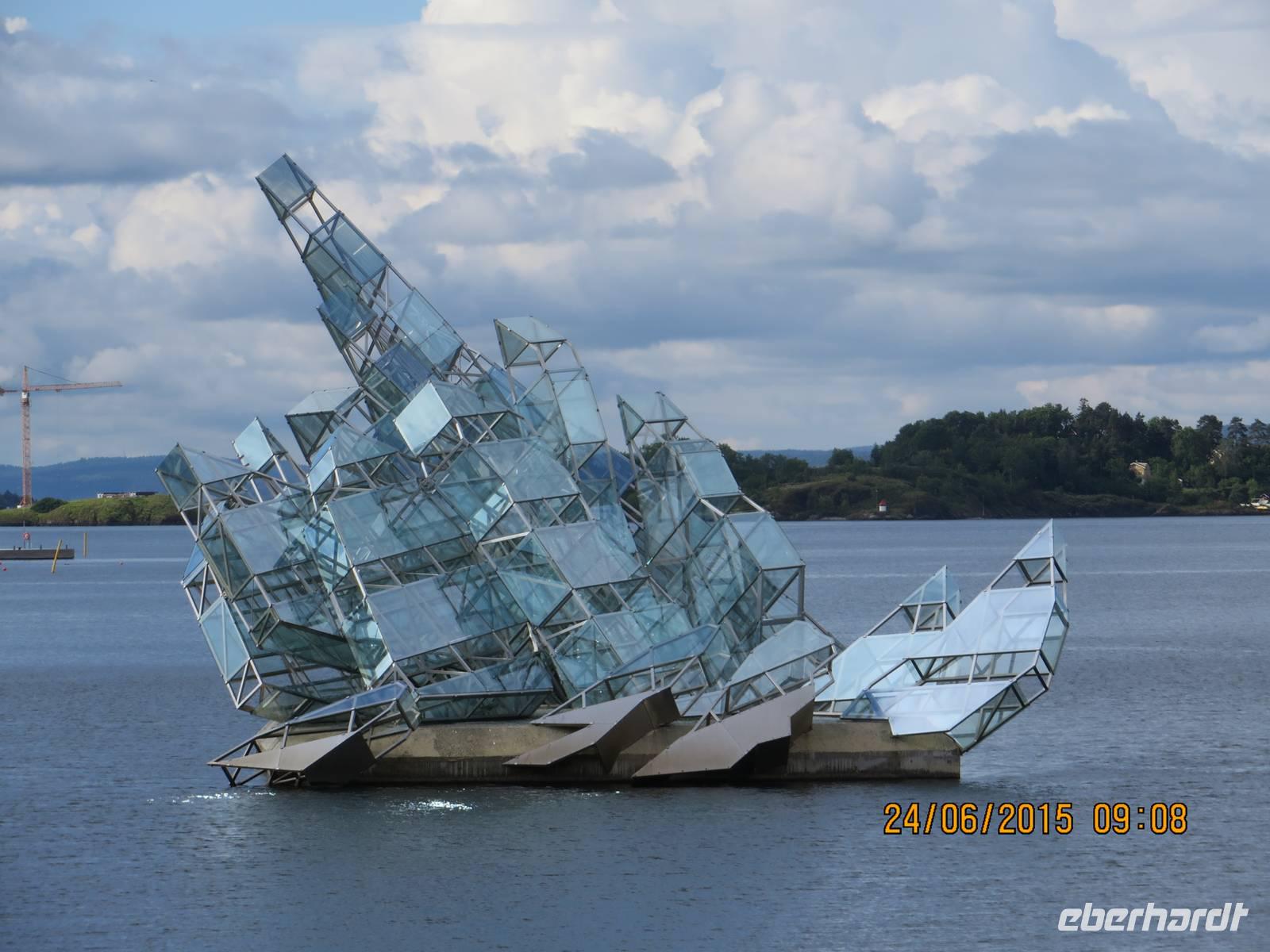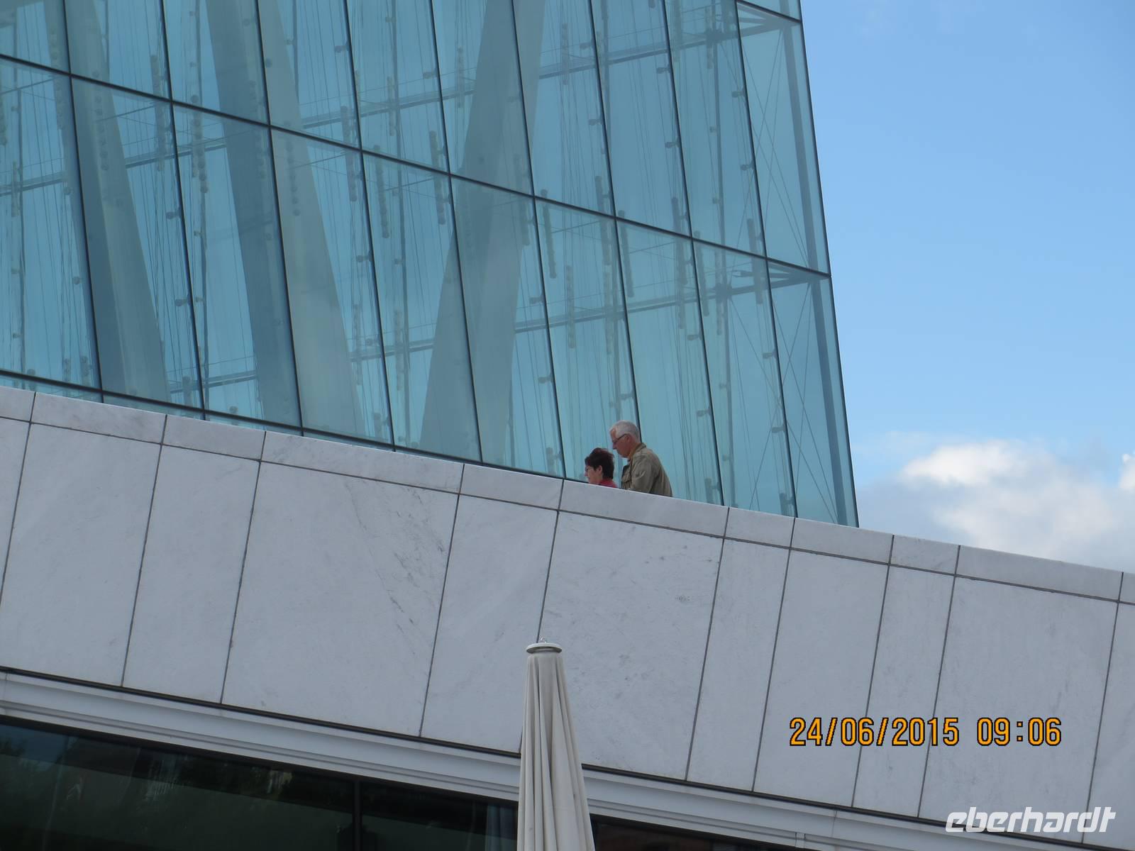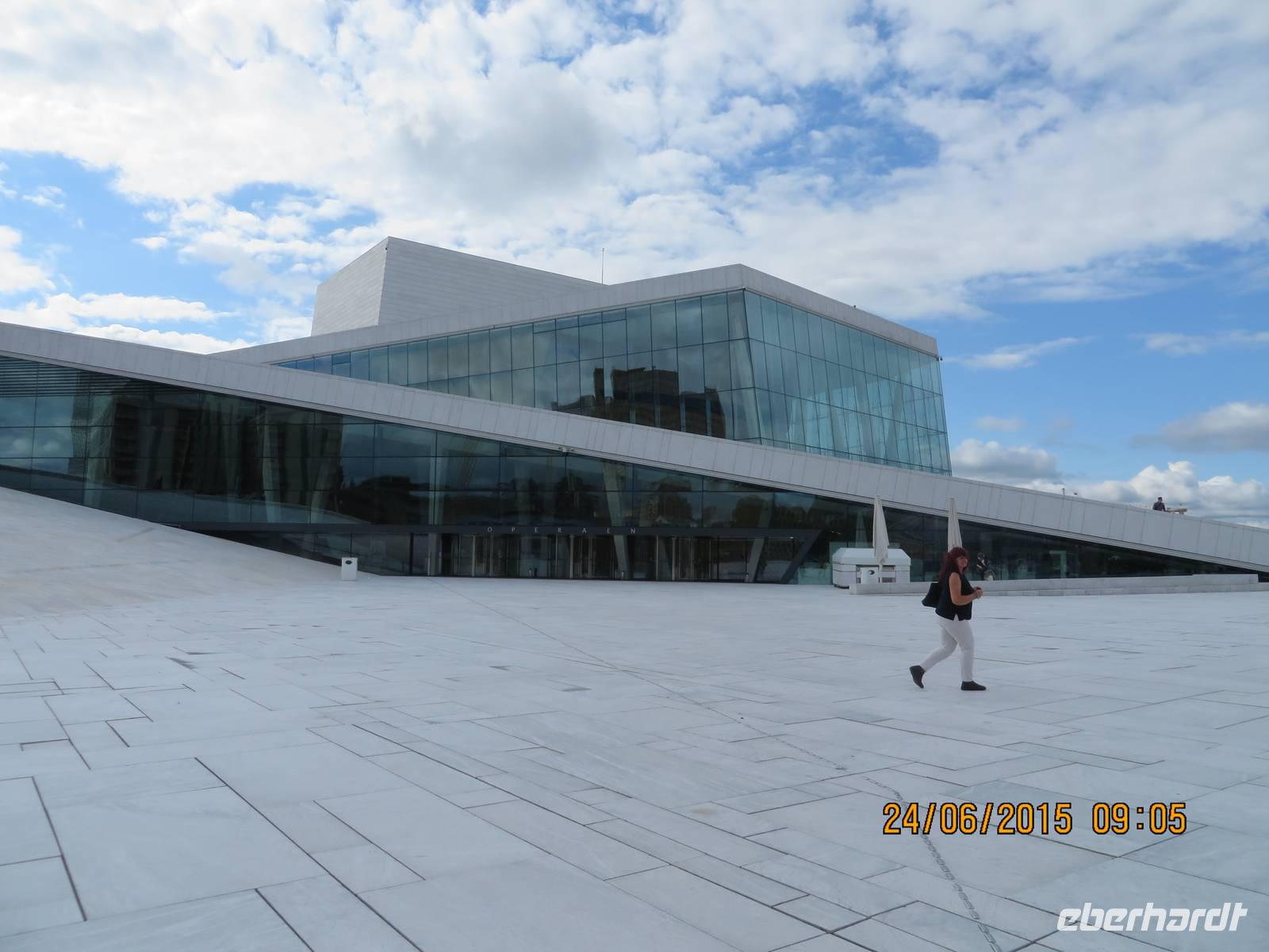 Um 9 Uhr laden wir die Koffer in den Bus und begeben uns auf eine Stadtrundfahrt durch Oslo. Als Erstes besichtigen wir das Opernhaus. Es hat eine eckige weiße Fassade und man kann auf dem Dach spazieren gehen. Bekannt ist das Haus auch, weil sich unsere Bundeskanzlerin zur Eröffnung 2008 tief dekolltiert zeigte. Diese Bilder gingen durch alle Medien.