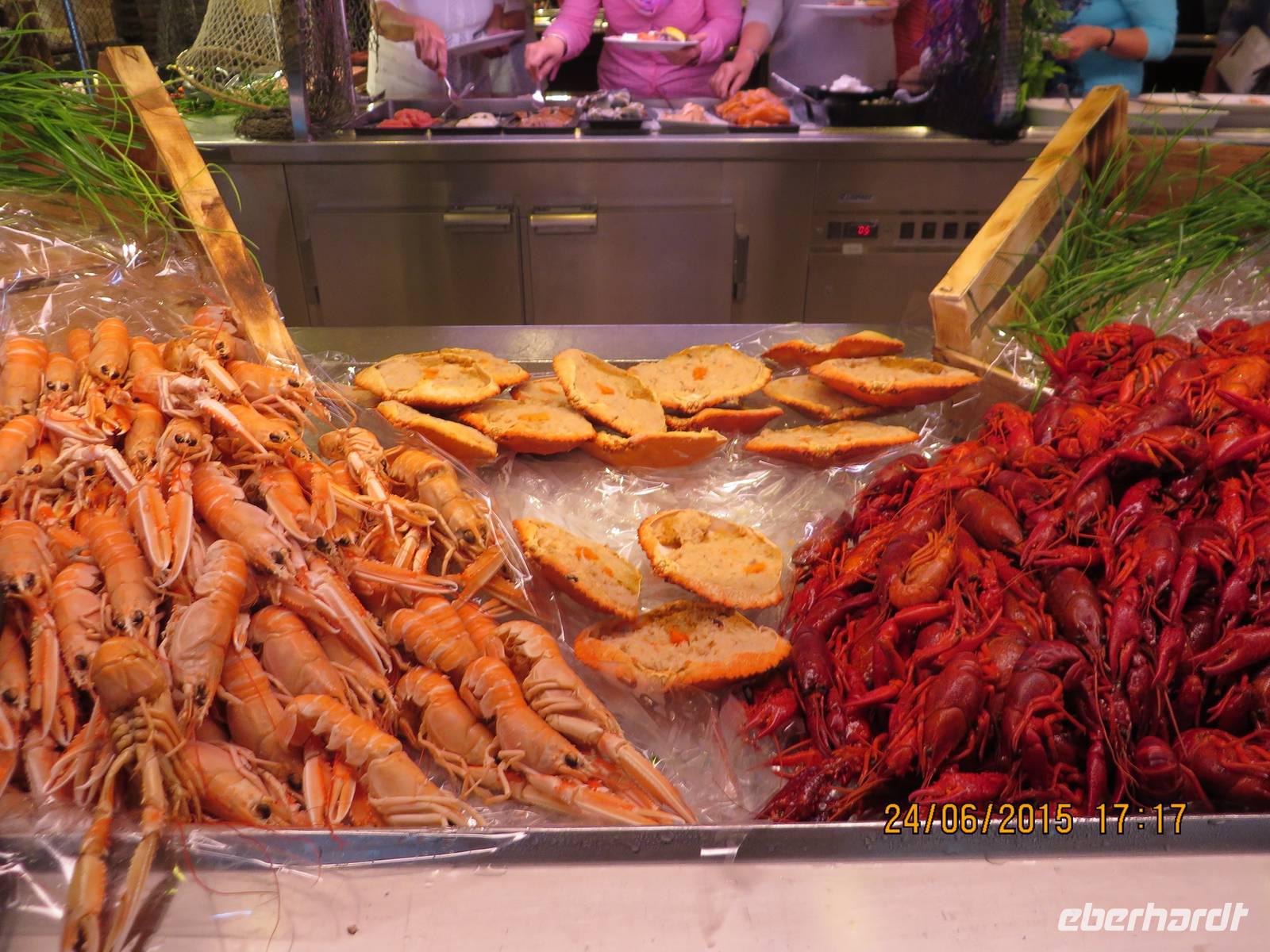 Das Terminal von Fjordline befindet sich ganz am Ende einer Großbaustelle. Wir kommen in ein modernes Gebäude, wo wir mit dem Lift oder mit der Rolltreppe zum Warteraum fahren. Dort ist es voll, aber nicht überfüllt. Wir müssen ein bisschen warten, denn unsere Abfertigung beginnt erst 18.30 Uhr und unsere Fähre hat eine Stunde Verspätung. Wir beobachten, wie das Schiff angefahren kommt und Passagiere aussteigen. Dann ist es endlich so weit. Wir können unsere Kabinen beziehen. Wir wohnen auf Deck 8, es gibt einen Fahrstuhl, so dass wir bequem unser Gepäck zu den Kabinen bringen können. Nun geht es gleich ins Restaurant. Freundliche Mitarbeiter stehen am Eingang des Restaurants und zeigen uns, wo unsere reservierten Plätze sind. Ein üppiges Buffet lädt zum Schlemmern ein. Diverse Salate, Fleisch, Fisch und viele Meeresfrüchte wollen verputzt werden. Auch Bier und Wein läuft in Strömen, alles inklusive. Weit nach 22 Uhr beobachten wir einen traumhaften Sonnenuntergang und begeben uns anschließend müde ins Bett. Das gleichmäßige Brummen und das leichte Schaukeln unserer MS Stavangerfjord begleiten uns durch die Nacht.