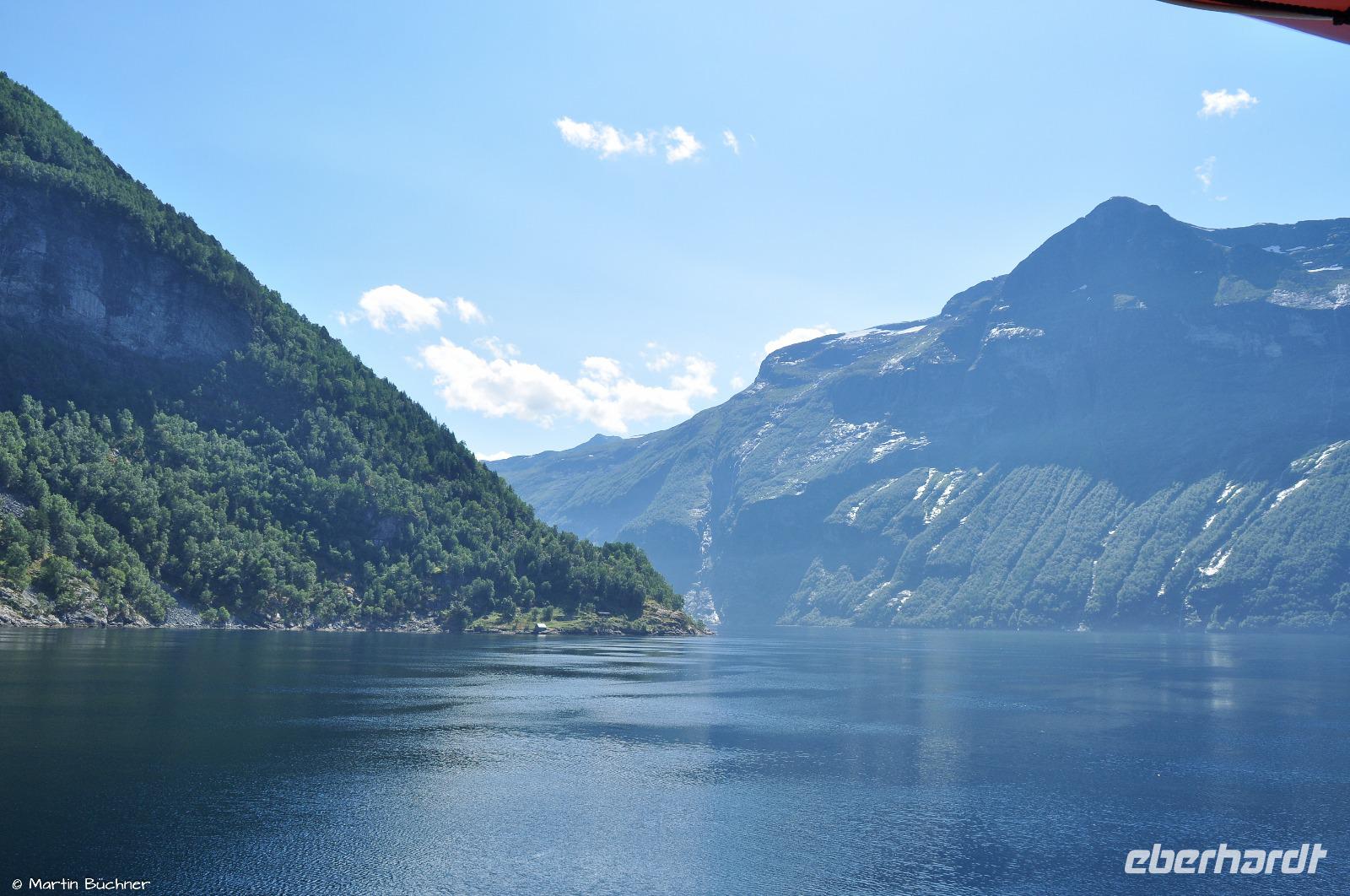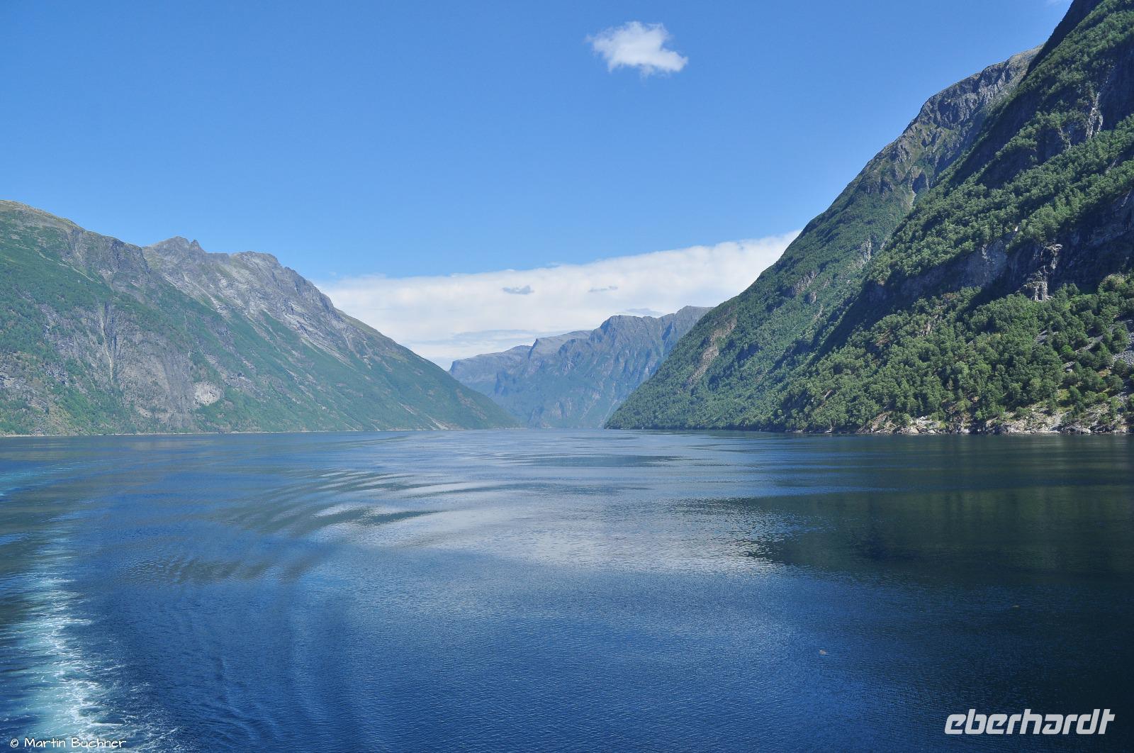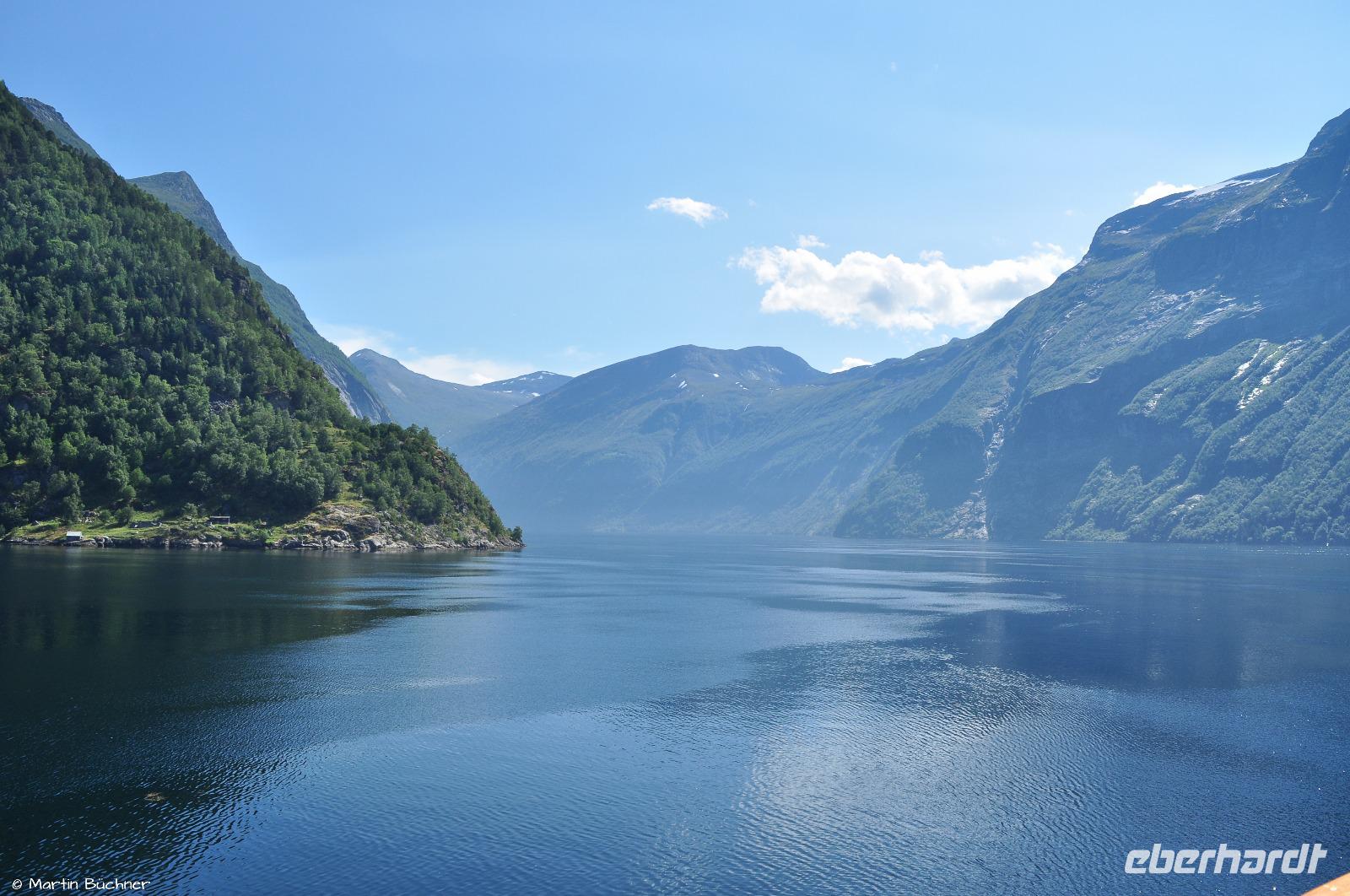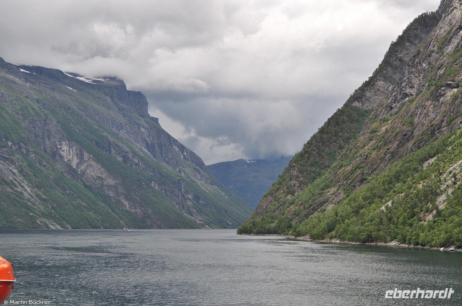Über den Storfjord geht es in den hintersten Winkel zum s-förmigen Geirangerfjord. Er liegt mehr als 100 km von der „Mündung des Fjordes" ins Meer entfernt. Die bis zu 1.600 m steilaufragenden Felswände, die vielen gut erhaltenen historischen Höfe, die einzigartige artenreiche Natur an Land und unter Wasser haben die UNESCO dazu bewogen, den Geirangerfjord und den zum Sognefjord gehörenden Näröyfjord zum UNESCO Weltnaturerbe zu erklären.