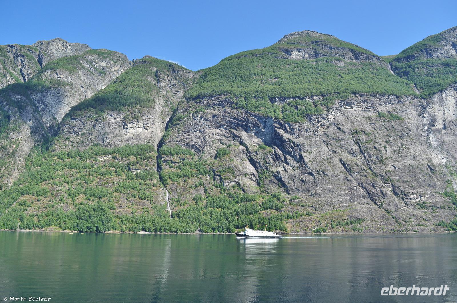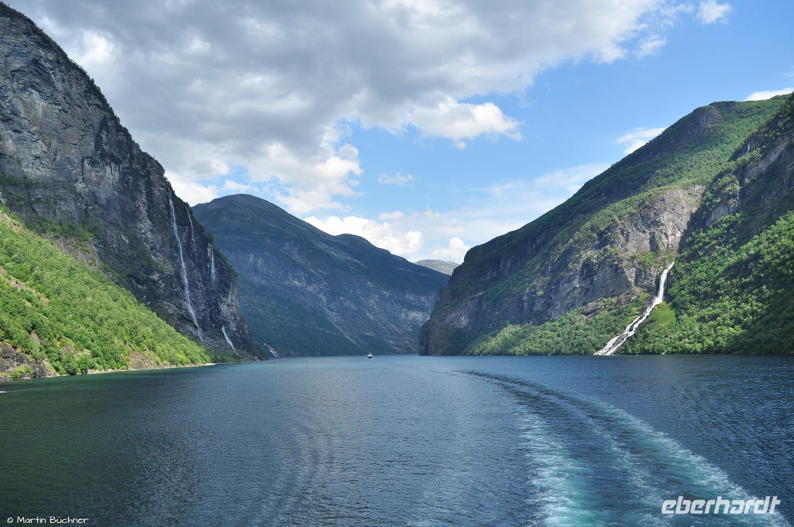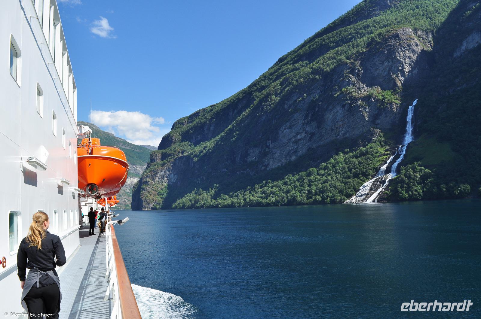 Über den Storfjord geht es in den hintersten Winkel zum s-förmigen Geirangerfjord. Er liegt mehr als 100 km von der „Mündung des Fjordes" ins Meer entfernt. Die bis zu 1.600 m steilaufragenden Felswände, die vielen gut erhaltenen historischen Höfe, die einzigartige artenreiche Natur an Land und unter Wasser haben die UNESCO dazu bewogen, den Geirangerfjord und den zum Sognefjord gehörenden Näröyfjord zum UNESCO Weltnaturerbe zu erklären.