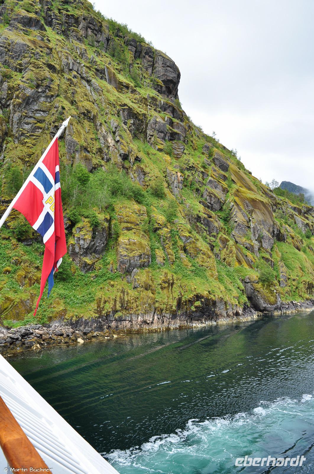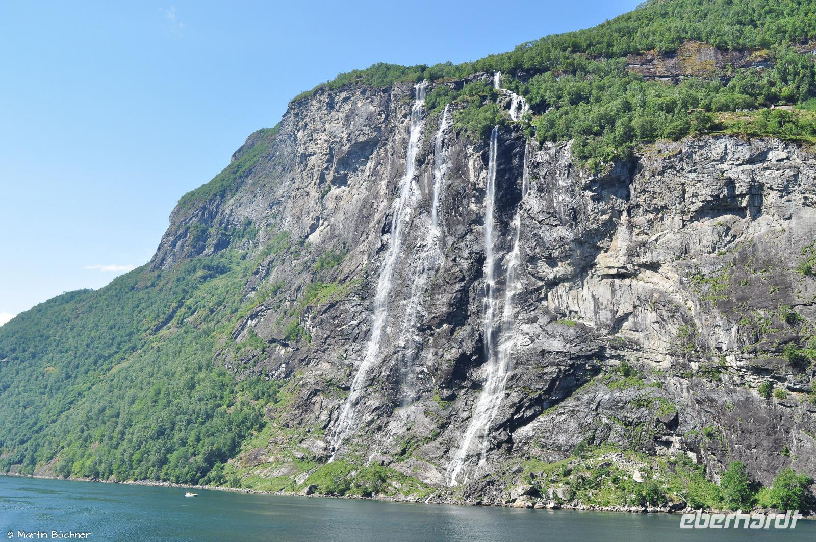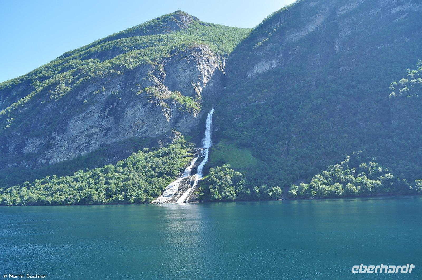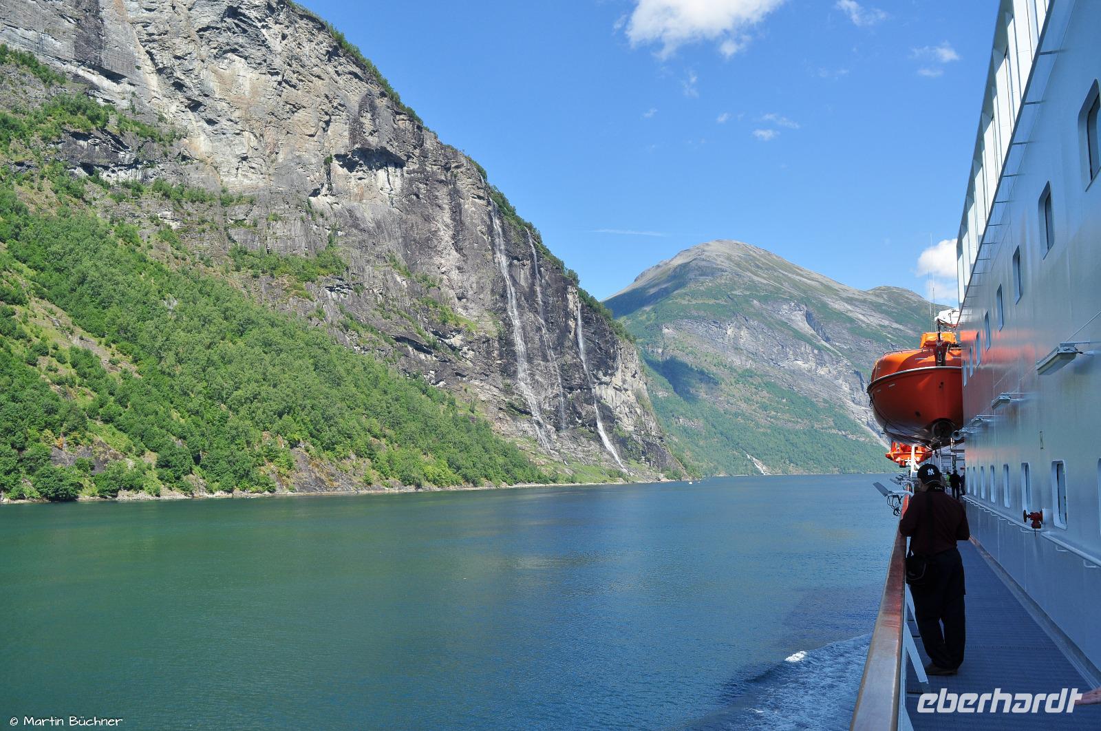 Über den Storfjord geht es in den hintersten Winkel zum s-förmigen Geirangerfjord. Er liegt mehr als 100 km von der „Mündung des Fjordes" ins Meer entfernt. Die bis zu 1.600 m steilaufragenden Felswände, die vielen gut erhaltenen historischen Höfe, die einzigartige artenreiche Natur an Land und unter Wasser haben die UNESCO dazu bewogen, den Geirangerfjord und den zum Sognefjord gehörenden Näröyfjord zum UNESCO Weltnaturerbe zu erklären.