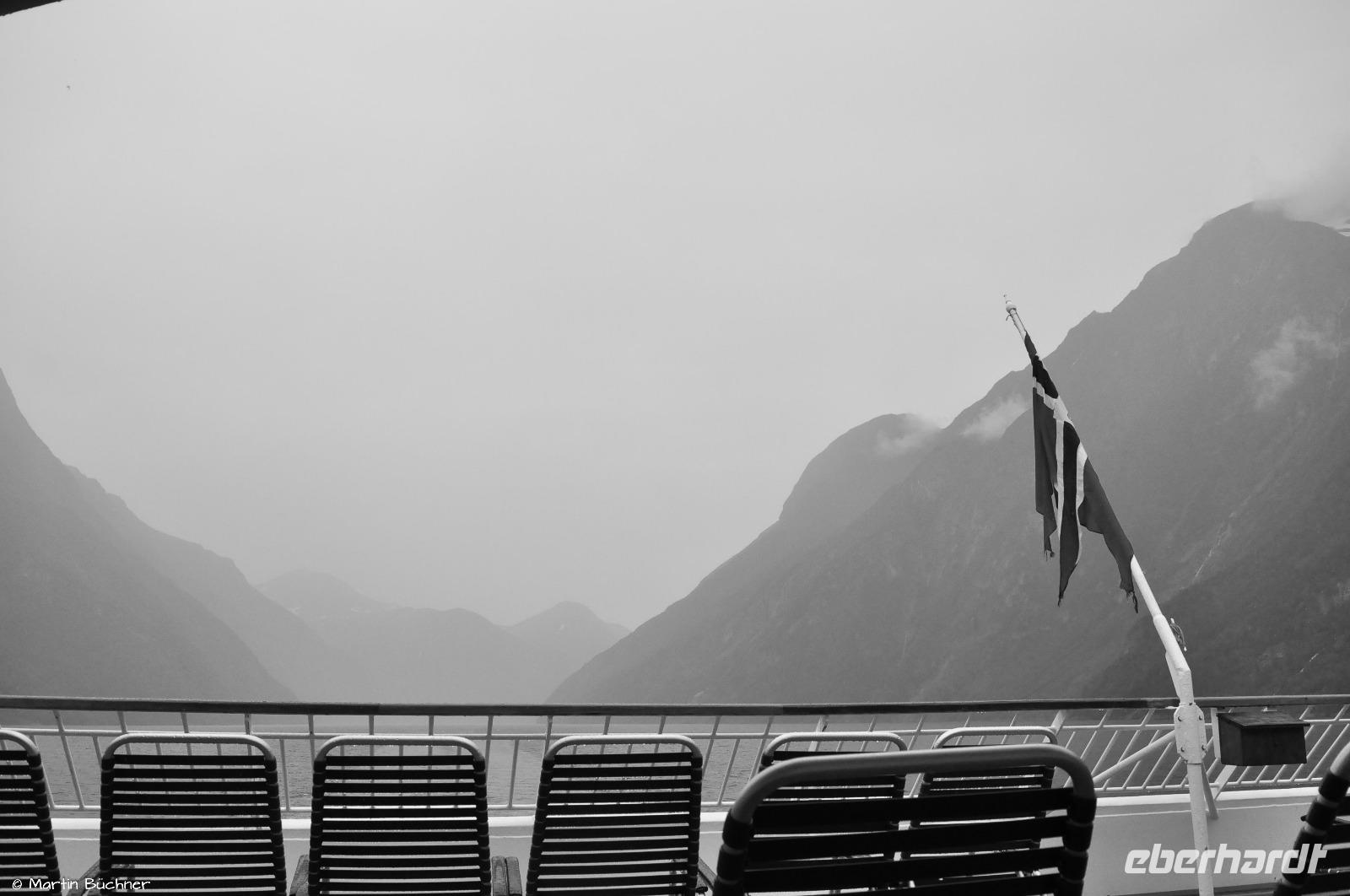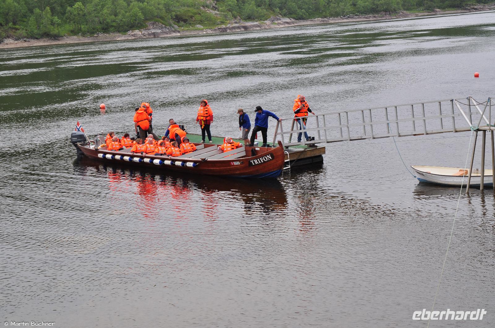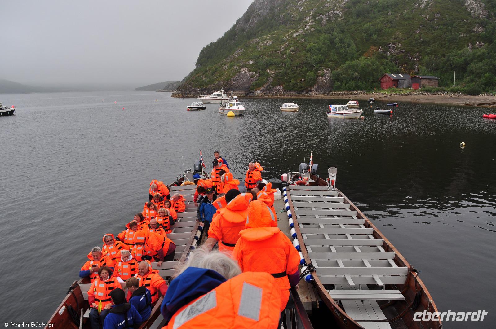 Fast die gesamte Gruppe steigt in Geiranger auf ein so genanntes Tenderboot um, um an einem Ausflug bis nach Molde teilzunehmen. Neben den Ausblicken auf den Geirangerfjord gehören die Trollstigen zu den Höhepunkten des Ausflugs. Aufgrund einer aufgezogenen Gewitterfront bleibt das Bergpanorama der Möre-og-Romsdal-Alpen leider verschlossen.