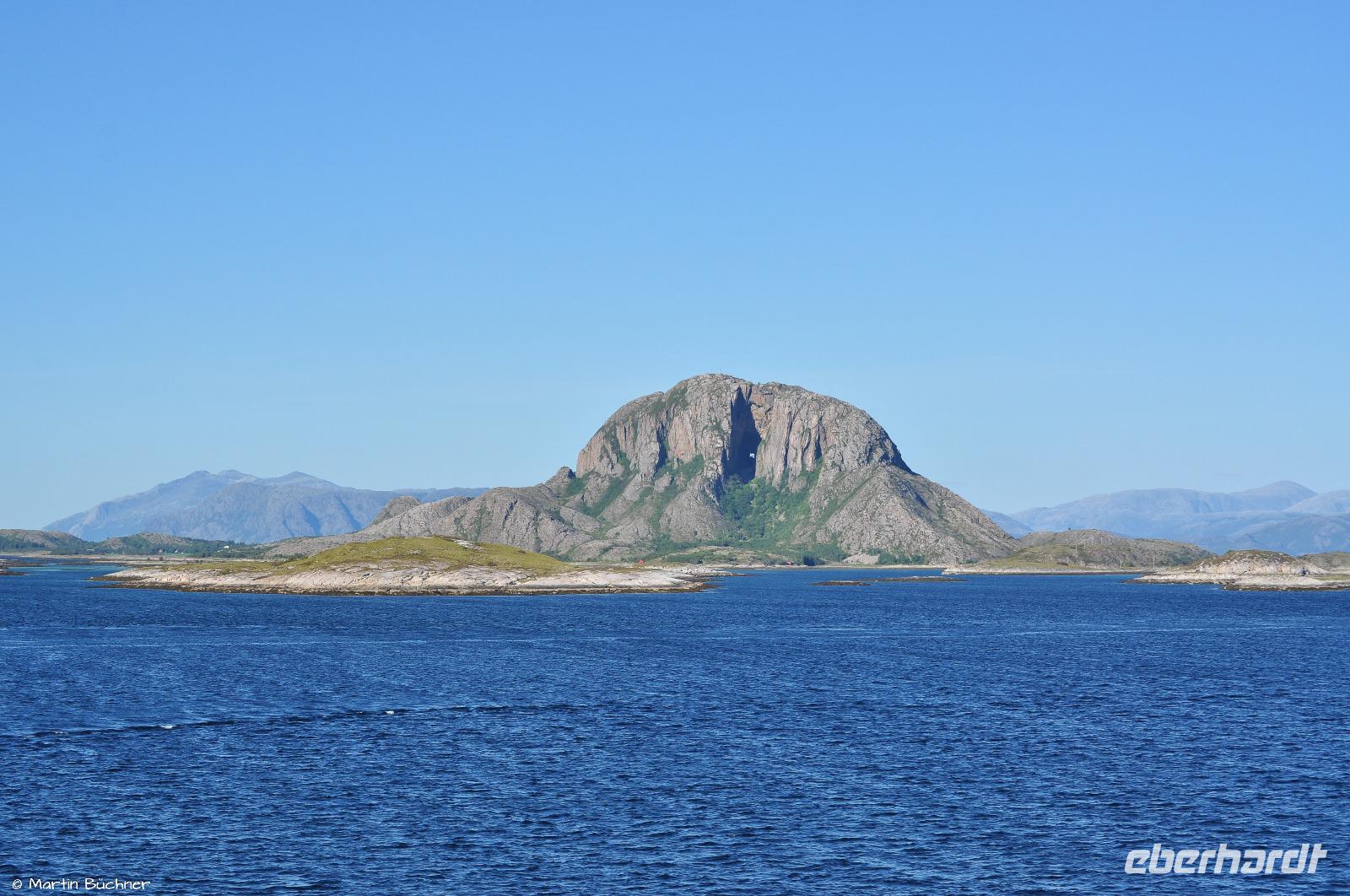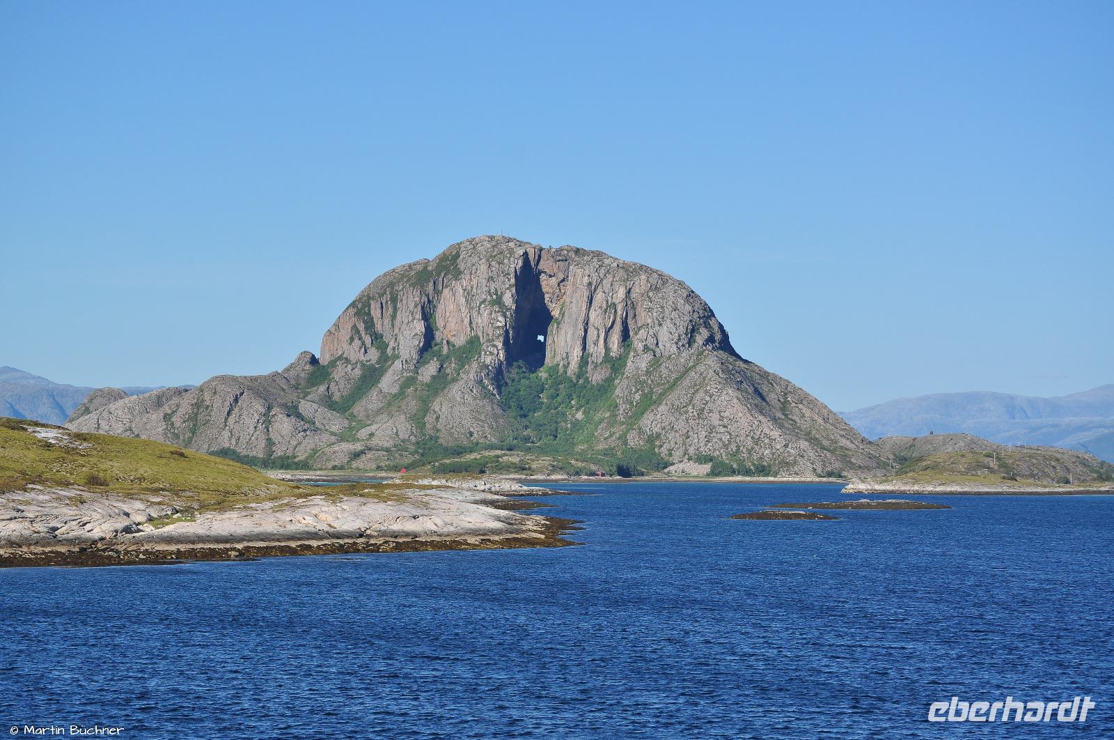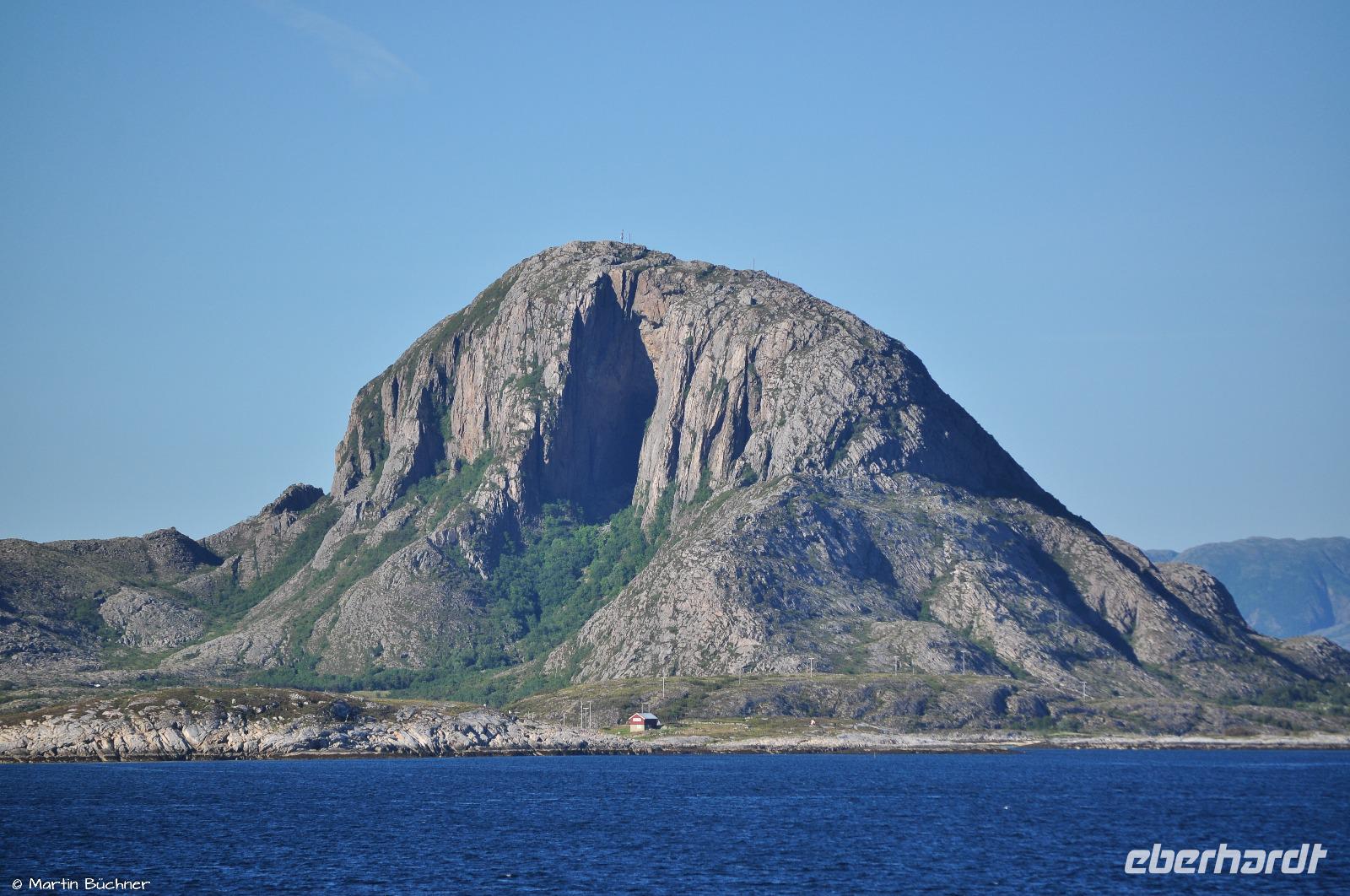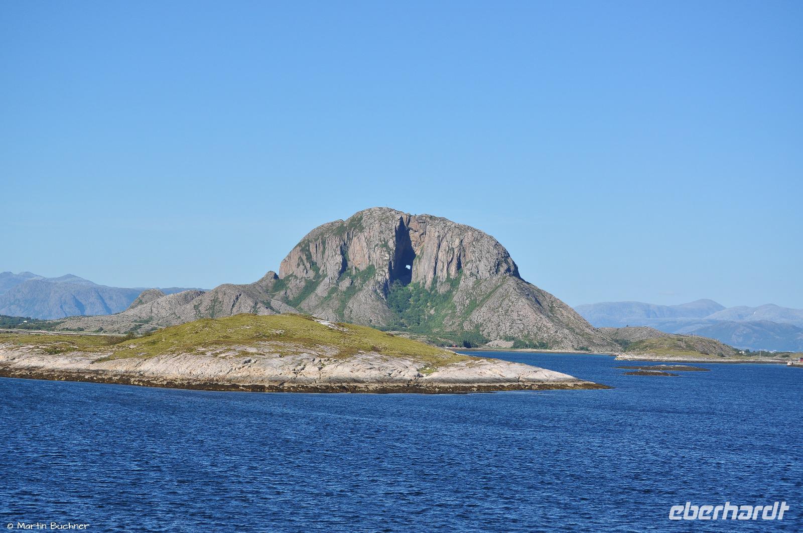 Heutige Höhepunkte die Gebirgskette der Sieben Schwestern und Torghatten, ein Felsen mit einem riesigen Loch. Die M/S Nordnorge fährt traditionell einen Bogen, um das Loch sichtbar zu machen.