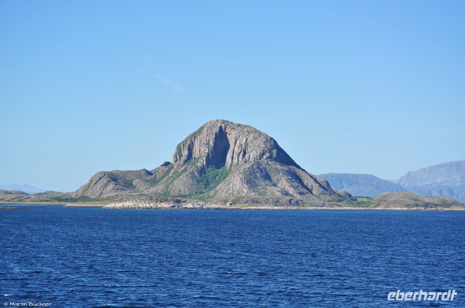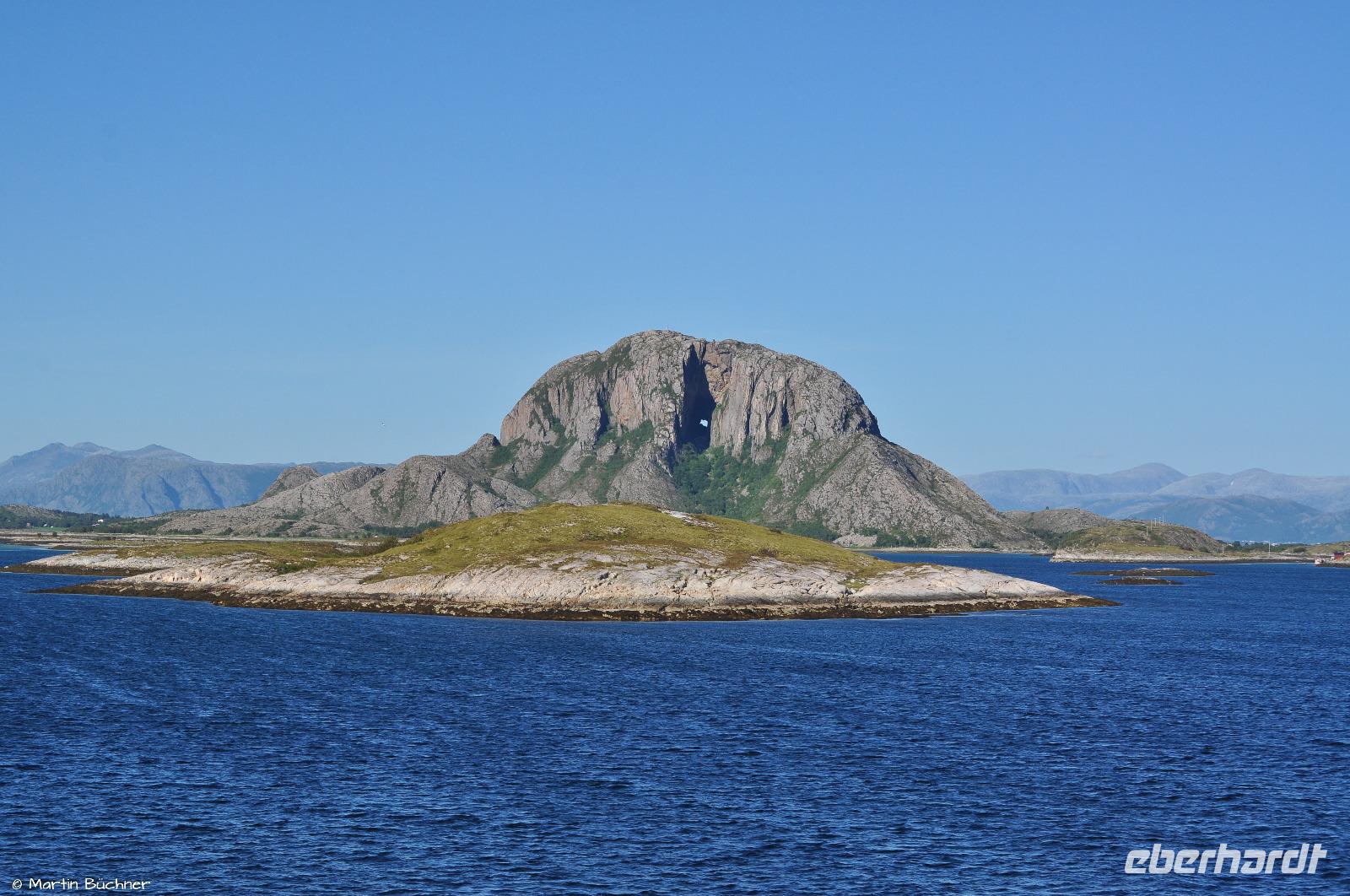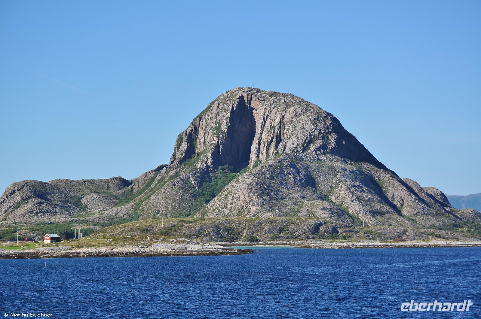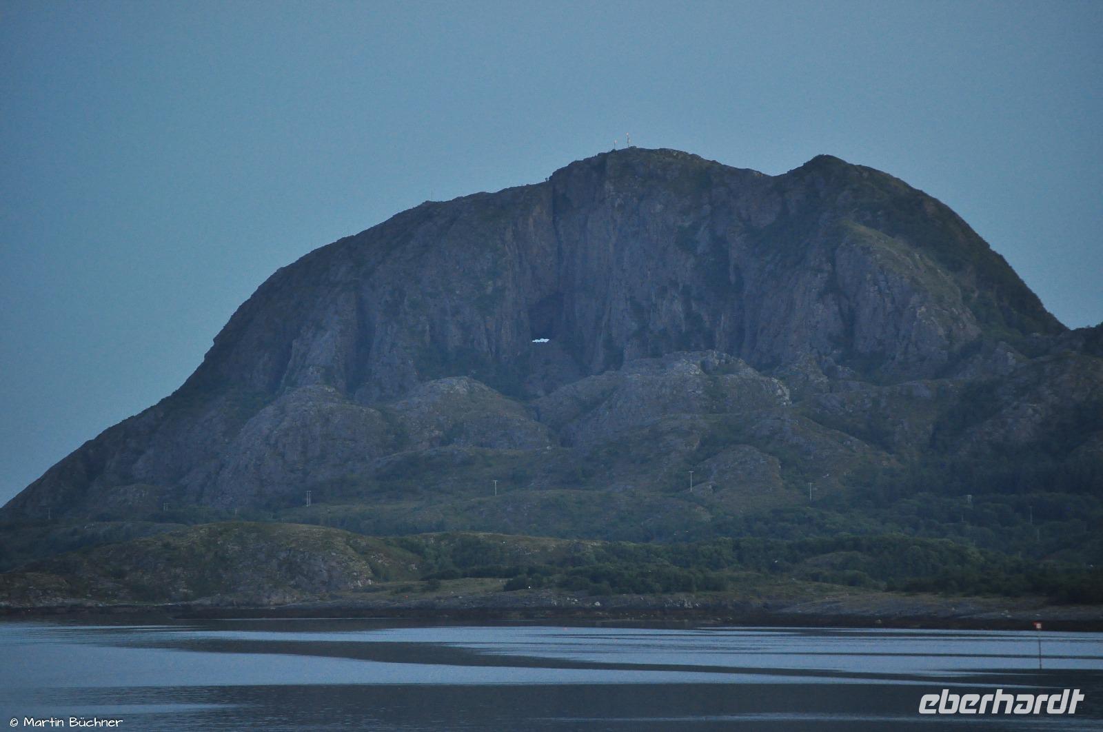 Heutige Höhepunkte die Gebirgskette der Sieben Schwestern und Torghatten, ein Felsen mit einem riesigen Loch. Die M/S Nordnorge fährt traditionell einen Bogen, um das Loch sichtbar zu machen.