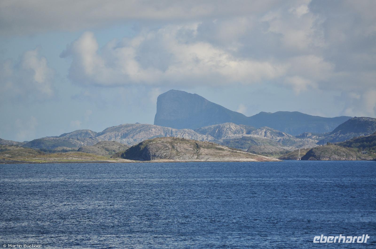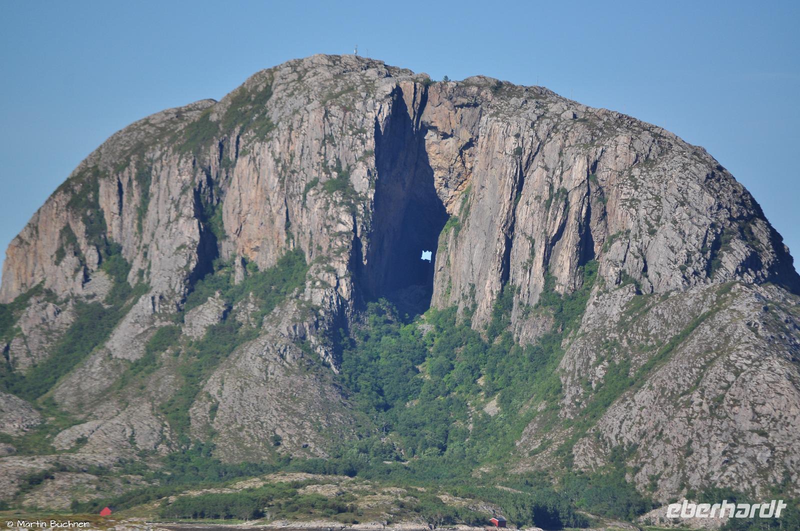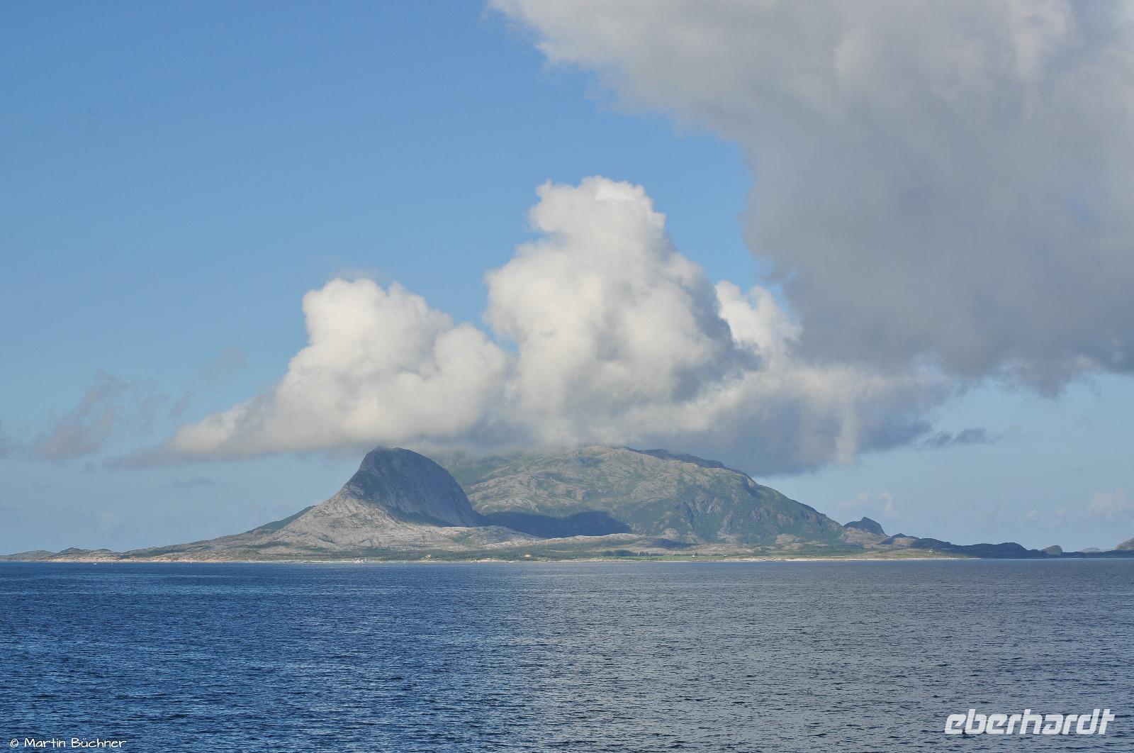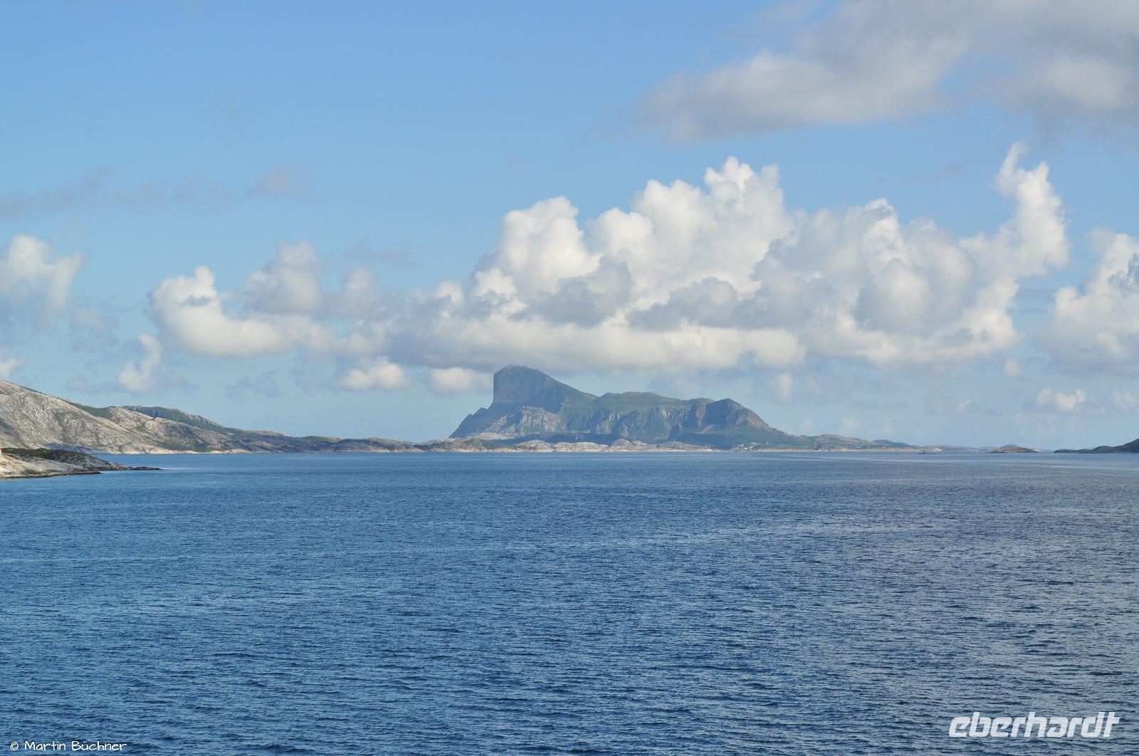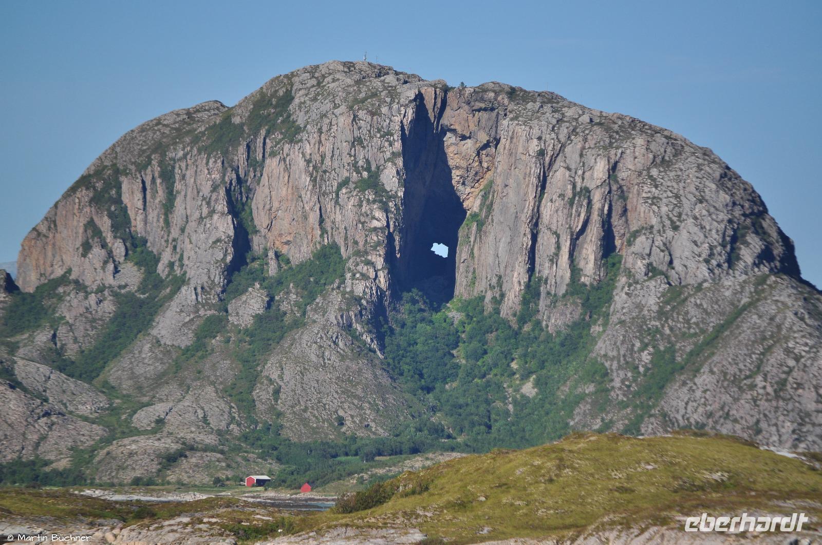 Heutige Höhepunkte die Gebirgskette der Sieben Schwestern und Torghatten, ein Felsen mit einem riesigen Loch. Die M/S Nordnorge fährt traditionell einen Bogen, um das Loch sichtbar zu machen.
