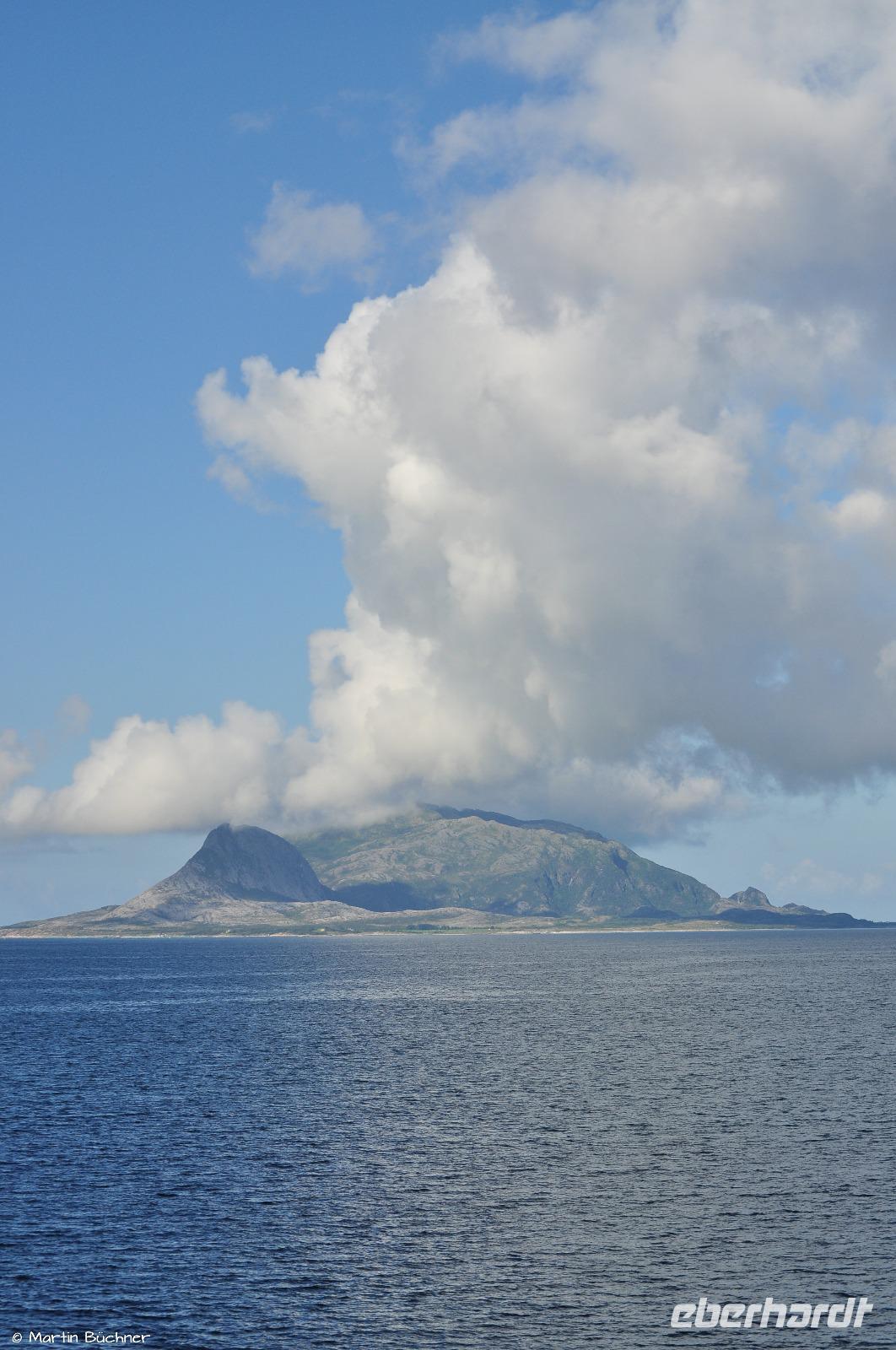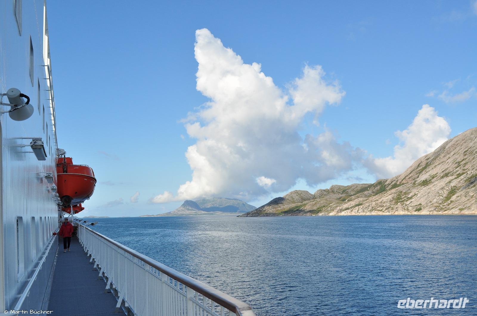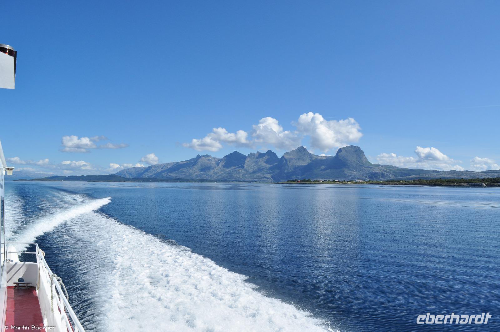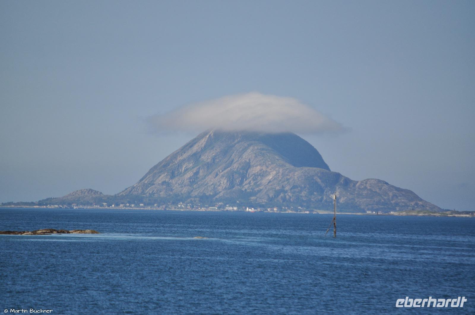 Heutige Höhepunkte die Gebirgskette der Sieben Schwestern und Torghatten, ein Felsen mit einem riesigen Loch. Die M/S Nordnorge fährt traditionell einen Bogen, um das Loch sichtbar zu machen.