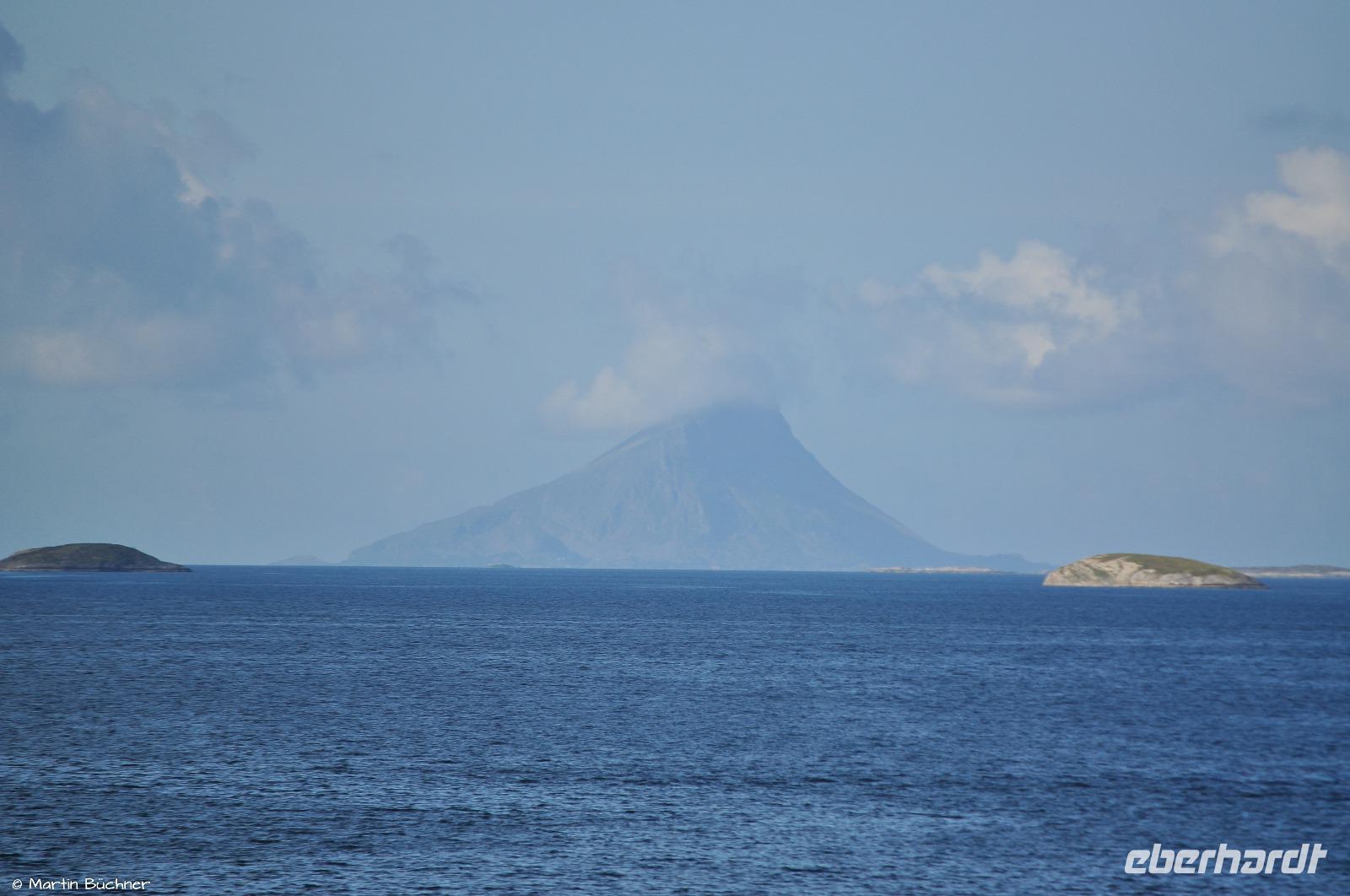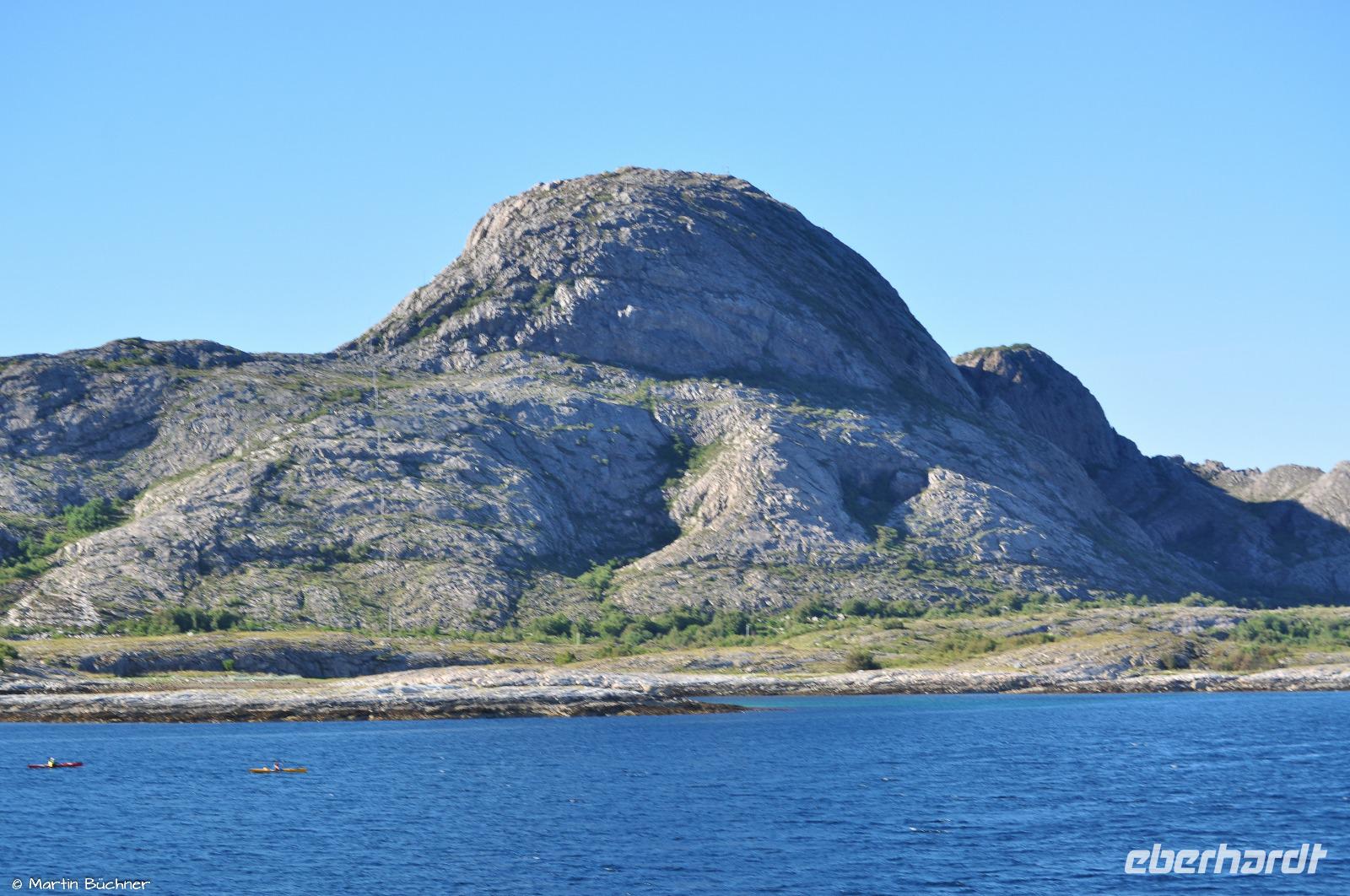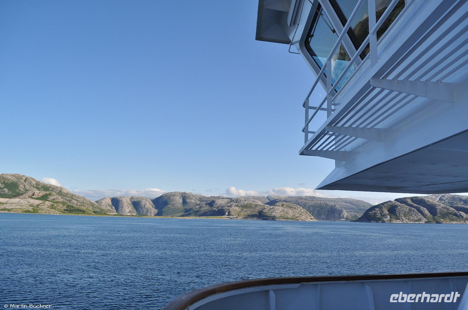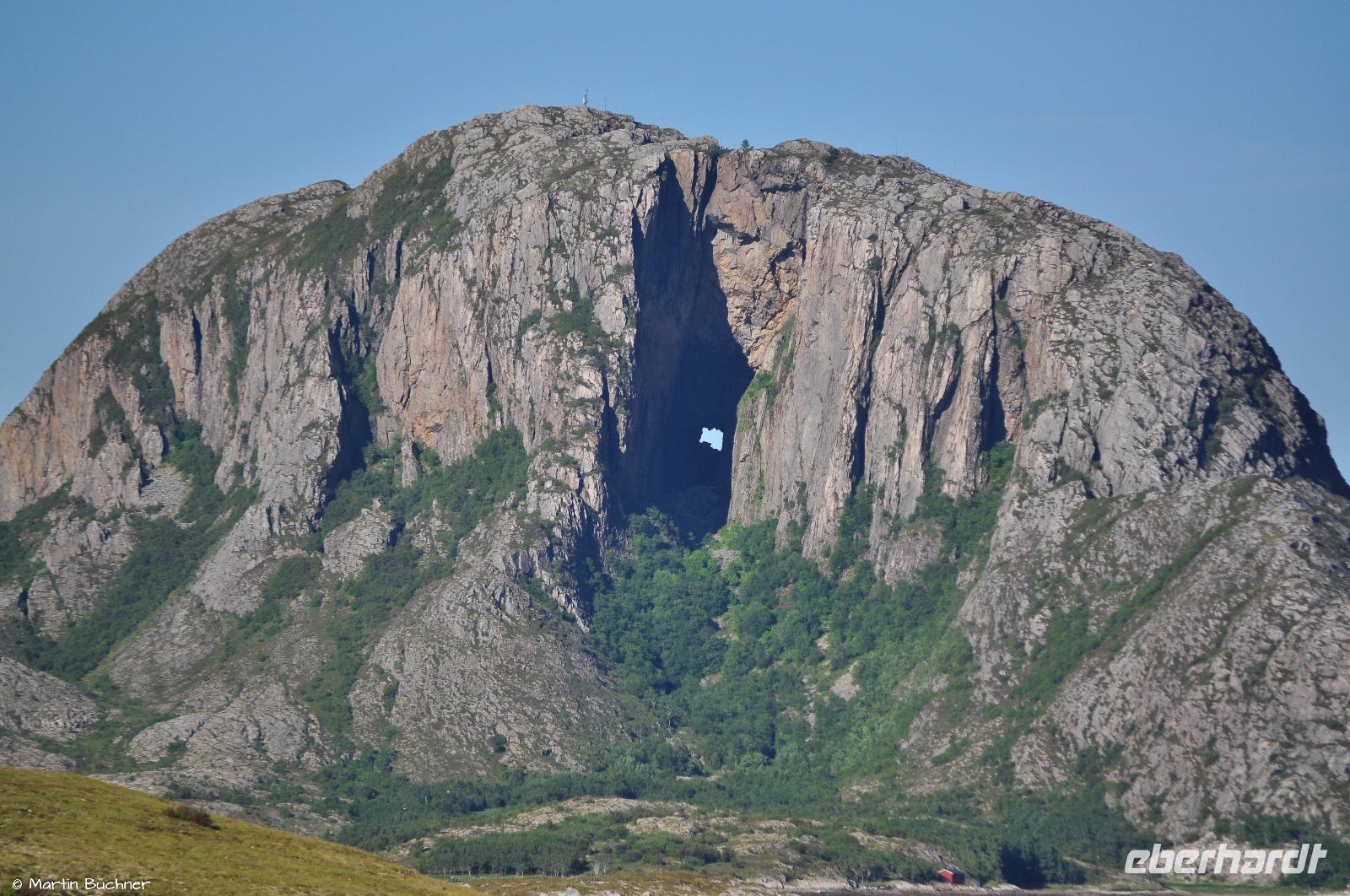 Heutige Höhepunkte die Gebirgskette der Sieben Schwestern und Torghatten, ein Felsen mit einem riesigen Loch. Die M/S Nordnorge fährt traditionell einen Bogen, um das Loch sichtbar zu machen.