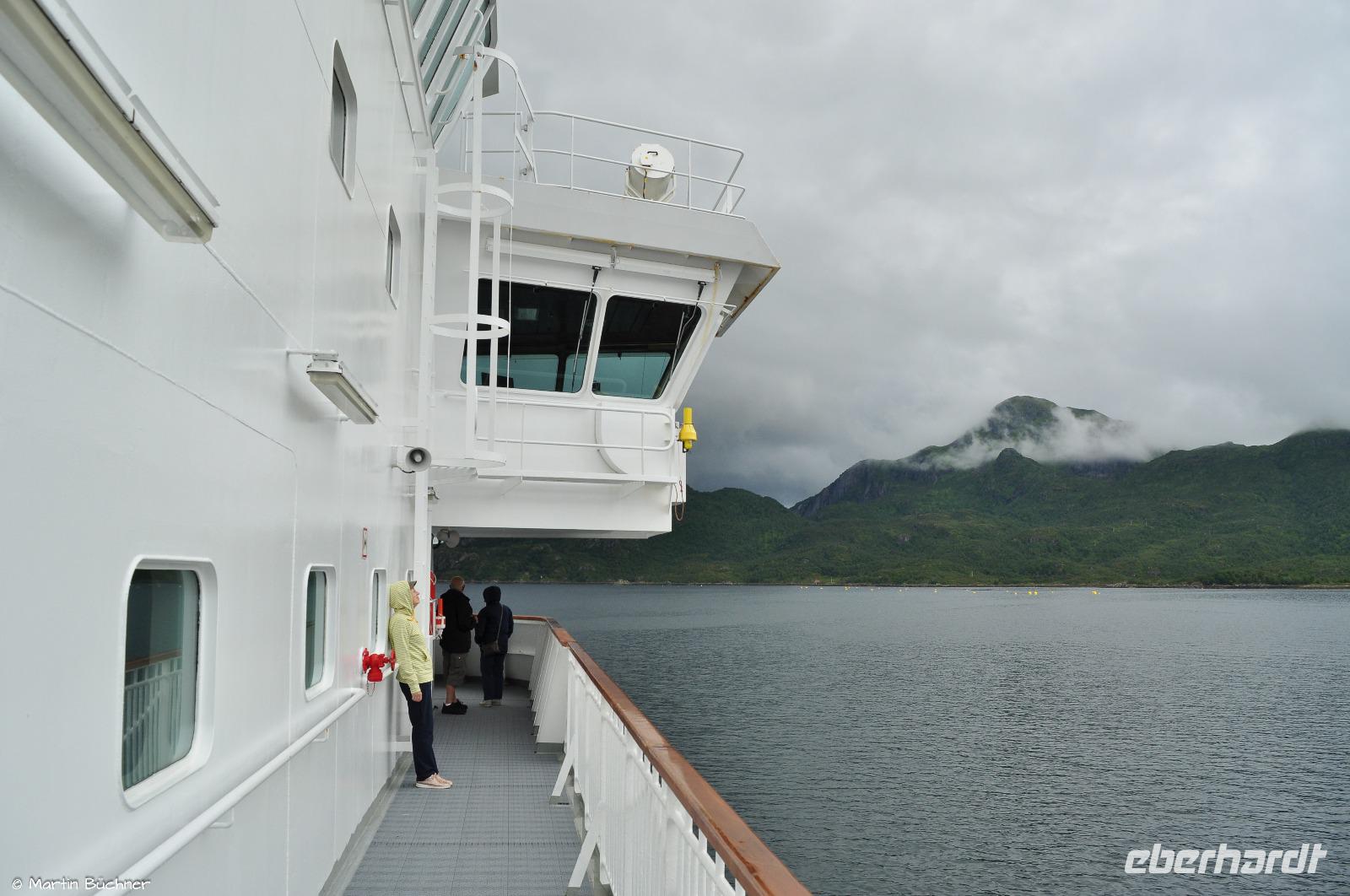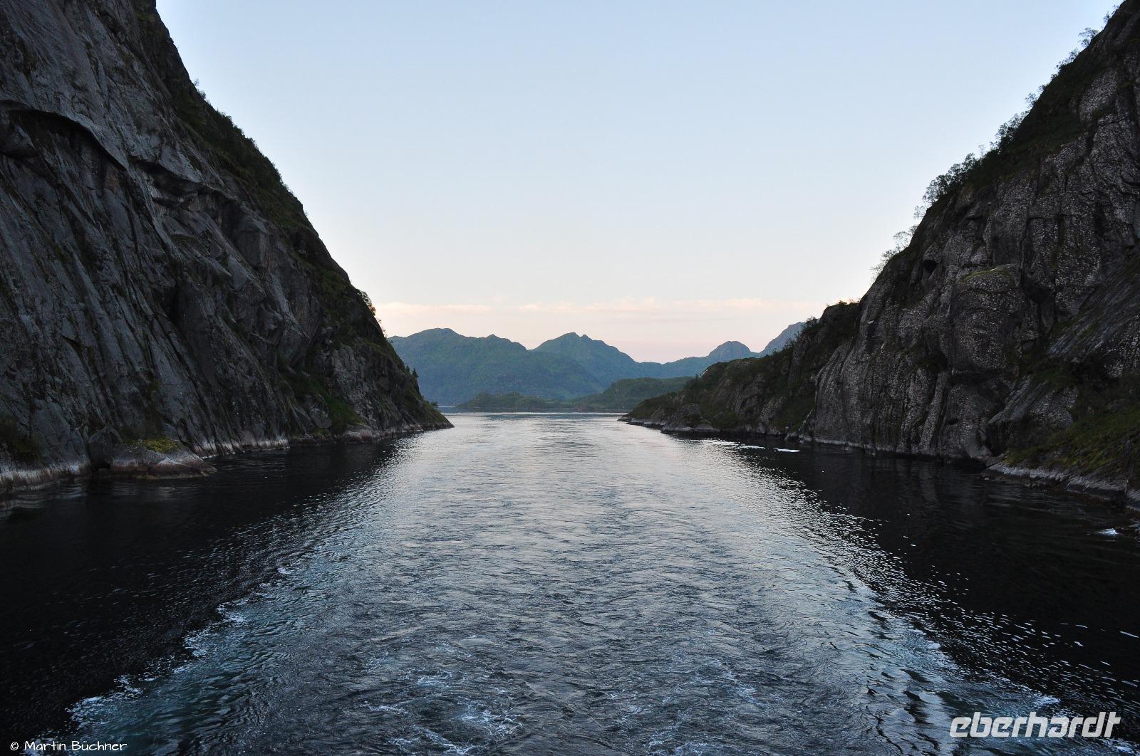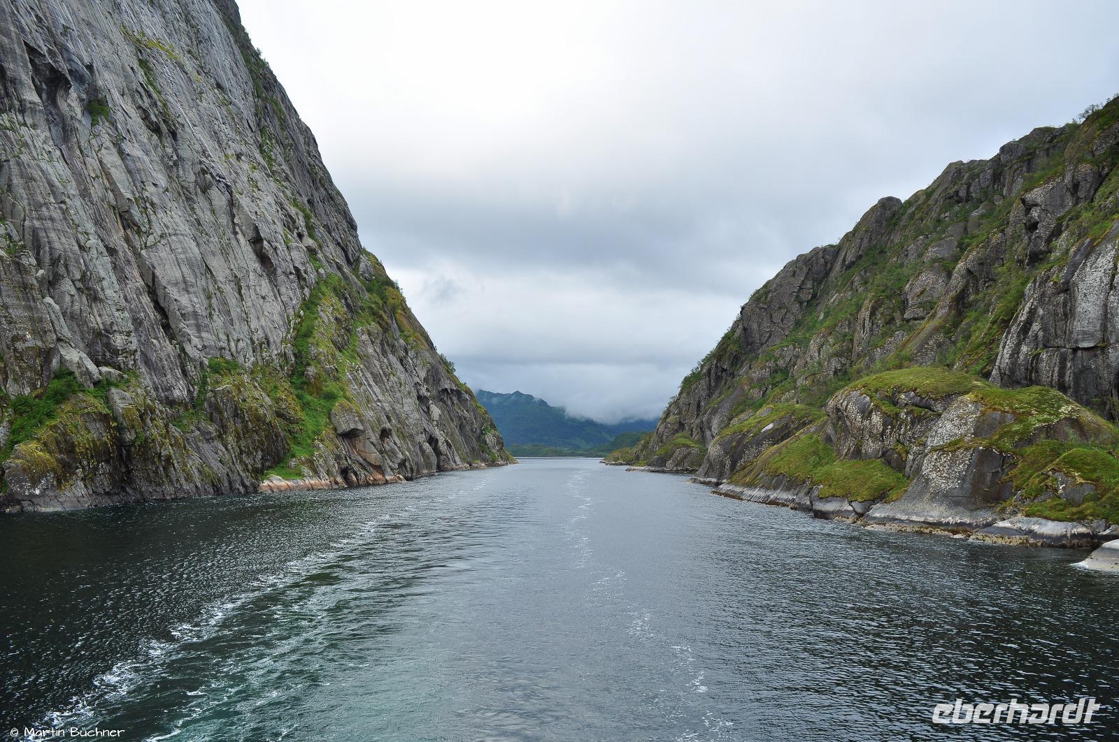 Am Nachmittag durchfahren wir mit dem Stokksund die schmalste Stelle der Hurtigruten (weniger als 50 m Breite). Mehrere spitze Kurven müssen gefahren werden.