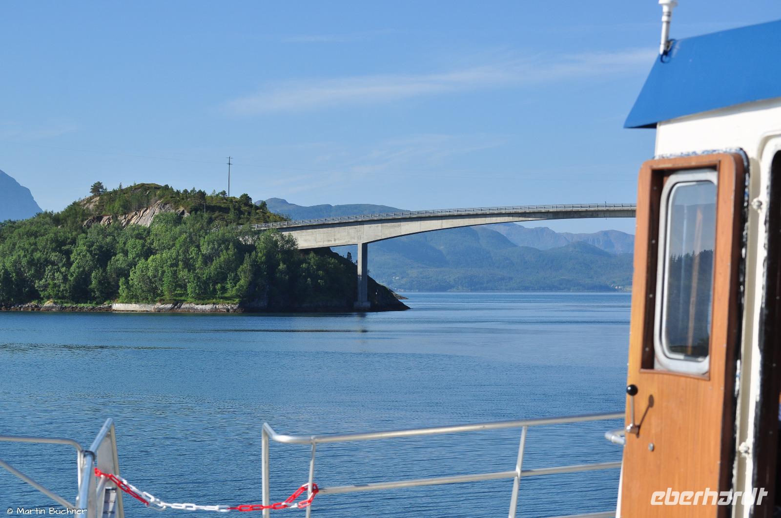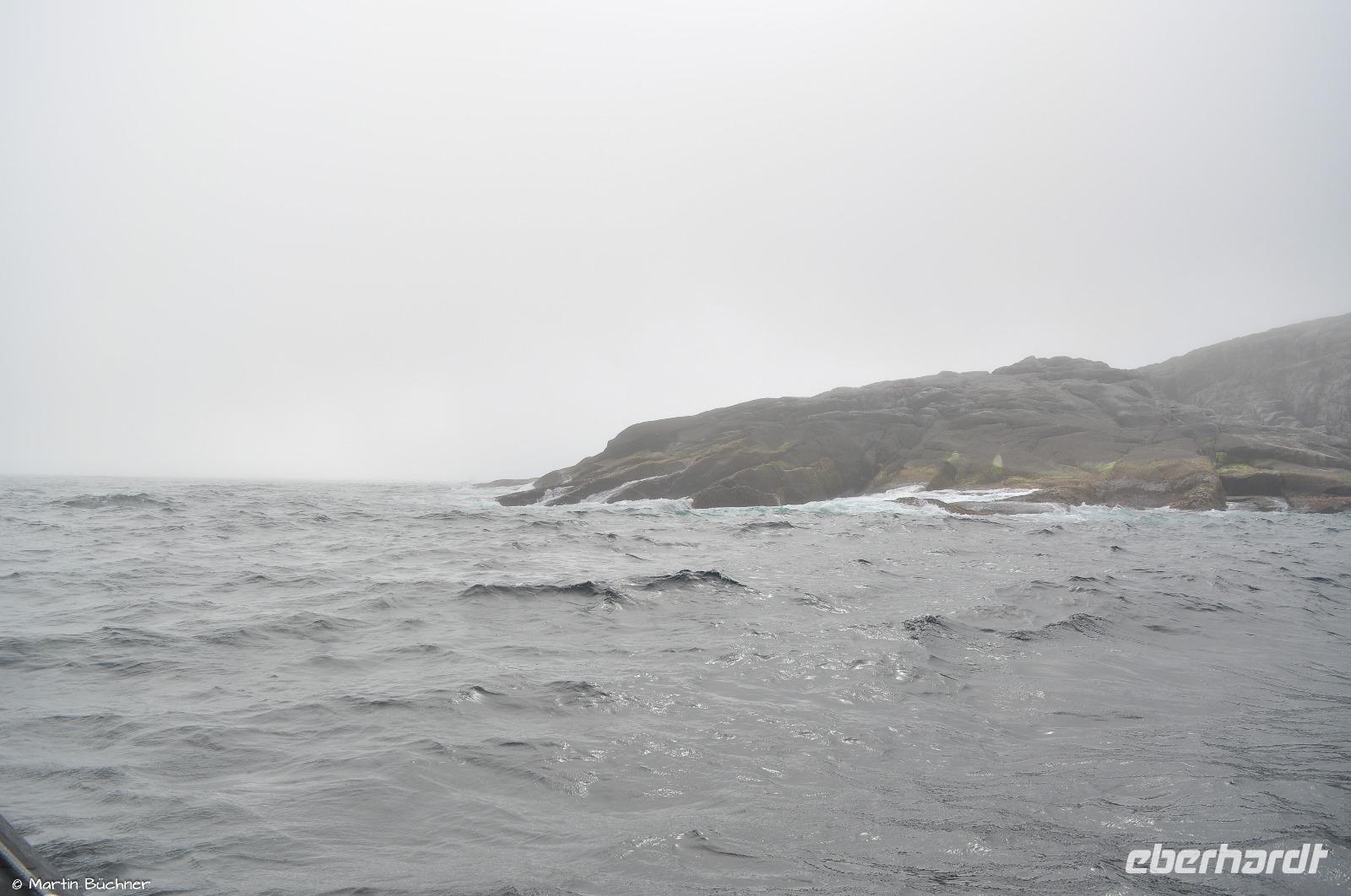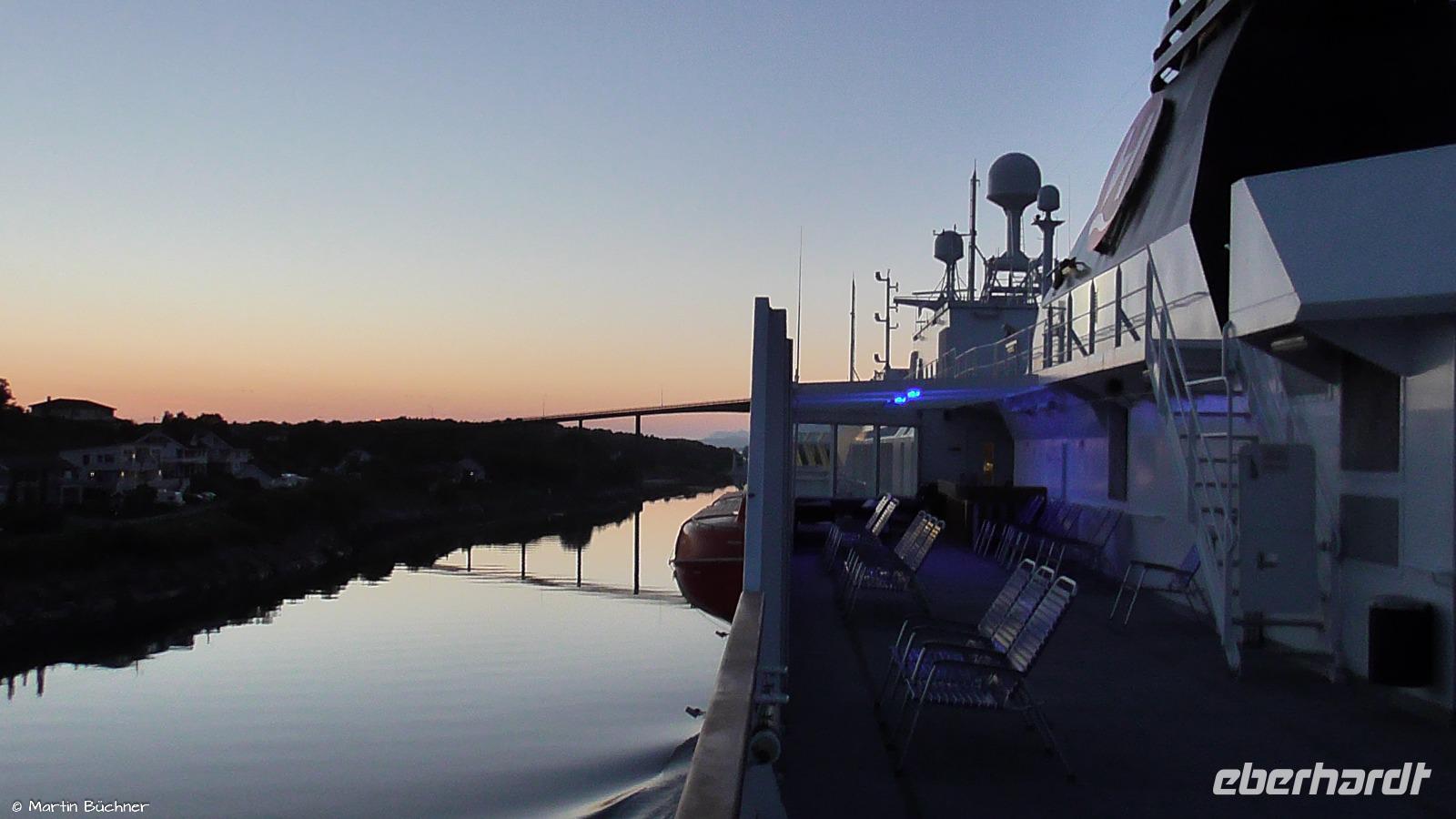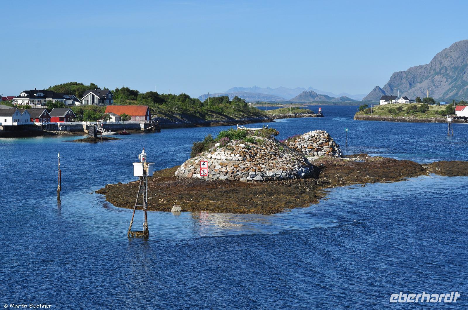 Am Nachmittag durchfahren wir mit dem Stokksund die schmalste Stelle der Hurtigruten (weniger als 50 m Breite). Mehrere spitze Kurven müssen gefahren werden.