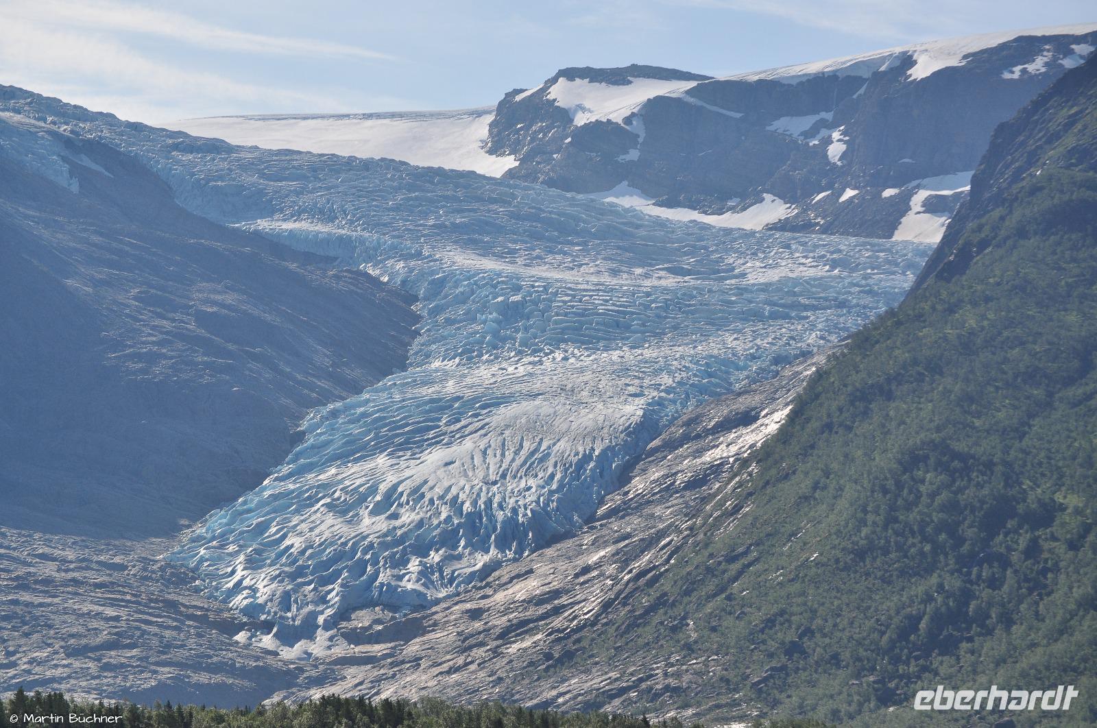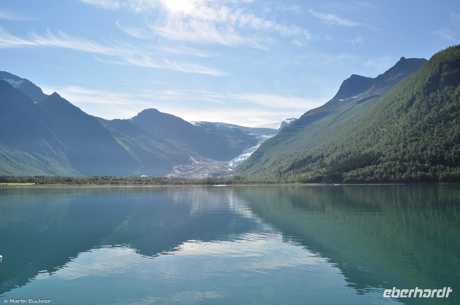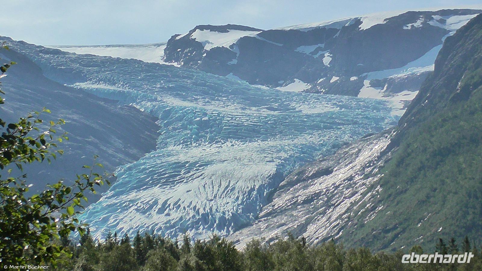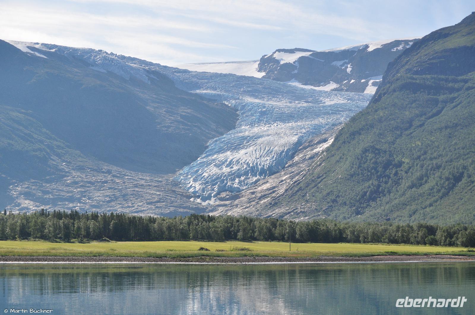 Einige Gäste nehmen am Ausflug zum Svartisen Gletscher teil. Der bekannteste Teil des zweitgrößten Gletschers Norwegens ist der Engabreen. Auch dieser hat sich in den letzten Jahren stark zurückgezogen.