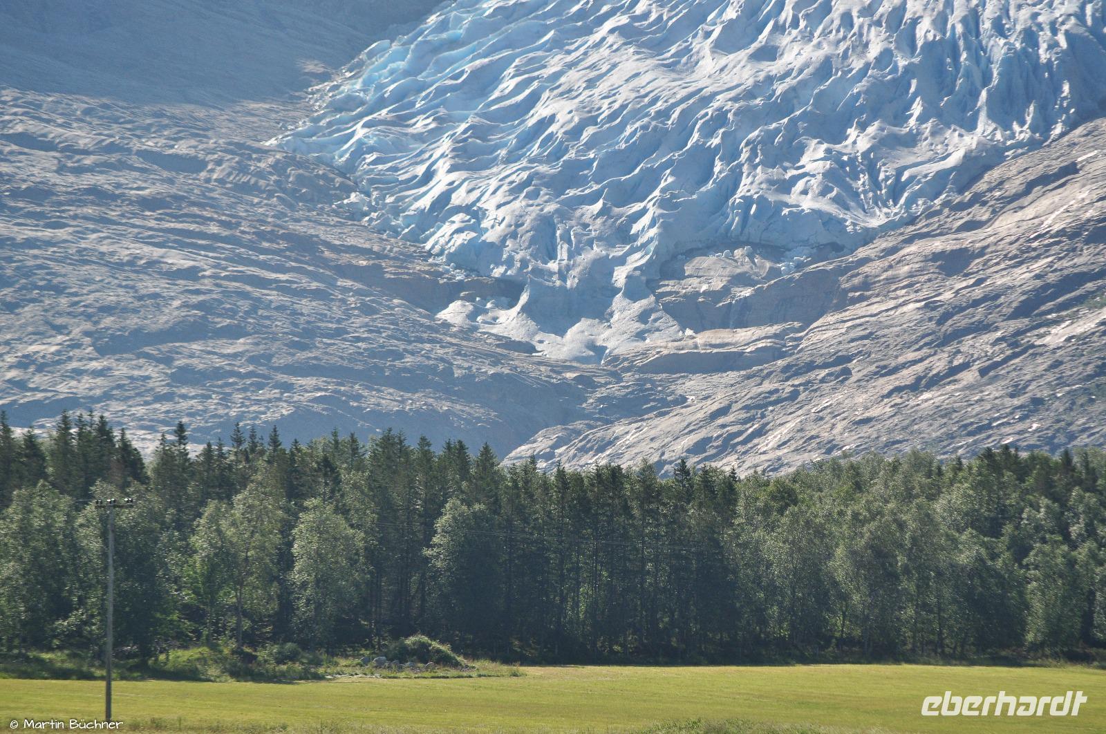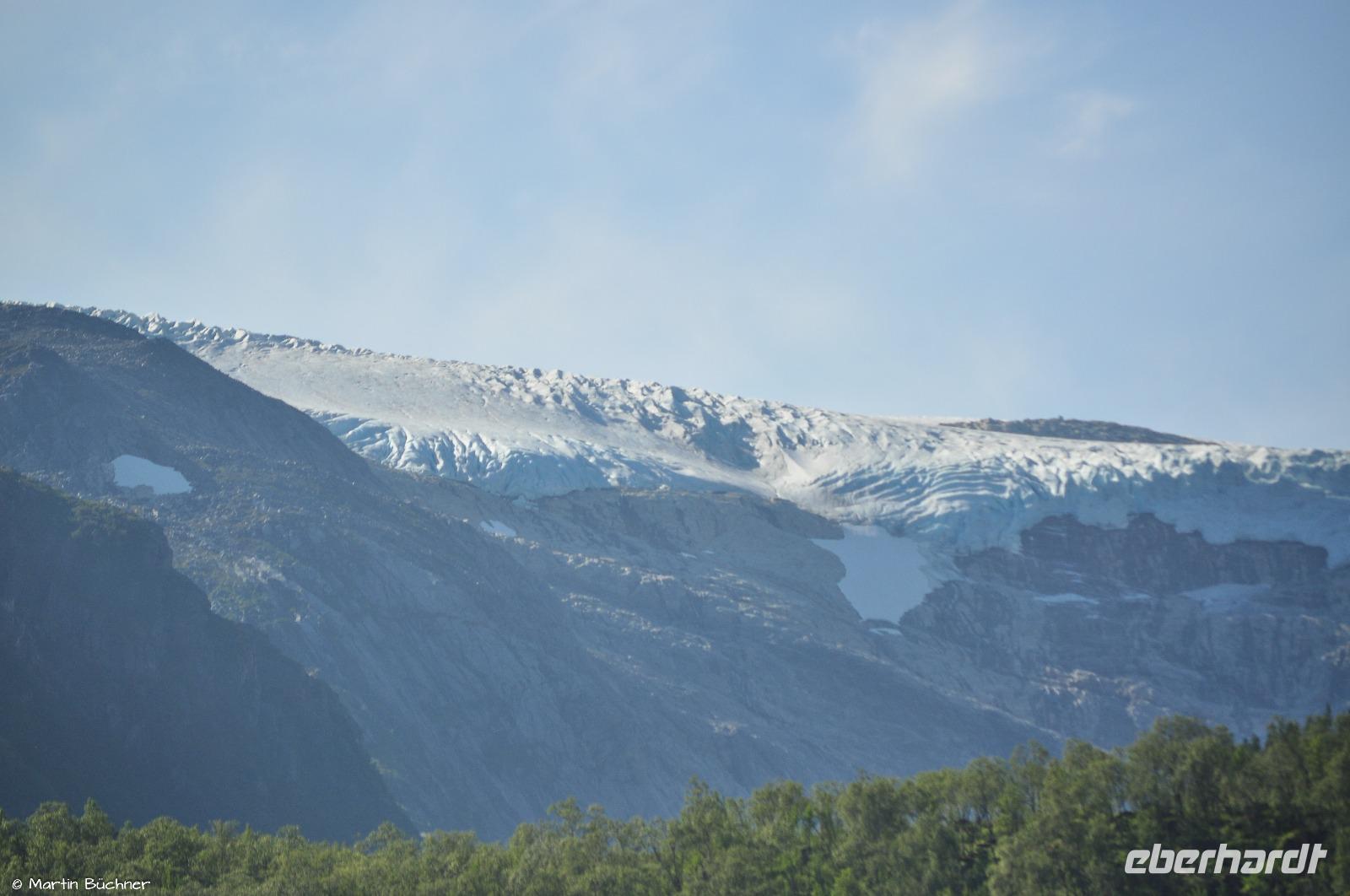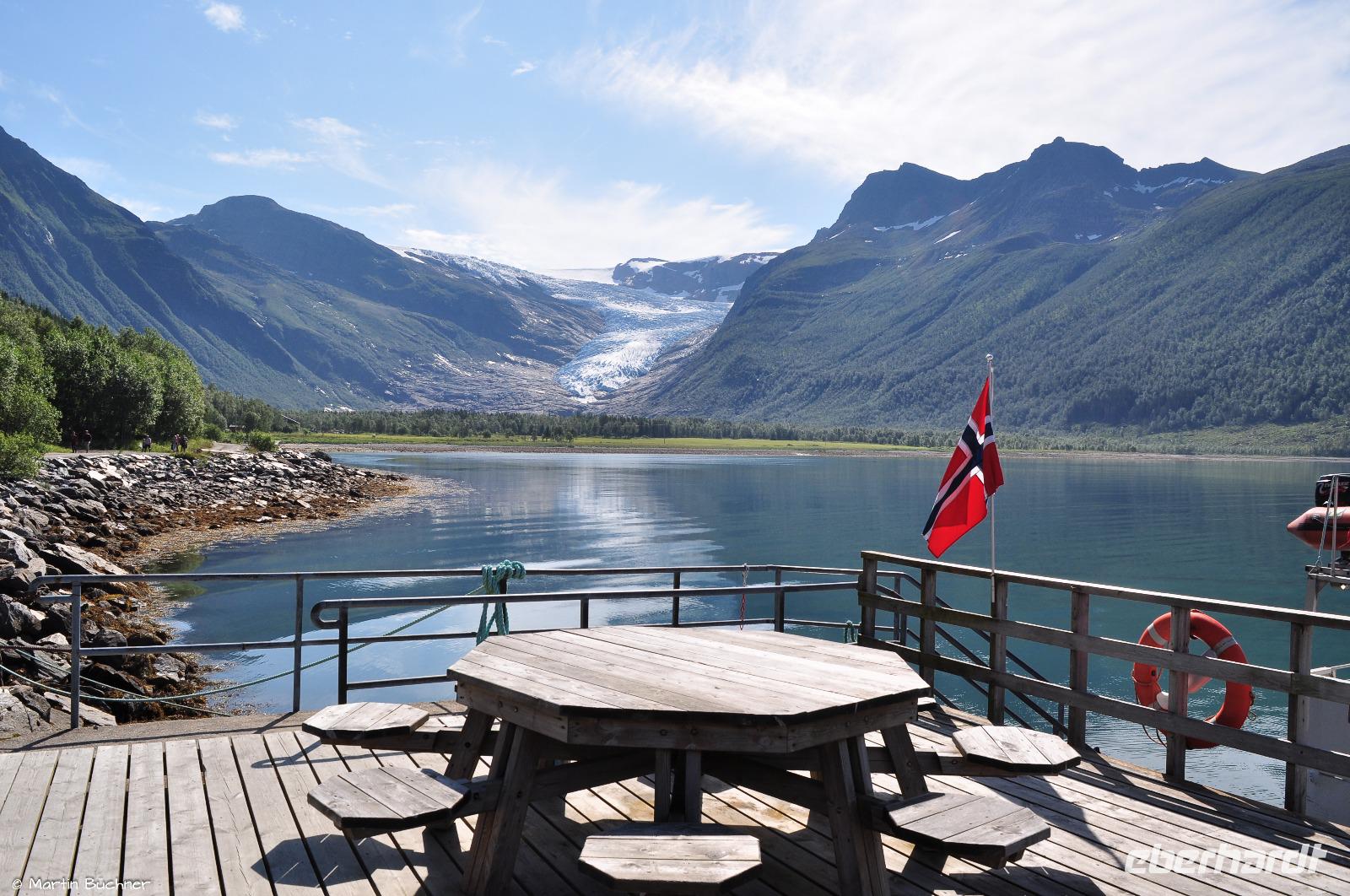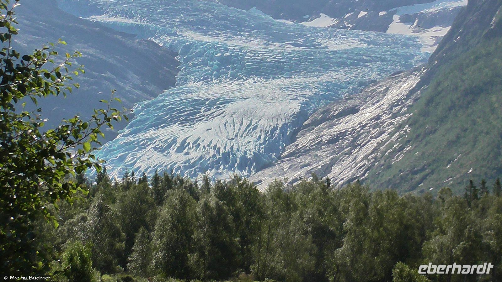Einige Gäste nehmen am Ausflug zum Svartisen Gletscher teil. Der bekannteste Teil des zweitgrößten Gletschers Norwegens ist der Engabreen. Auch dieser hat sich in den letzten Jahren stark zurückgezogen.