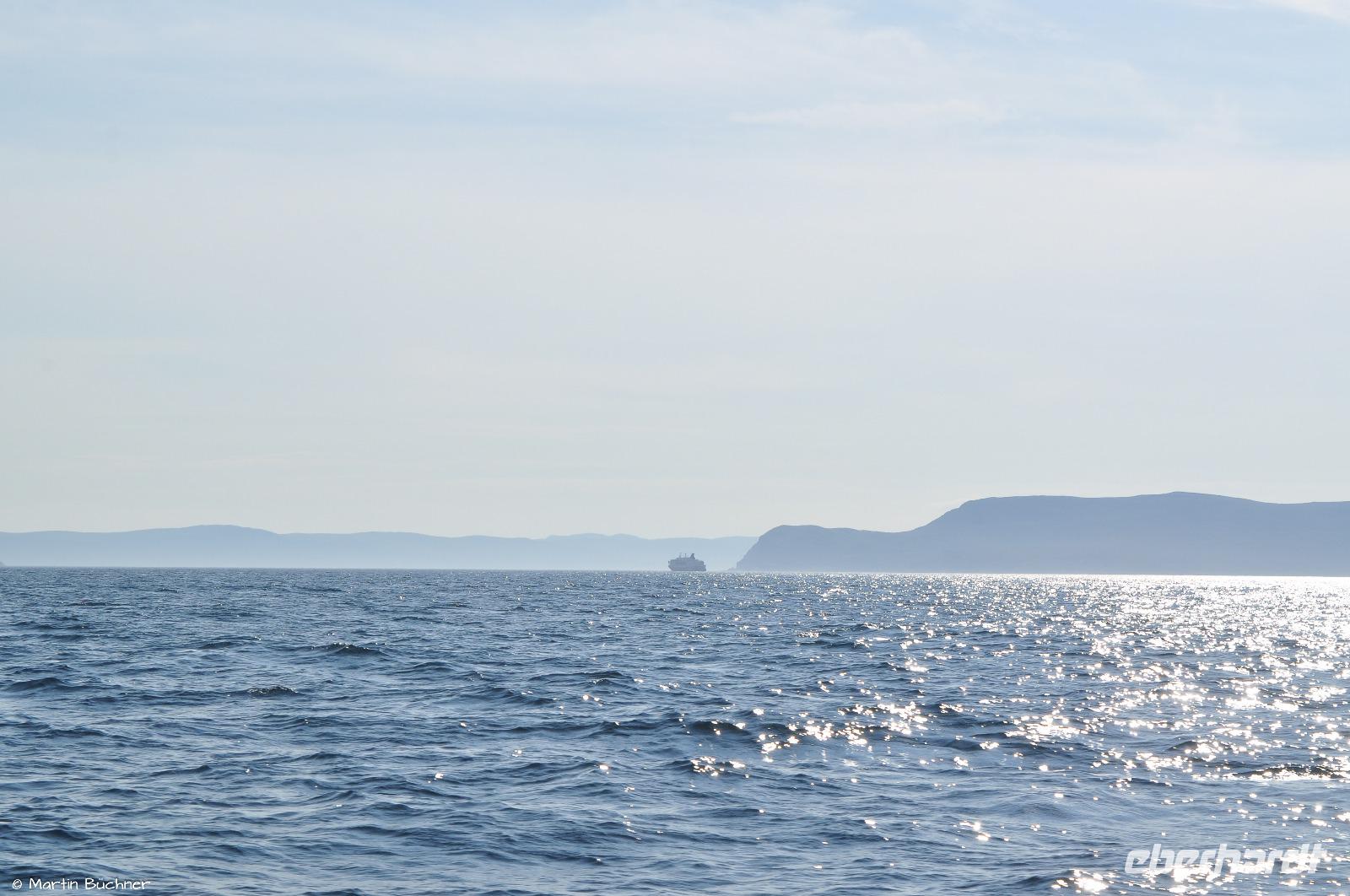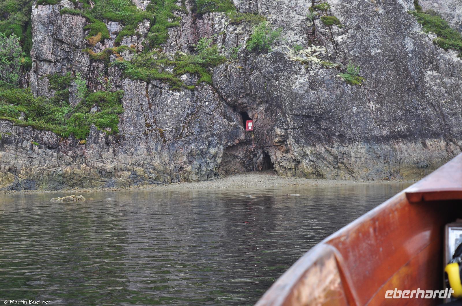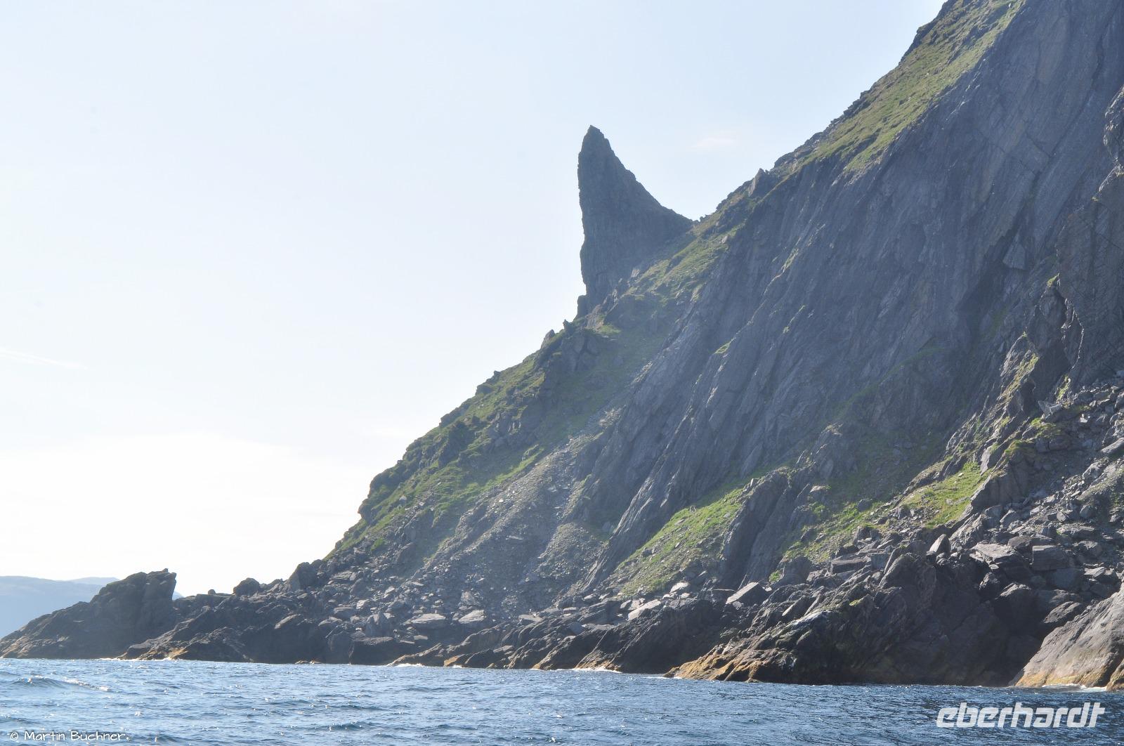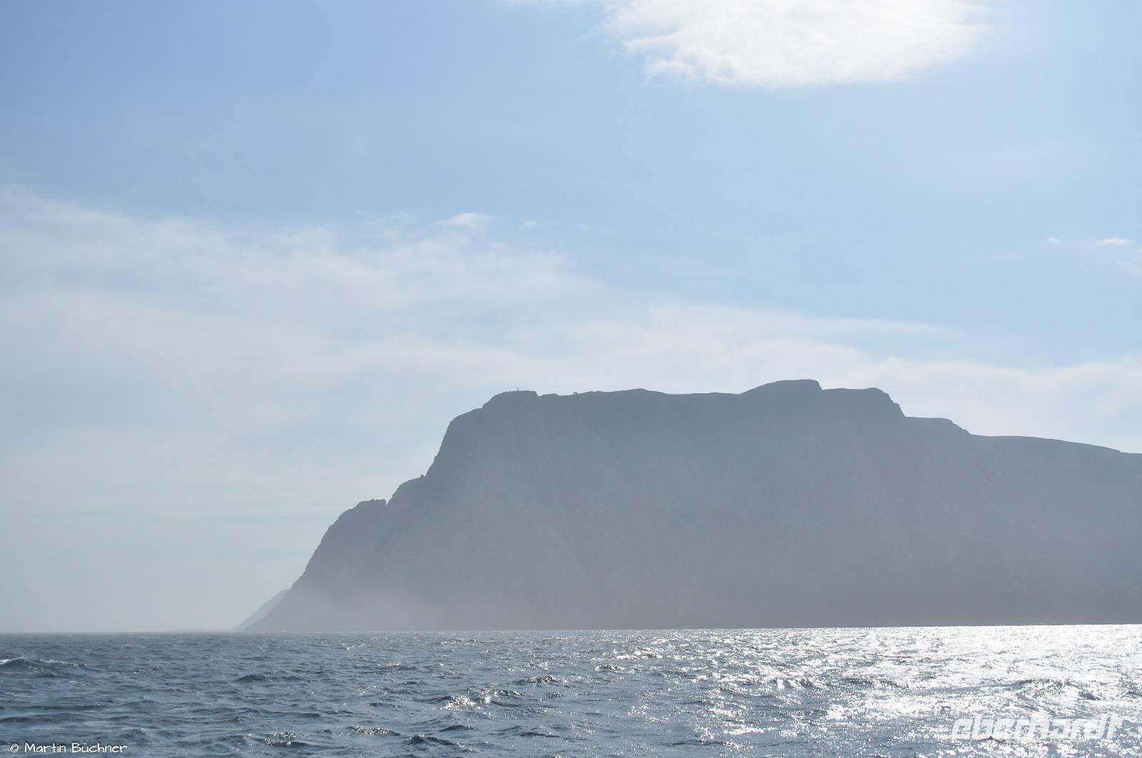 Nach der Rückkehr zum Schiff überqueren wir den Porsangerfjord. Mit der Einfahrt nach Kjöllefjord passieren wir die Finnkirke, eine Felsformation in Form einer kleinen Kirche, ein heiliger Platz für die lokalen Samen.