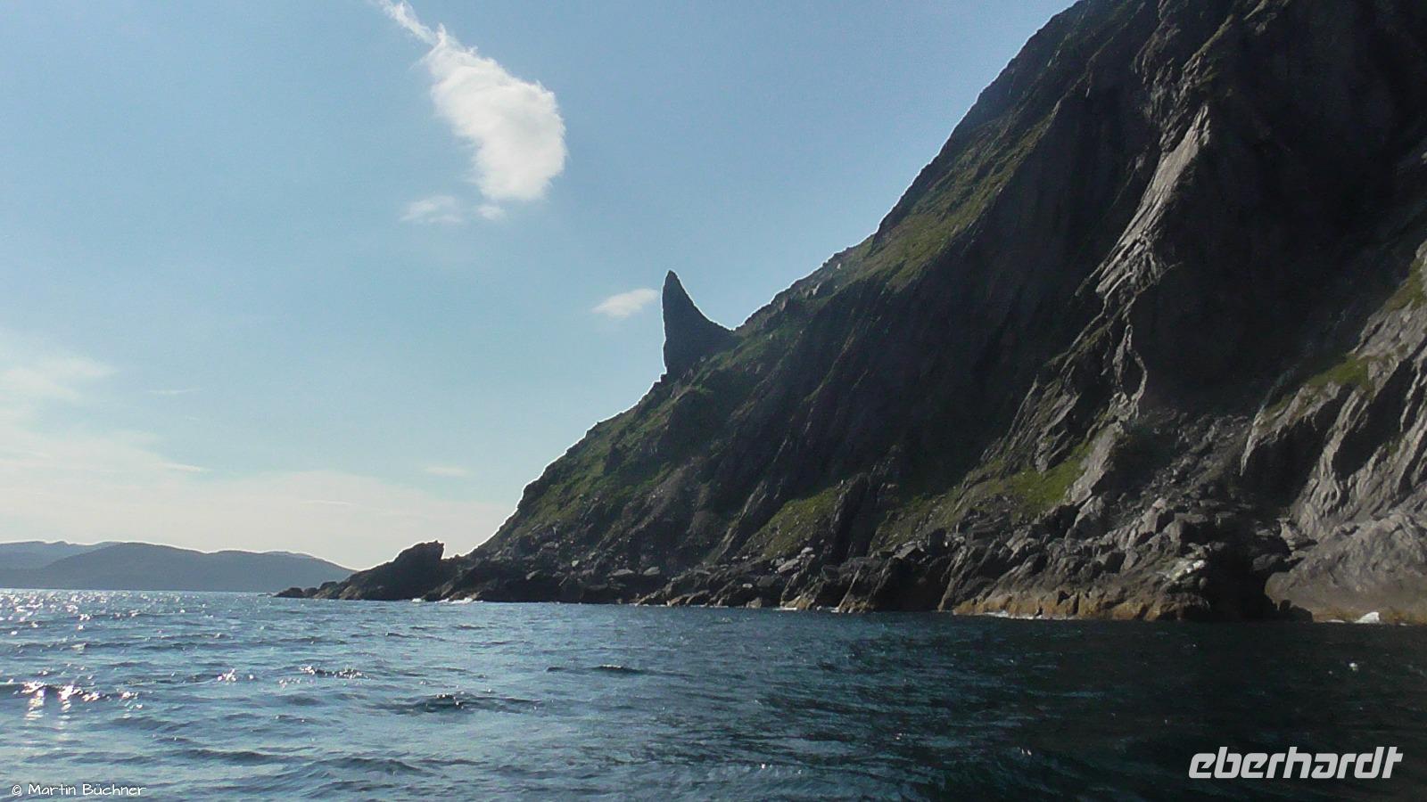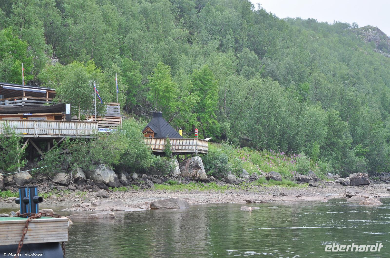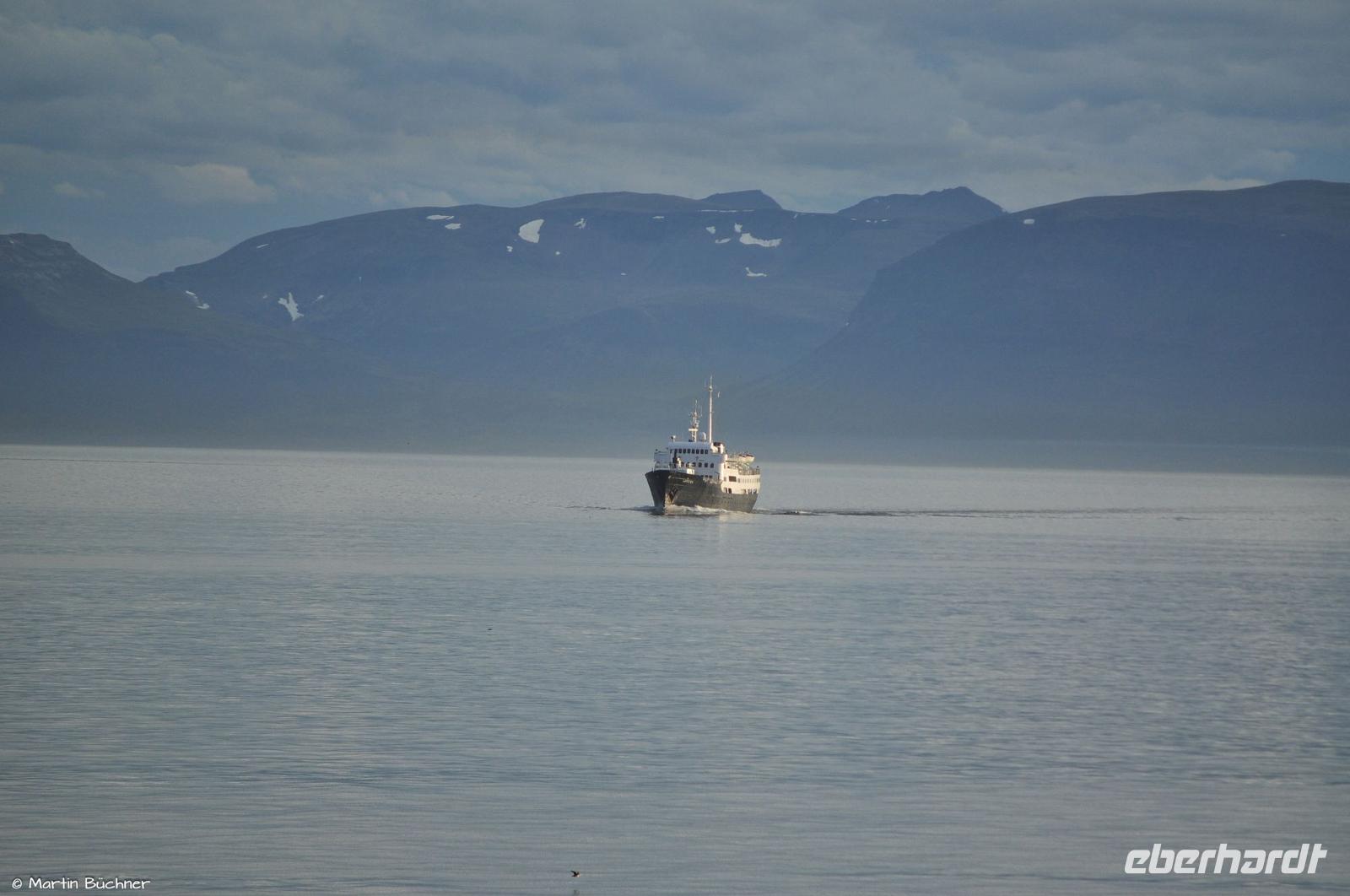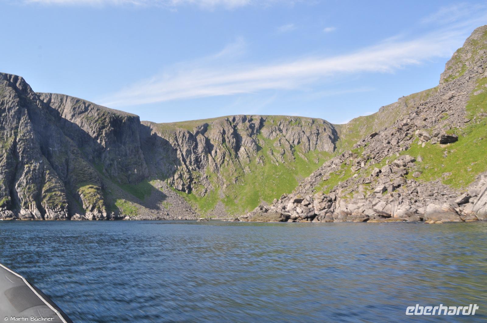 Nach der Rückkehr zum Schiff überqueren wir den Porsangerfjord. Mit der Einfahrt nach Kjöllefjord passieren wir die Finnkirke, eine Felsformation in Form einer kleinen Kirche, ein heiliger Platz für die lokalen Samen.